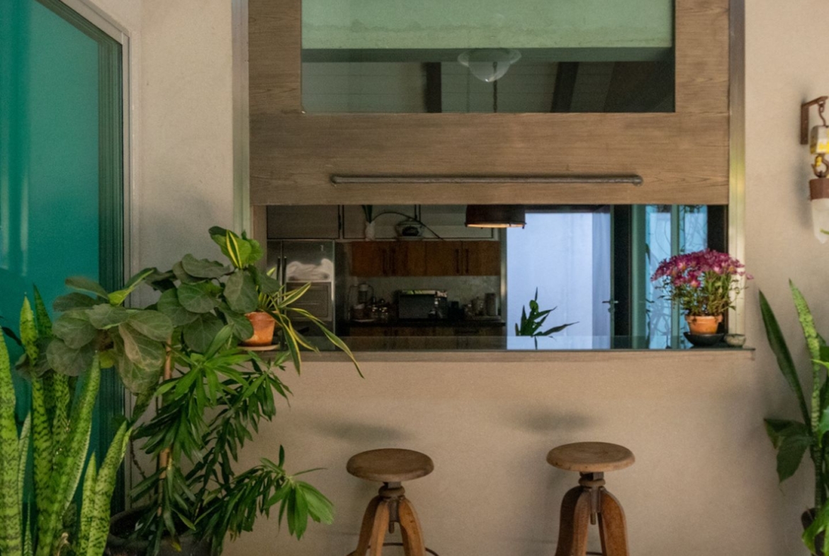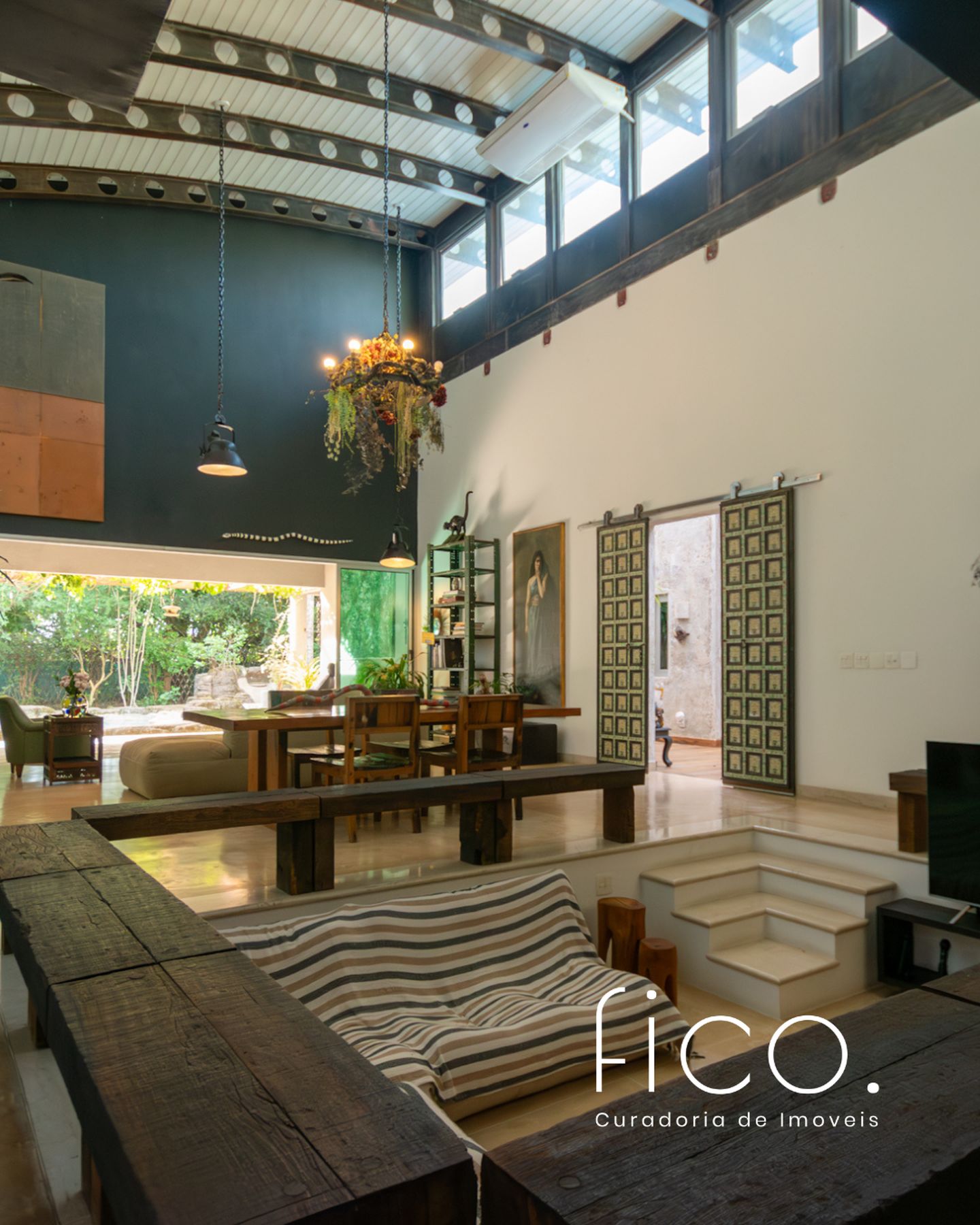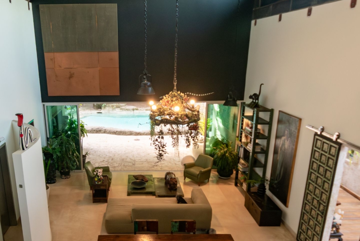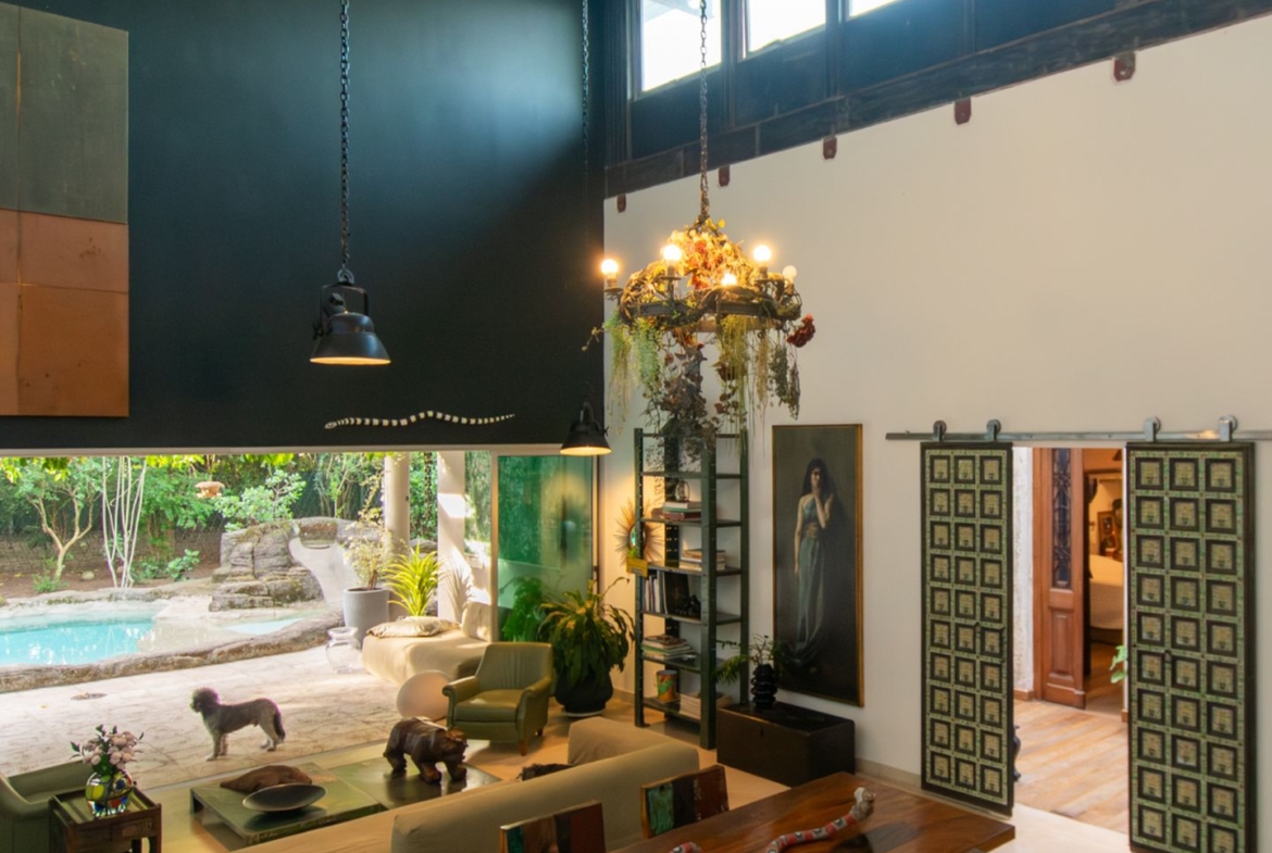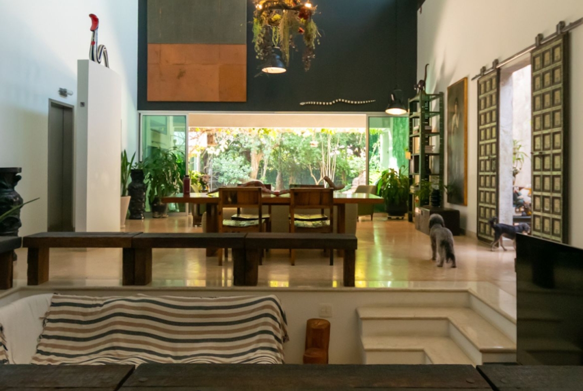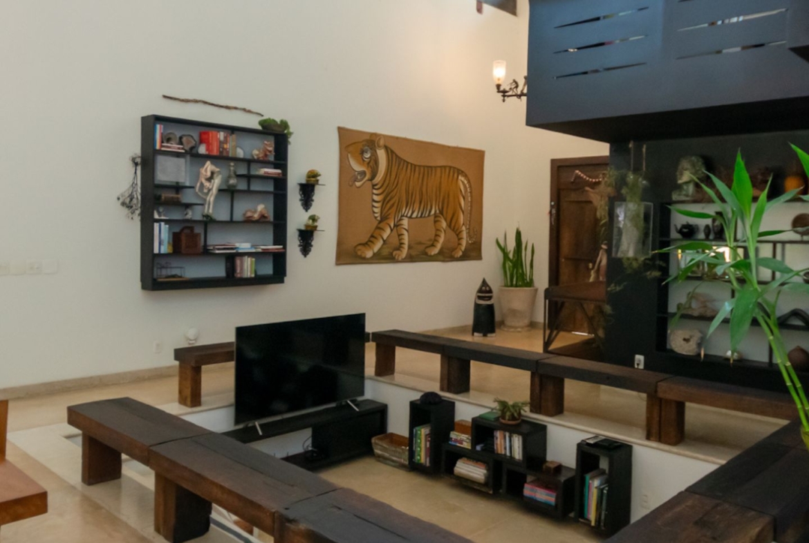 Movida pelo desejo de morar em um galpão, estilo garagem, a casa foi projetada por ela com o uso de vigas metálicas em arco, trazendo movimento e ritmo à cobertura da sala, que surpreende com um lindo piso em grandes placas de cimento e pó de mármore, em uma tonalidade criada especialmente para este espaço. Com uma referência afetiva, há um rebaixo no piso, configurando uma aconchegante sala de TV, cercada por bancos feitos de dormentes de linhas de trem. O espaço compreende grandes dimensões em todos os sentidos. É atendido por dois potentes aparelhos de ar condicionado tipo split e por um lavabo em azulejos espanhóis que é um caso de amor de tão lindo!