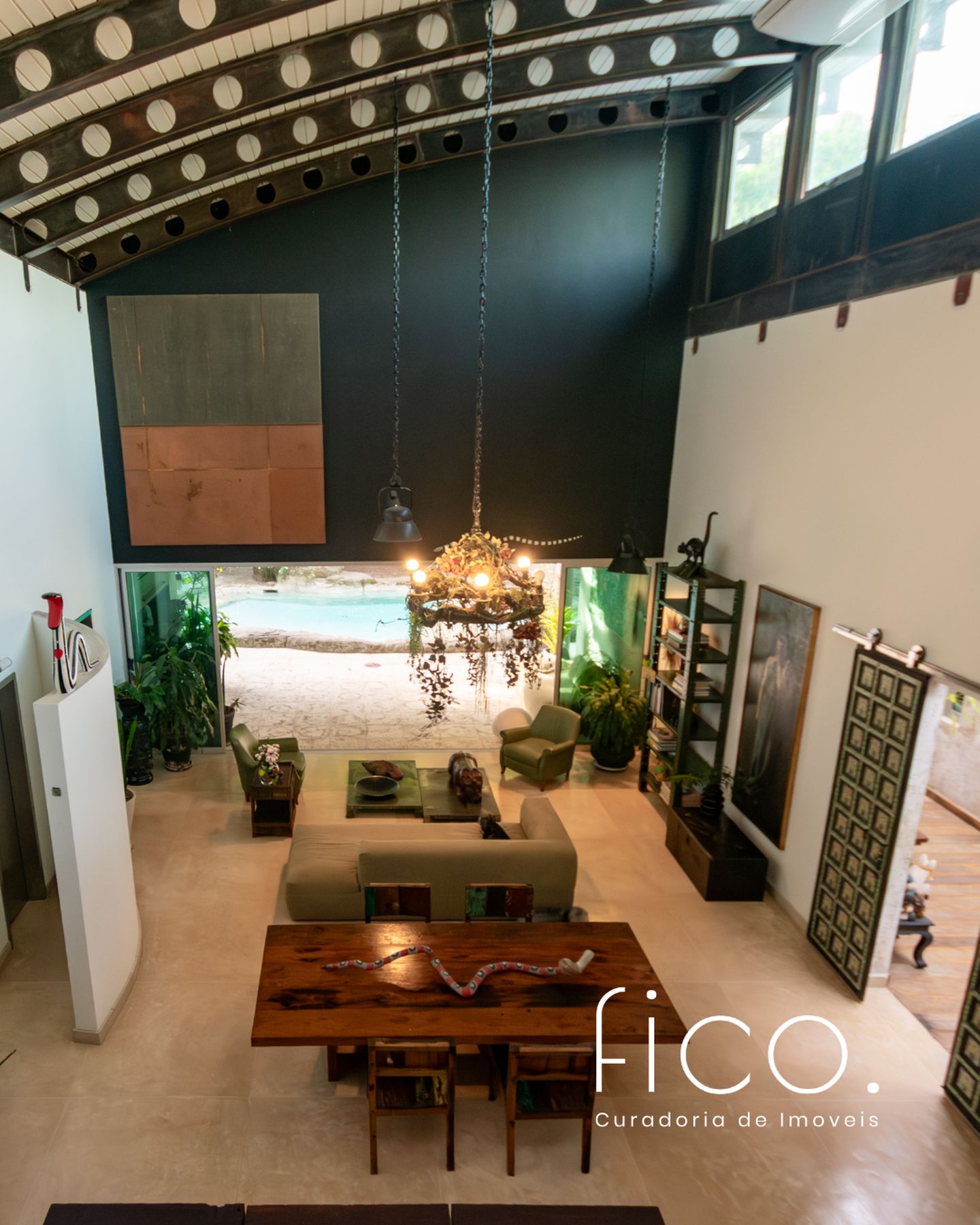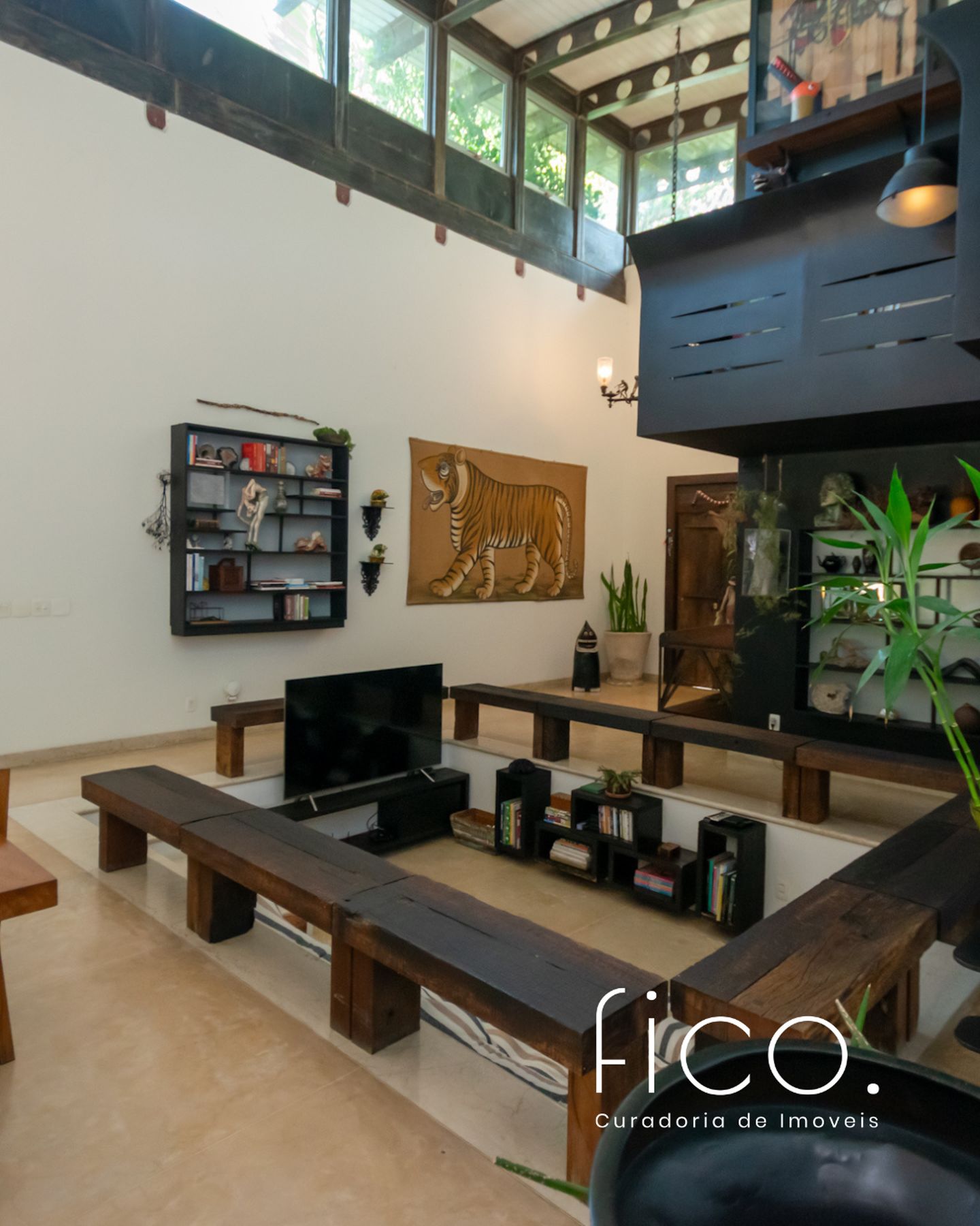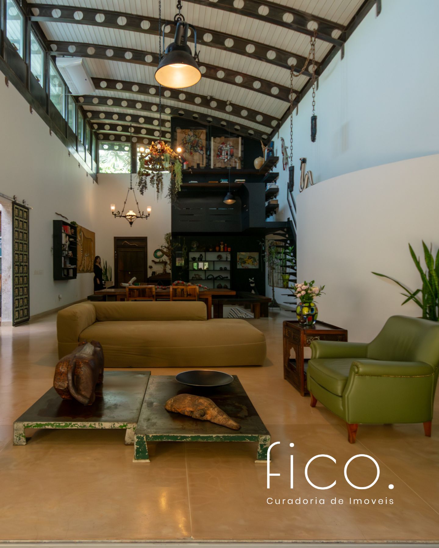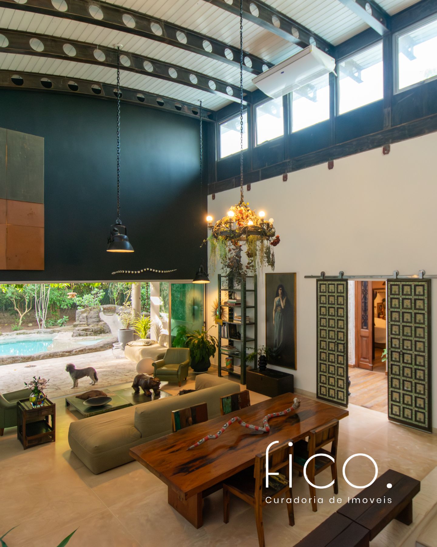 Movida pelo desejo de morar em um galpão, estilo garagem, a casa foi projetada por ela com o uso de vigas metálicas em arco, trazendo movimento e ritmo à cobertura da sala, que surpreende com um lindo piso em grandes placas de cimento e pó de mármore, em uma tonalidade criada especialmente para este espaço. Com uma referência afetiva, há um rebaixo no piso, configurando uma aconchegante sala de TV, cercada por bancos feitos de dormentes de linhas de trem. O espaço compreende grandes dimensões em todos os sentidos. É atendido por dois potentes aparelhos de ar condicionado tipo split e por um lavabo em azulejos espanhóis que é um caso de amor de tão lindo!