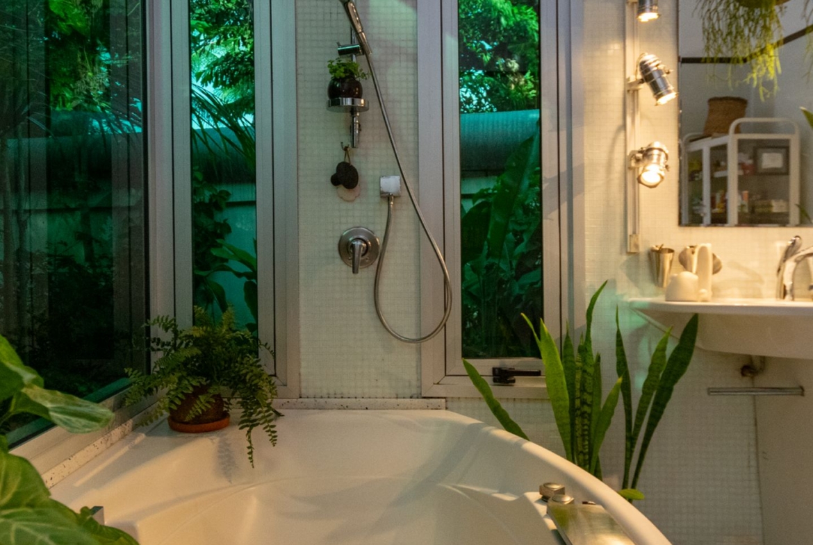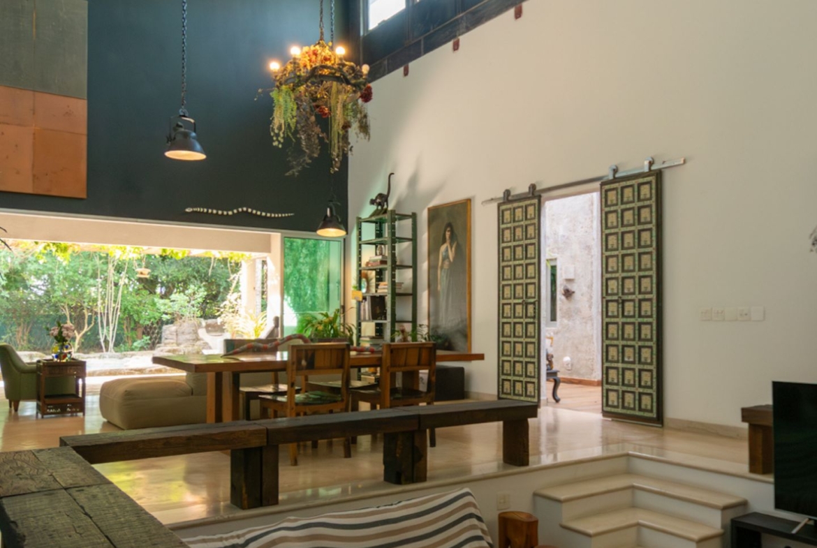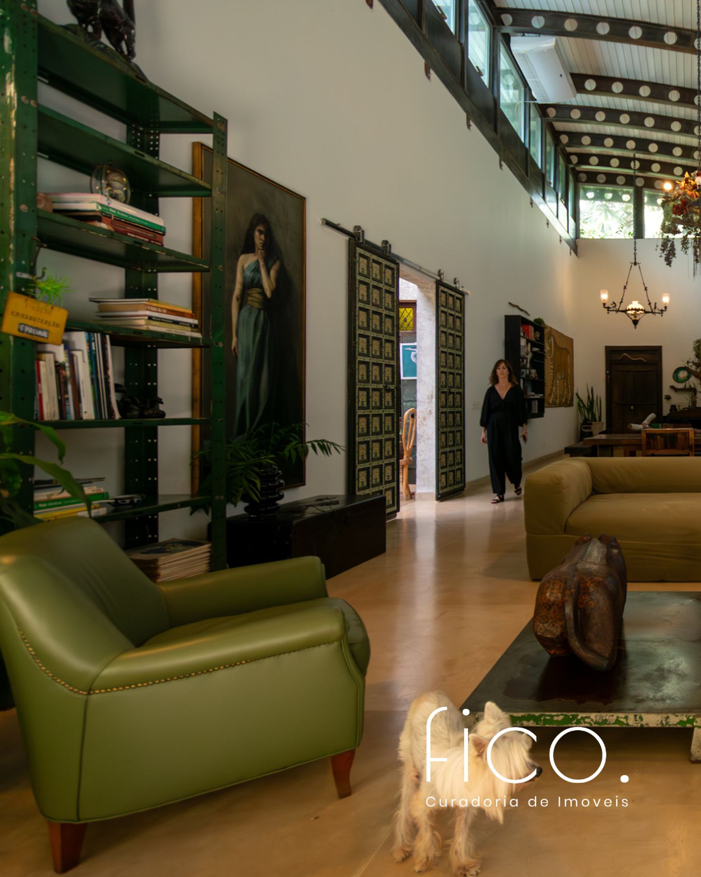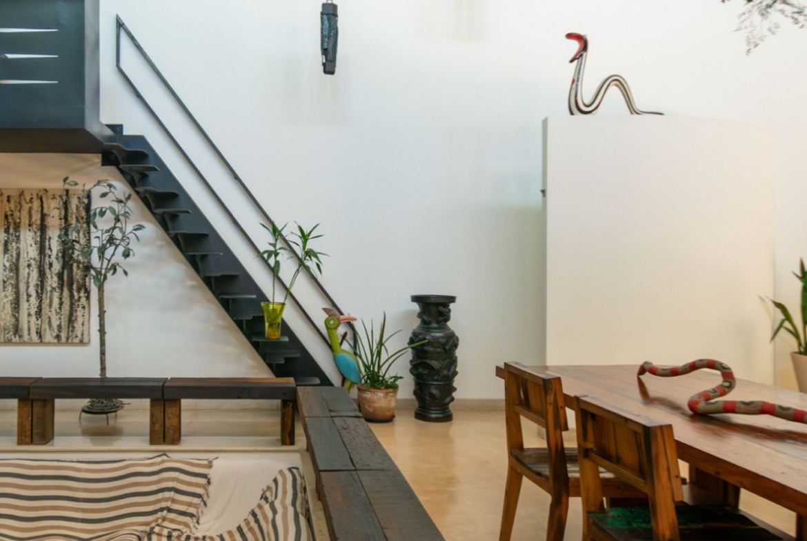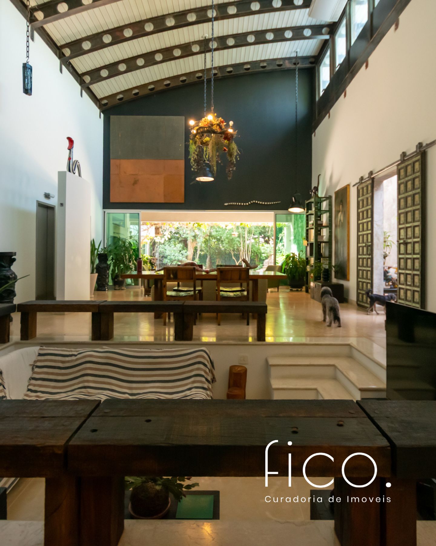 Movida pelo desejo de morar em um galpão, estilo garagem, a casa foi projetada por ela com o uso de vigas metálicas em arco, trazendo movimento e ritmo à cobertura da sala, que surpreende com um lindo piso em grandes placas de cimento e pó de mármore, em uma tonalidade criada especialmente para este espaço. Com uma referência afetiva, há um rebaixo no piso, configurando uma aconchegante sala de TV, cercada por bancos feitos de dormentes de linhas de trem. O espaço compreende grandes dimensões em todos os sentidos. É atendido por dois potentes aparelhos de ar condicionado tipo split e por um lavabo em azulejos espanhóis que é um caso de amor de tão lindo!