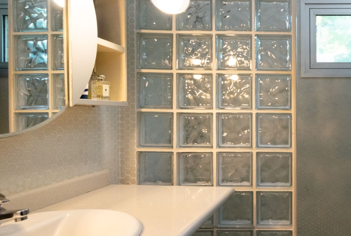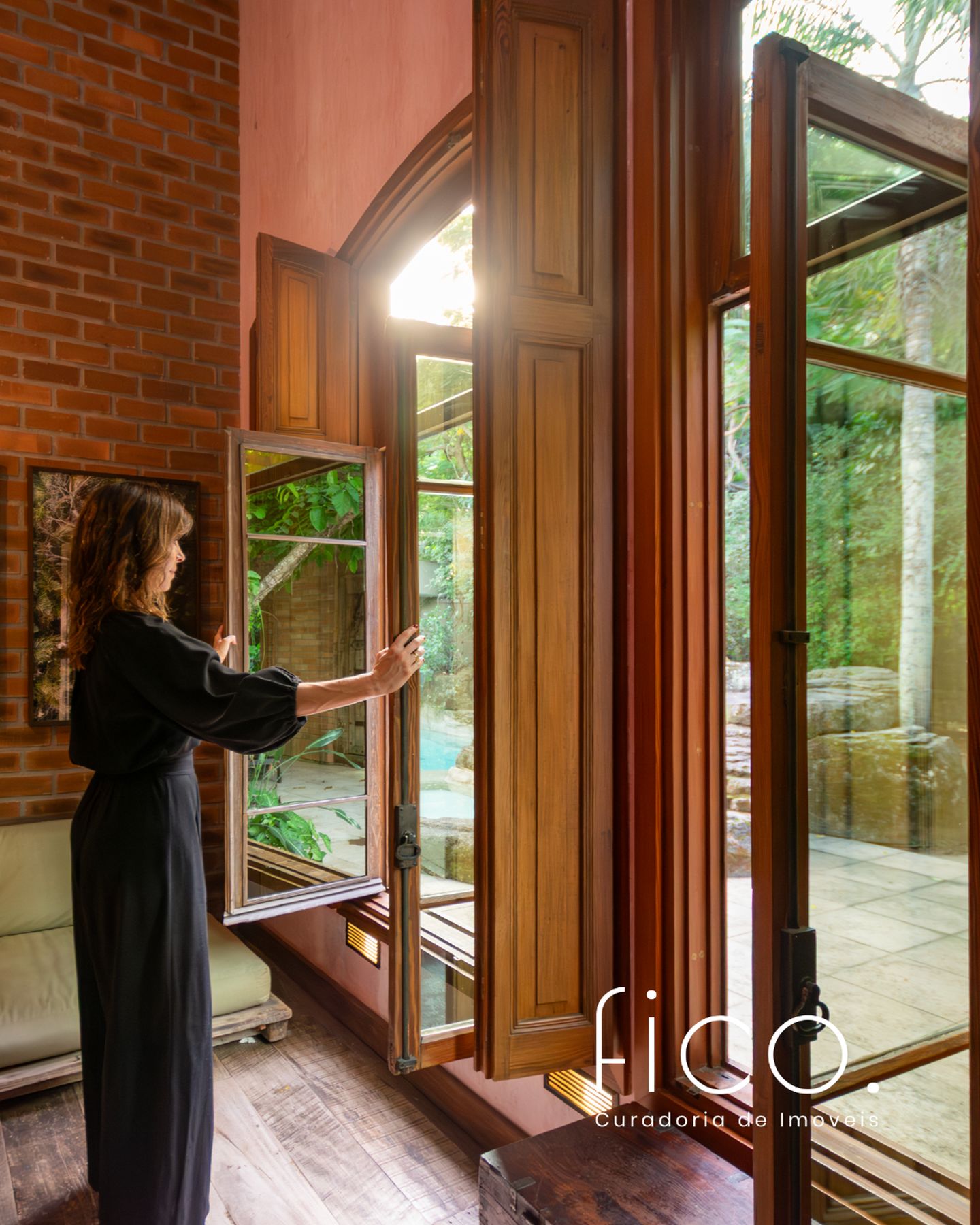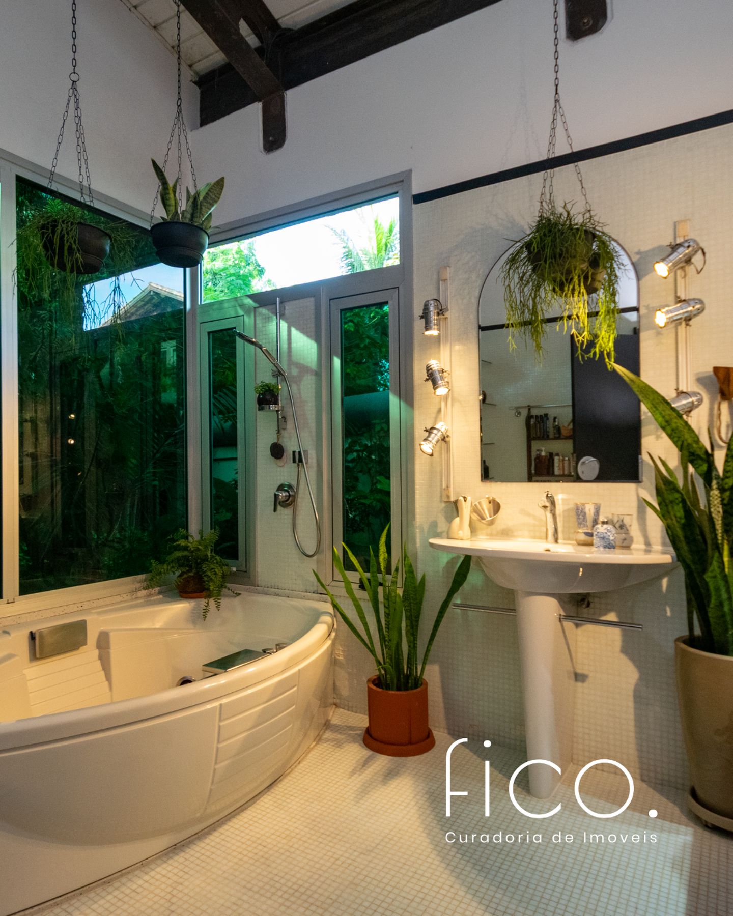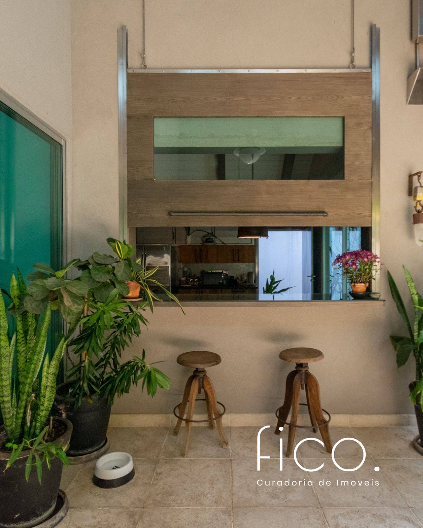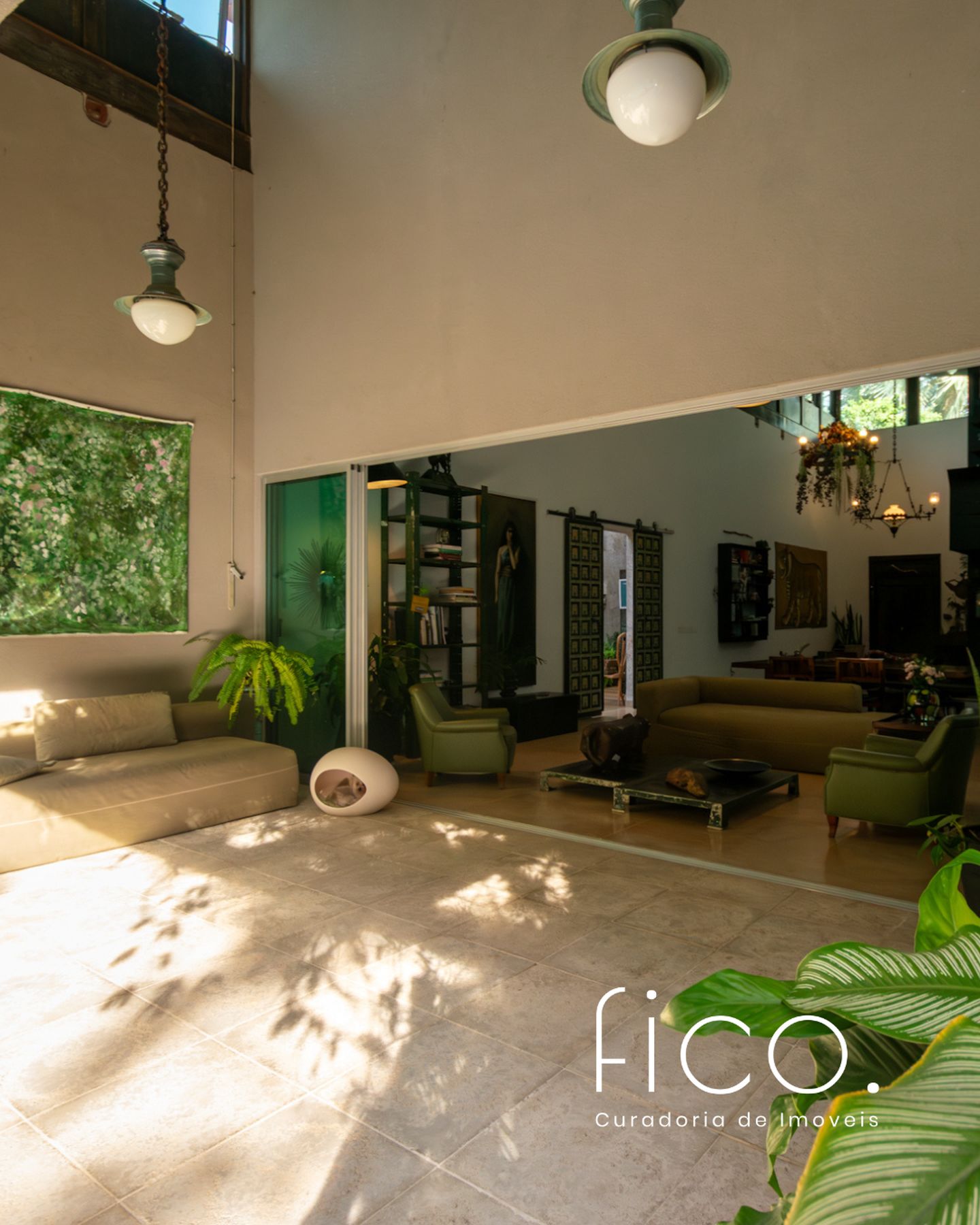 Movida pelo desejo de morar em um galpão, estilo garagem, a casa foi projetada por ela com o uso de vigas metálicas em arco, trazendo movimento e ritmo à cobertura da sala, que surpreende com um lindo piso em grandes placas de cimento e pó de mármore, em uma tonalidade criada especialmente para este espaço. Com uma referência afetiva, há um rebaixo no piso, configurando uma aconchegante sala de TV, cercada por bancos feitos de dormentes de linhas de trem. O espaço compreende grandes dimensões em todos os sentidos. É atendido por dois potentes aparelhos de ar condicionado tipo split e por um lavabo em azulejos espanhóis que é um caso de amor de tão lindo!