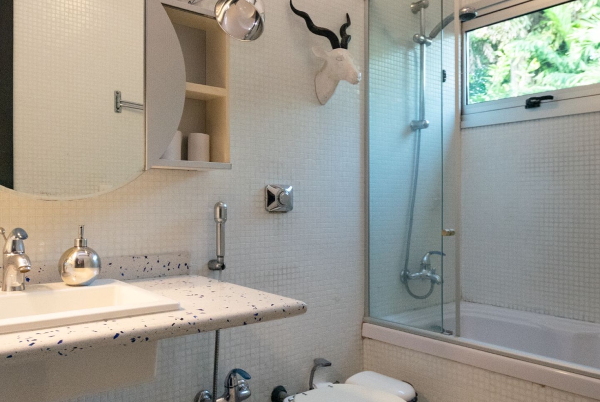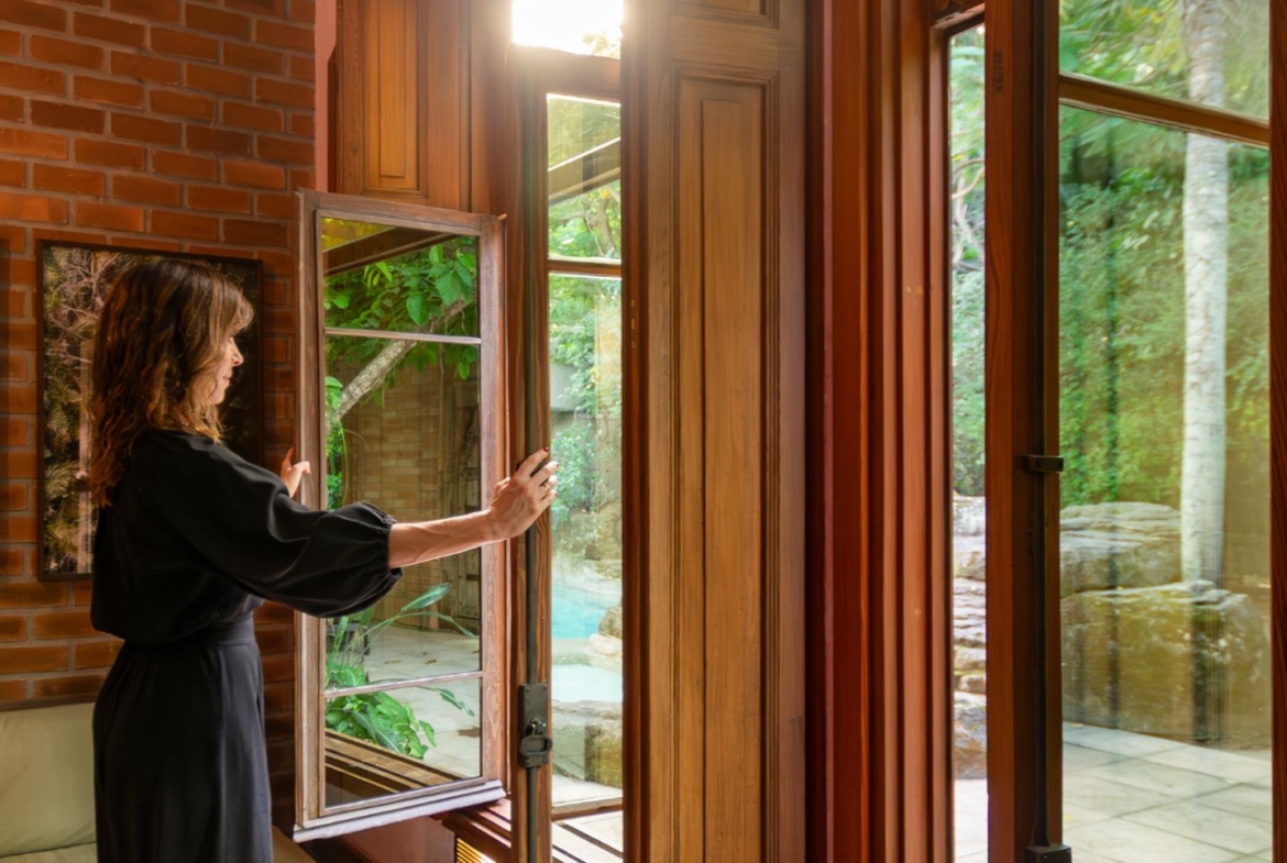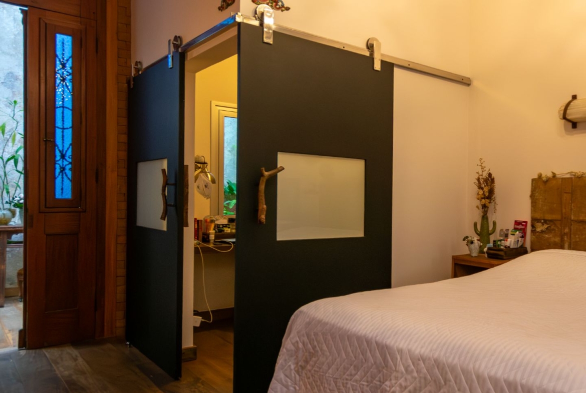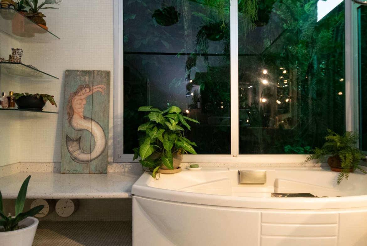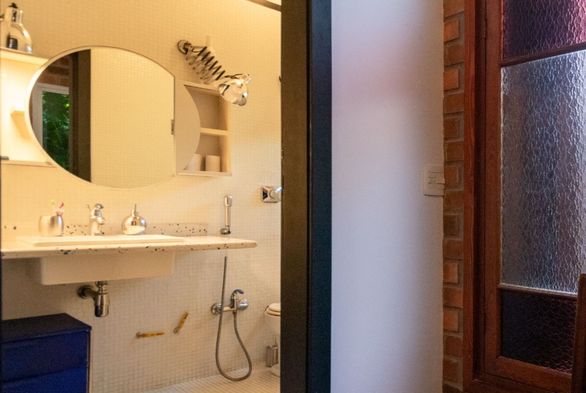 A área íntima remete a uma vila italiana, acessada por uma porta que veio da Índia e é uma obra de arte! Aliás, as portas são assunto sério nesta casa. Cada suite tem uma diferente, cada uma com a sua história e beleza. São quatro espaçosas suítes, sendo a master atendida por dois closets e dois banheiros, um deles com banheira voltada para o verde. Outras duas possuem ainda closet e escritório. Todas com ar condicionado tipo split e pensadas nos mínimos detalhes.