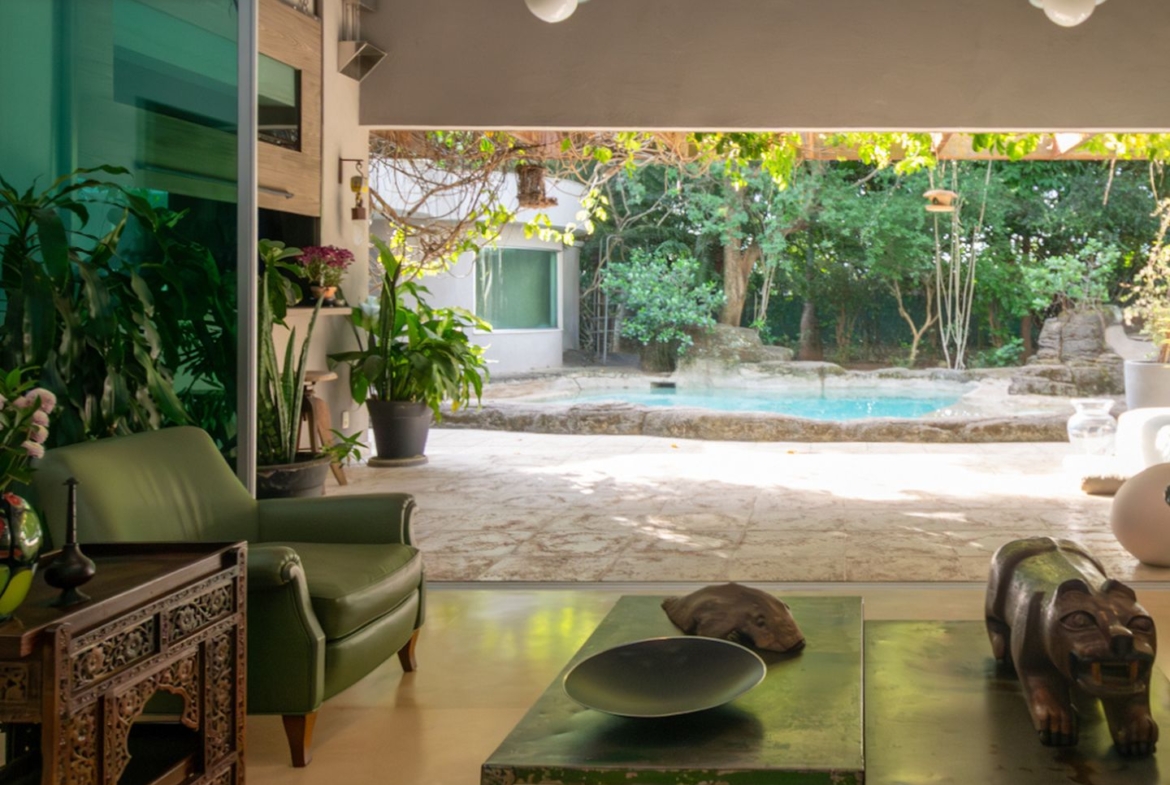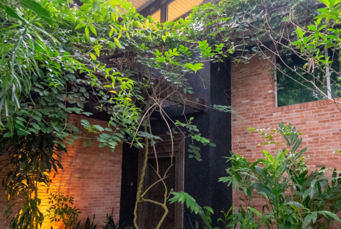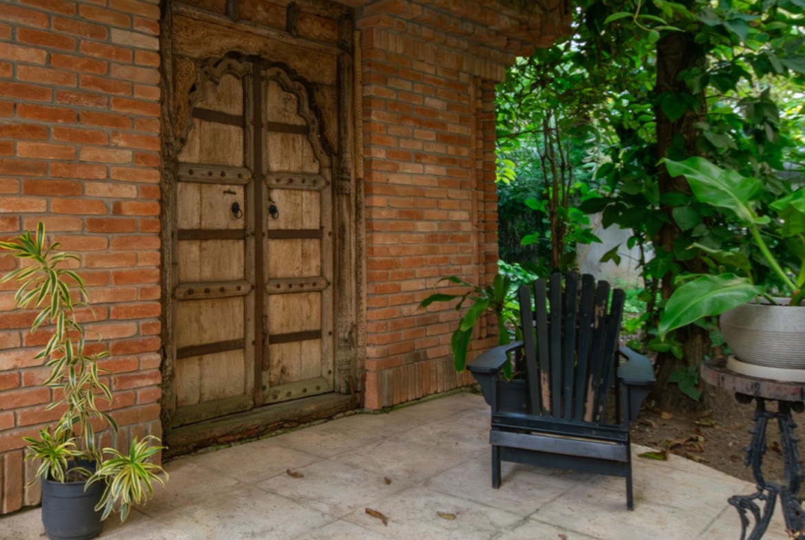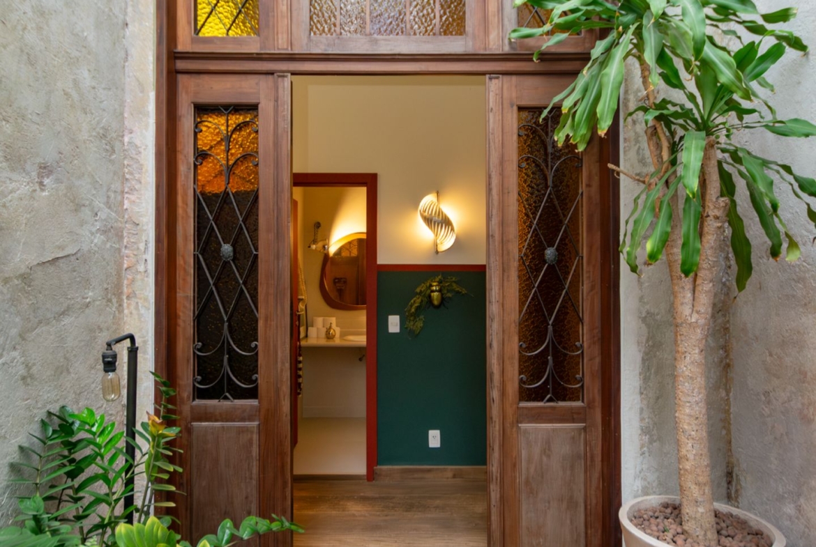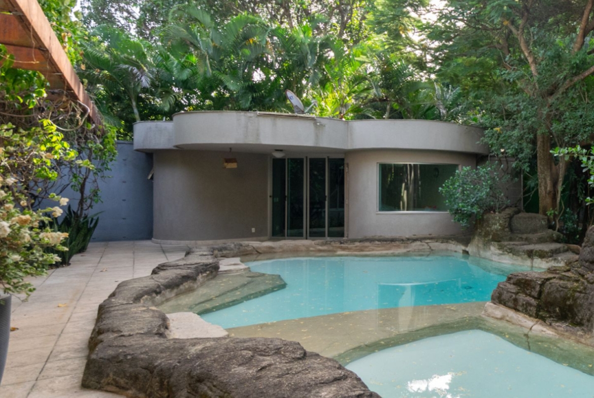 A área íntima remete a uma vila italiana, acessada por uma porta que veio da Índia e é uma obra de arte! Aliás, as portas são assunto sério nesta casa. Cada suite tem uma diferente, cada uma com a sua história e beleza. São quatro espaçosas suítes, sendo a master atendida por dois closets e dois banheiros, um deles com banheira voltada para o verde. Outras duas possuem ainda closet e escritório. Todas com ar condicionado tipo split e pensadas nos mínimos detalhes.