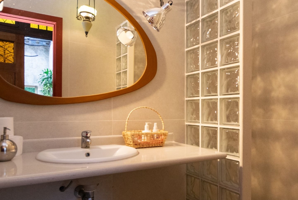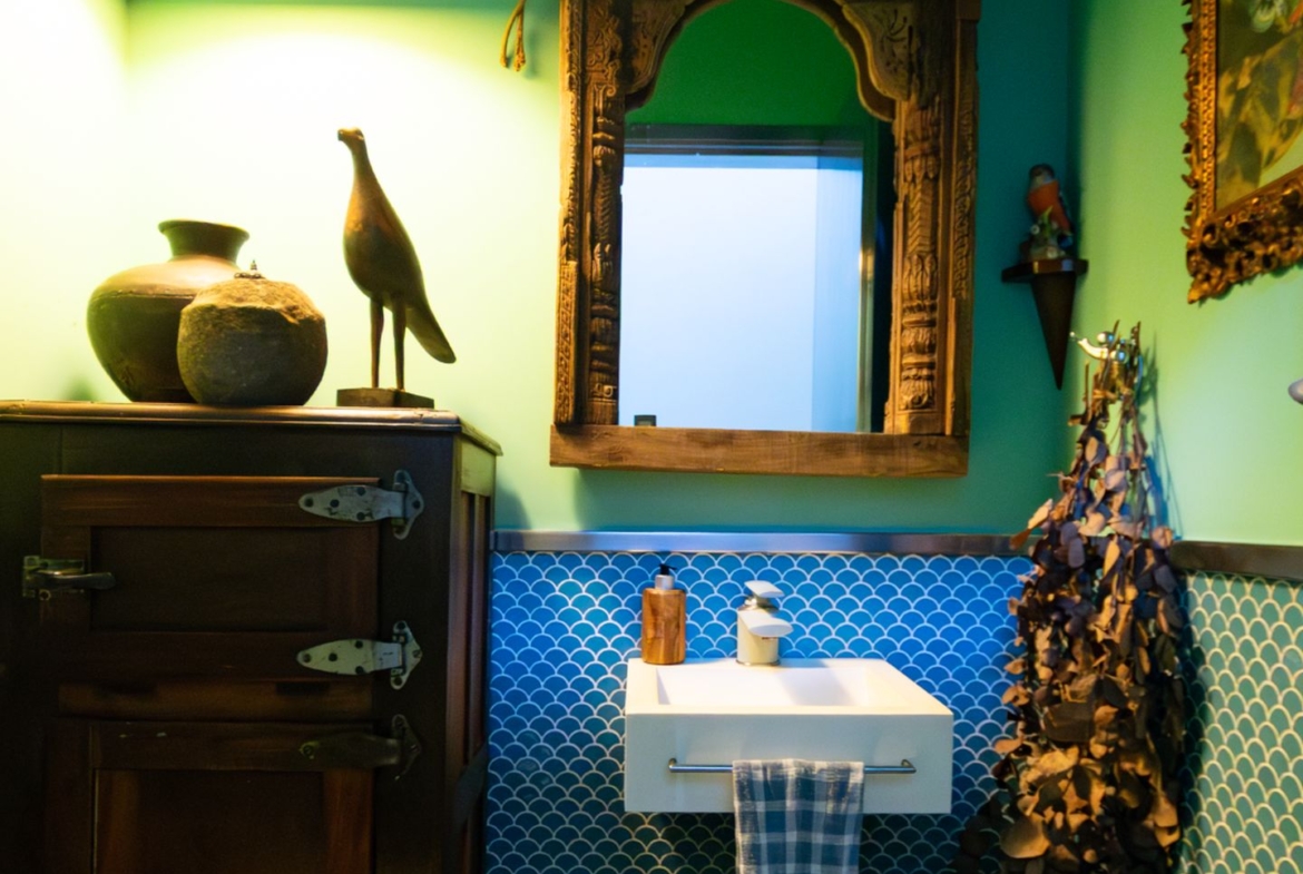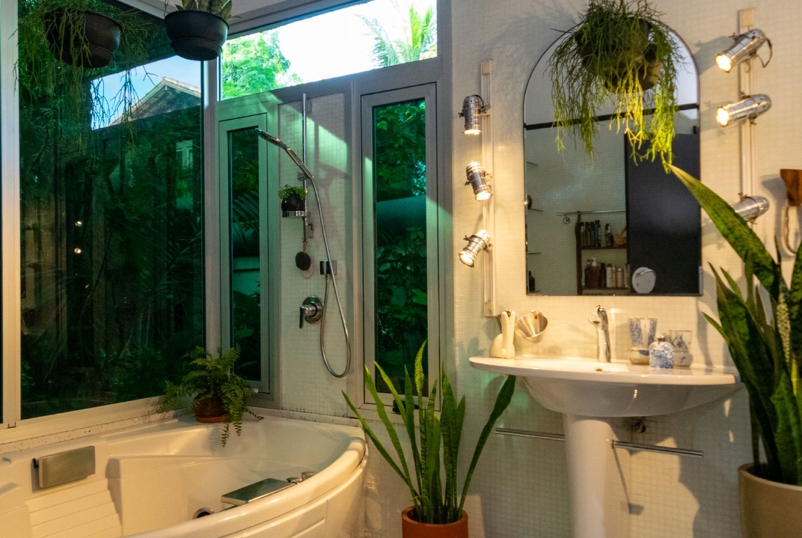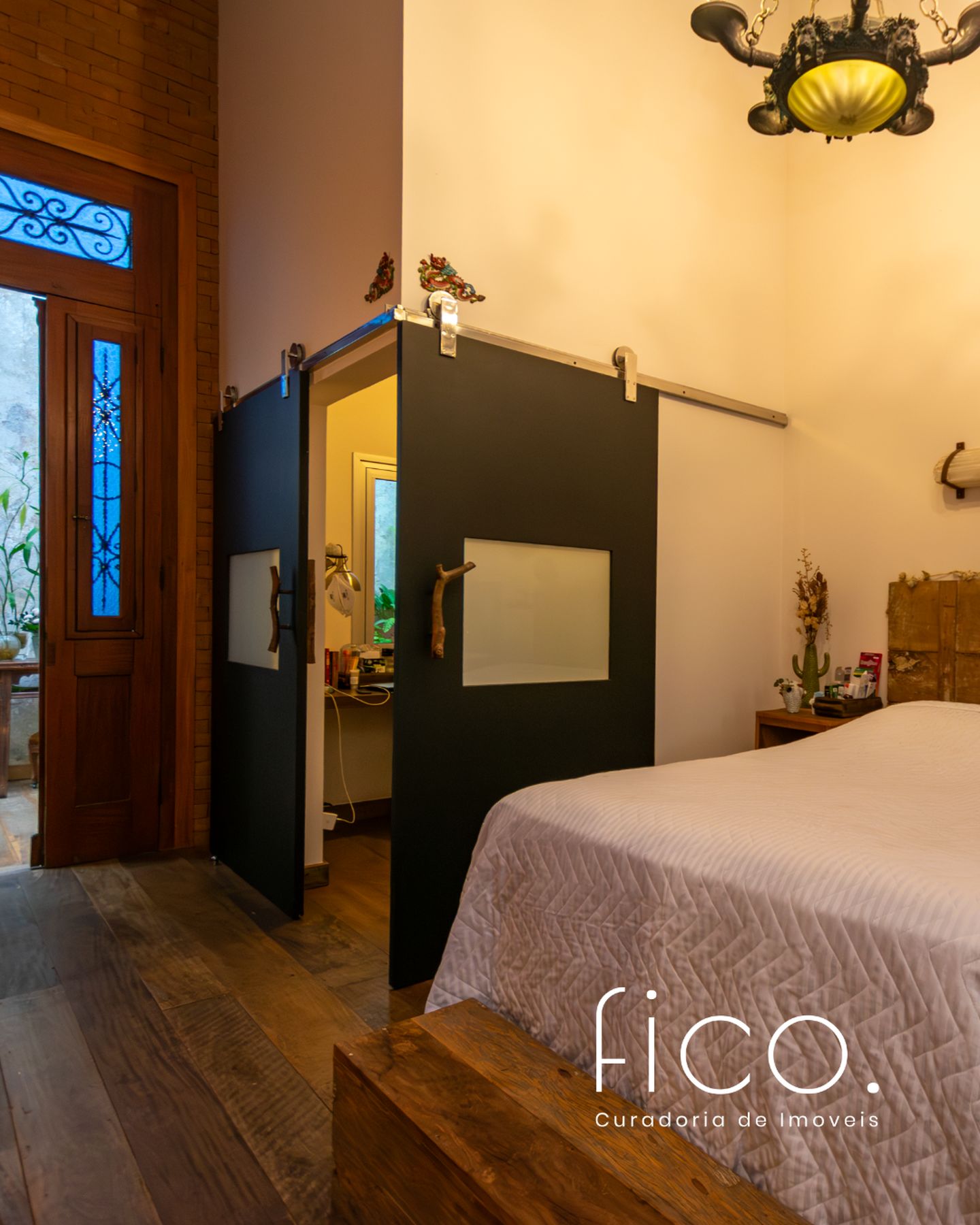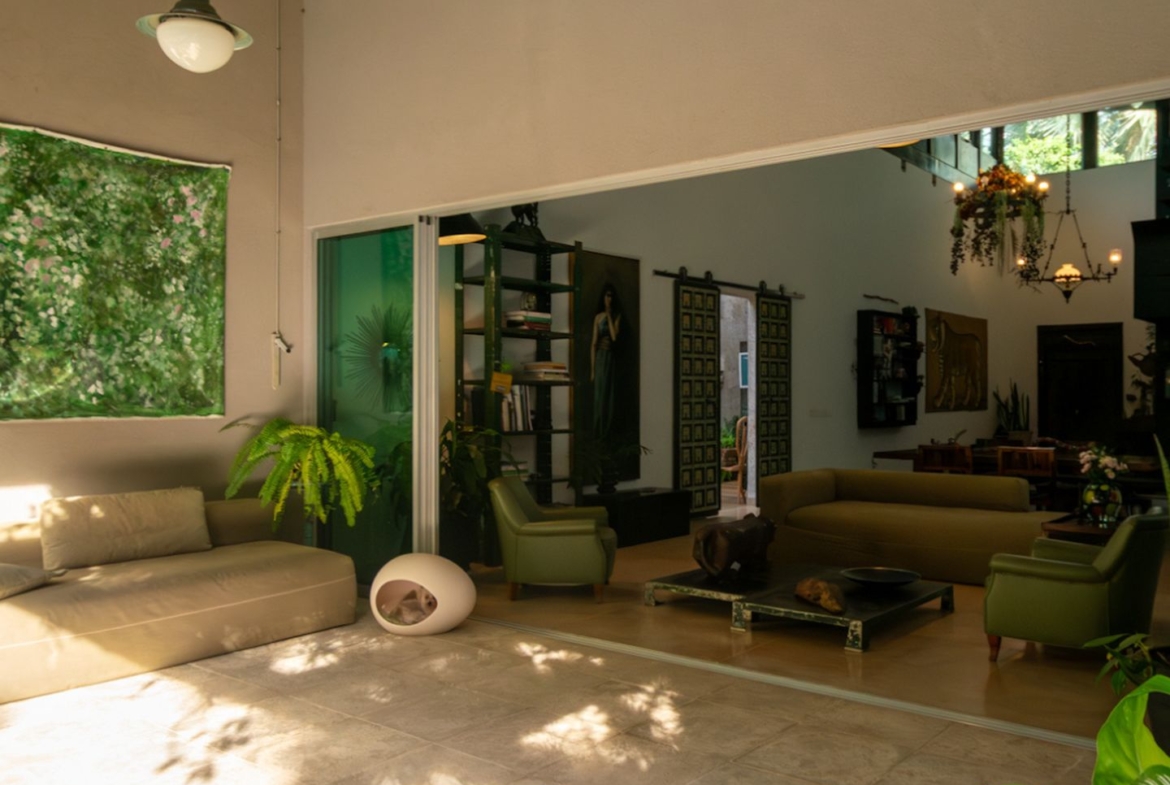 A área íntima remete a uma vila italiana, acessada por uma porta que veio da Índia e é uma obra de arte! Aliás, as portas são assunto sério nesta casa. Cada suite tem uma diferente, cada uma com a sua história e beleza. São quatro espaçosas suítes, sendo a master atendida por dois closets e dois banheiros, um deles com banheira voltada para o verde. Outras duas possuem ainda closet e escritório. Todas com ar condicionado tipo split e pensadas nos mínimos detalhes.