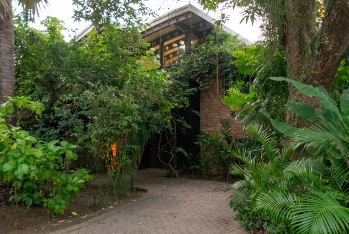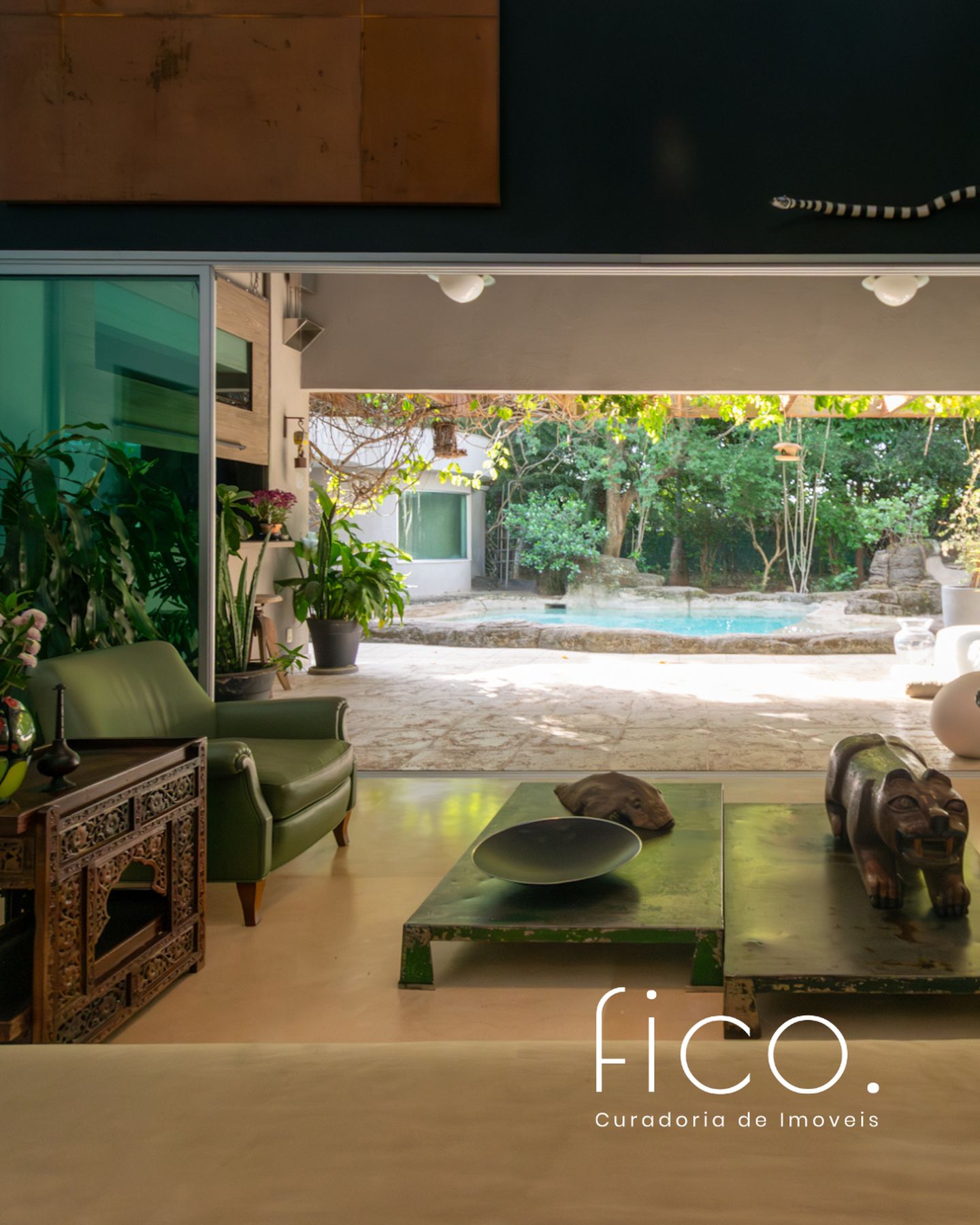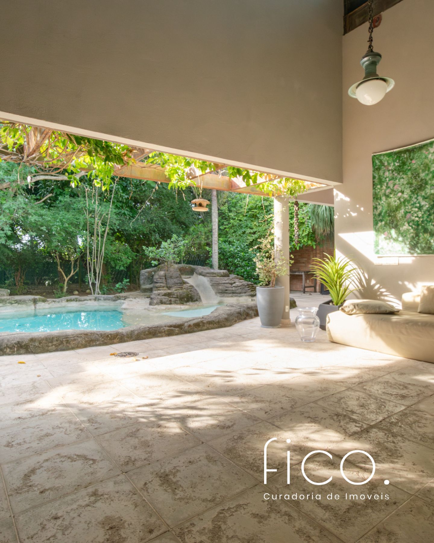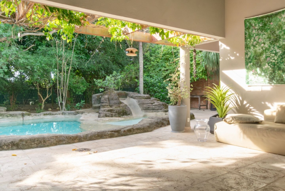 Tem uma agradável varanda coberta, que faz a transição da sala para a piscina, pergolado repleto de verde, piscina, sauna, banheiro, academia e ainda um pequeno templo de meditação, com uma porta indiana de 500 anos!
