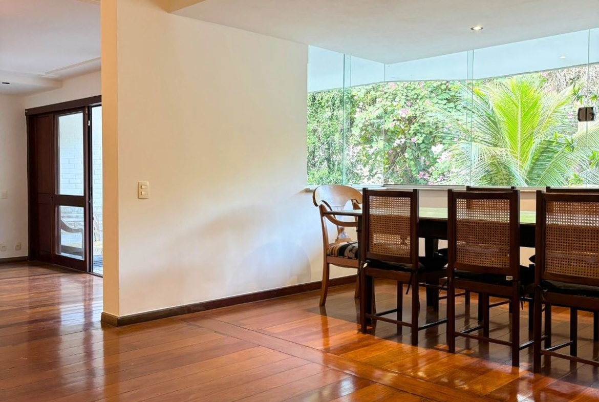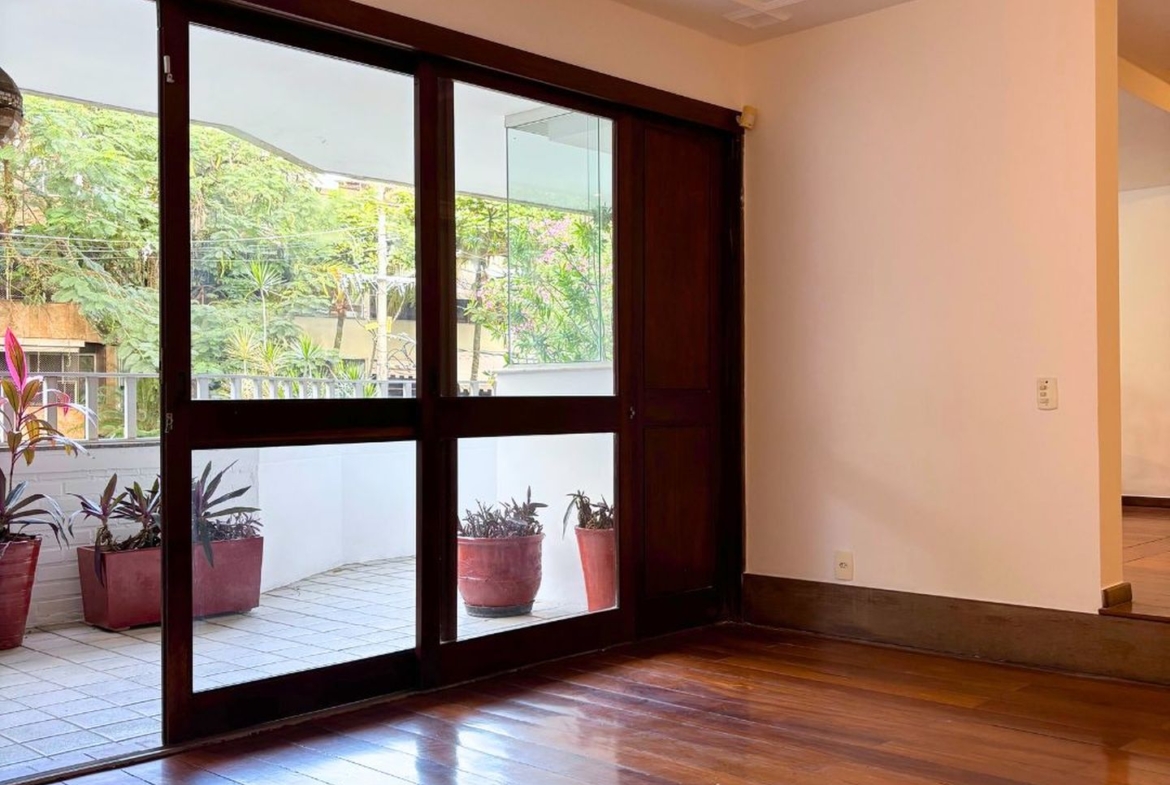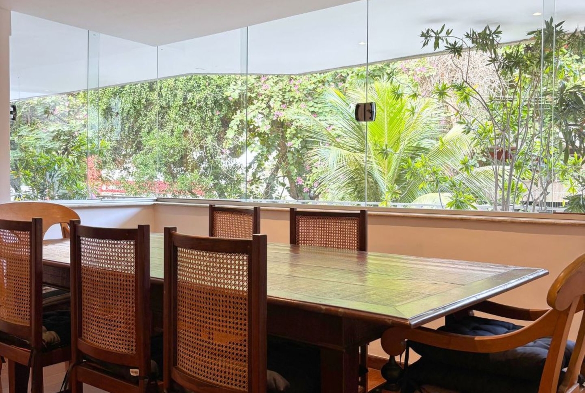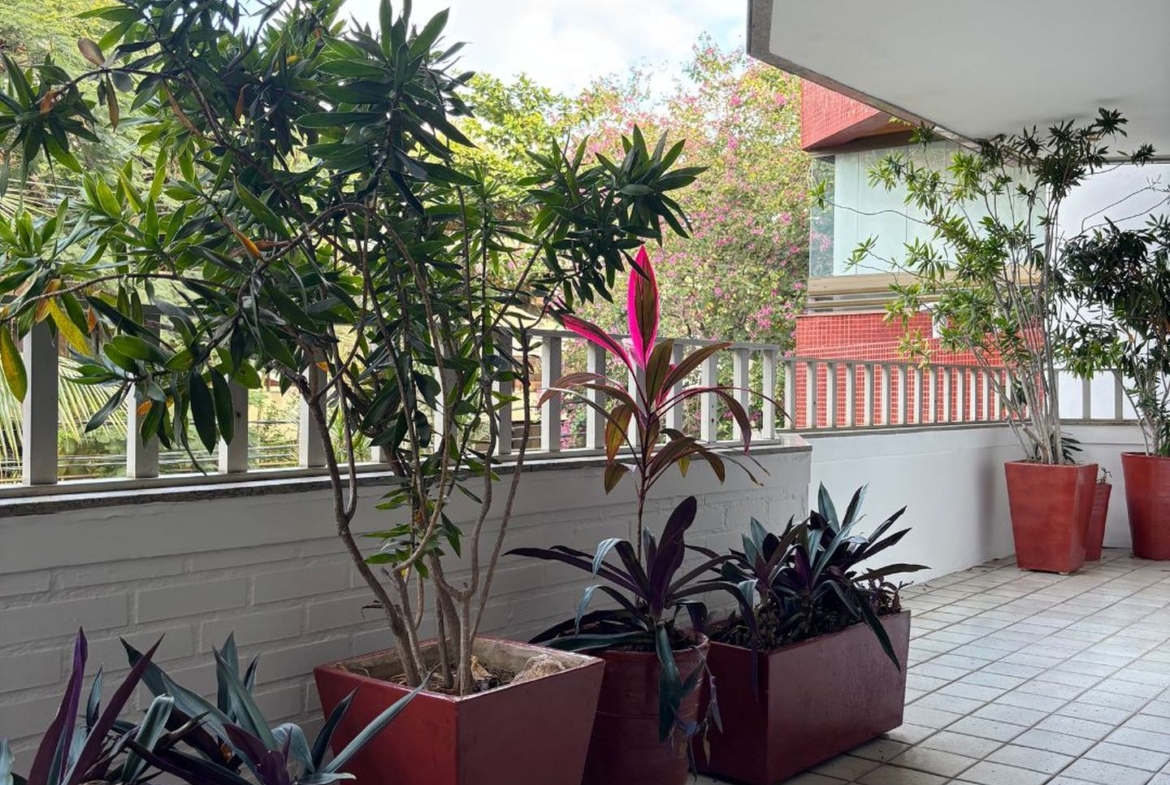 A ampla sala em três ambientes, e com um lindo piso em tábuas corridas, possui uma agradável varanda em toda a sua extensão, por onde entra o verde e muita luz.