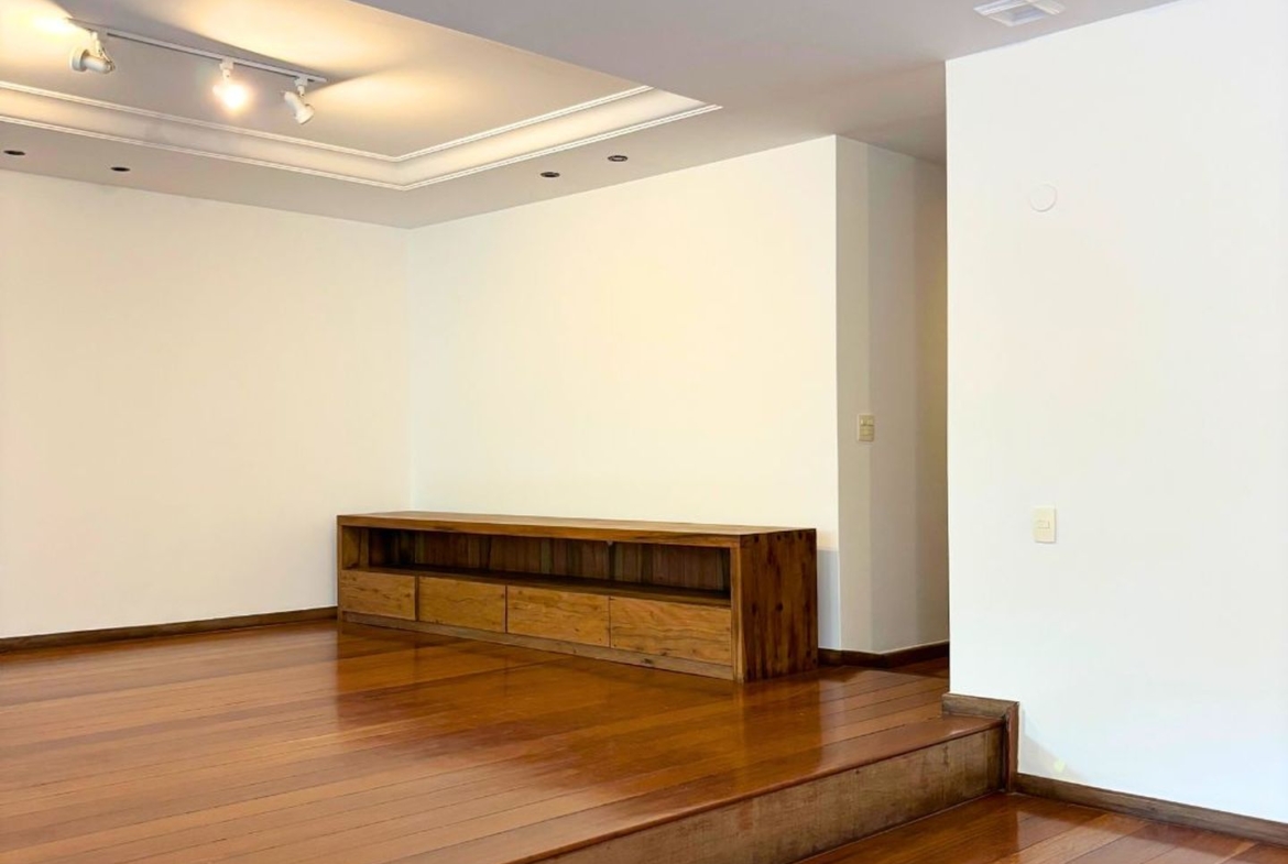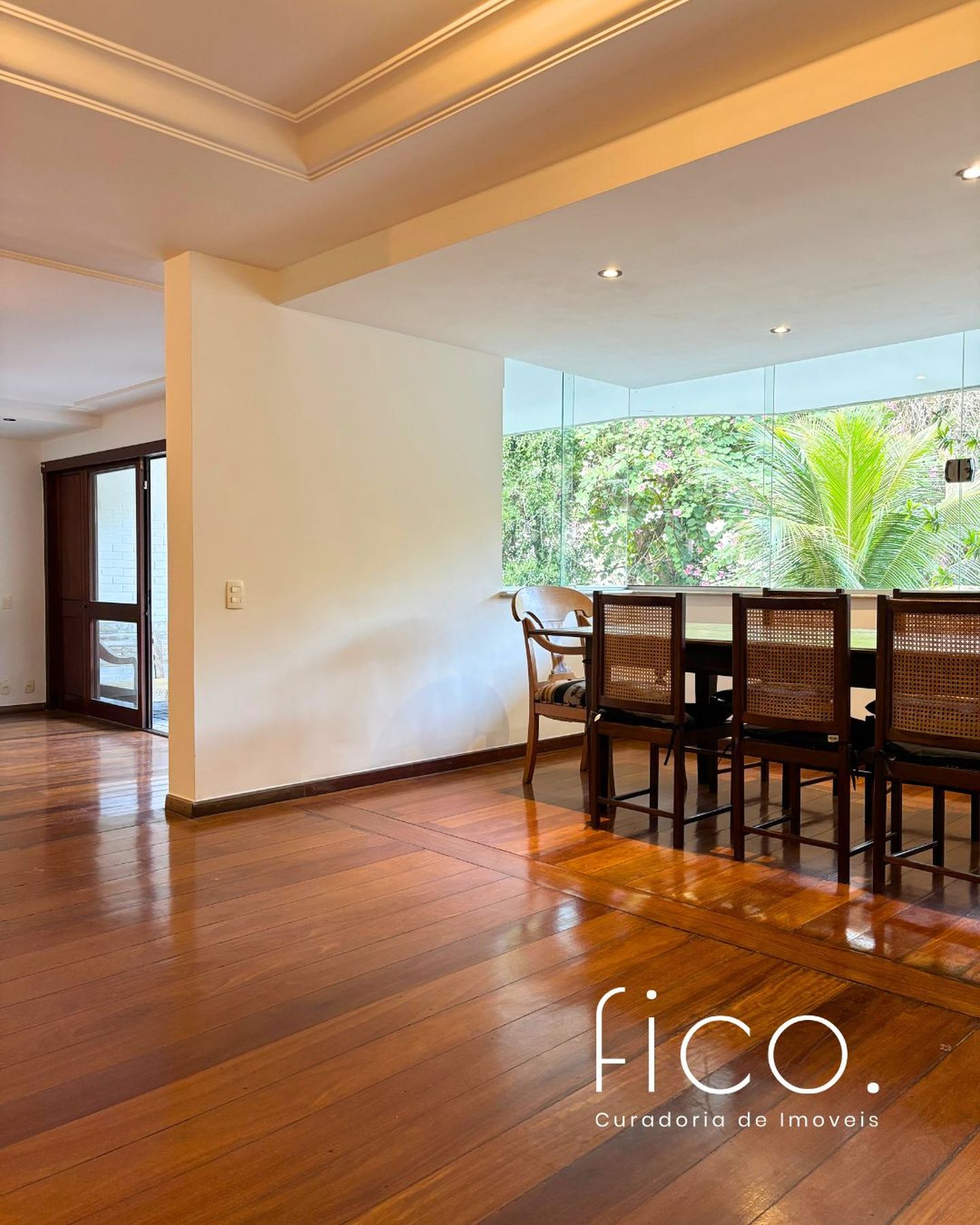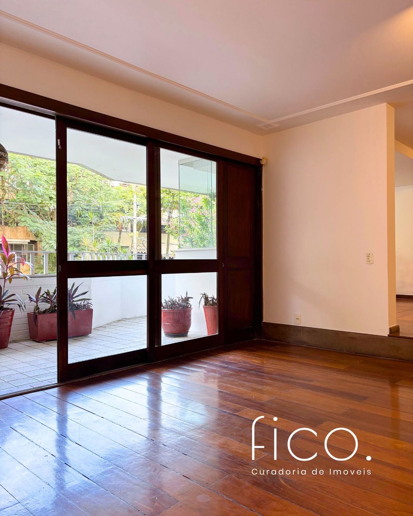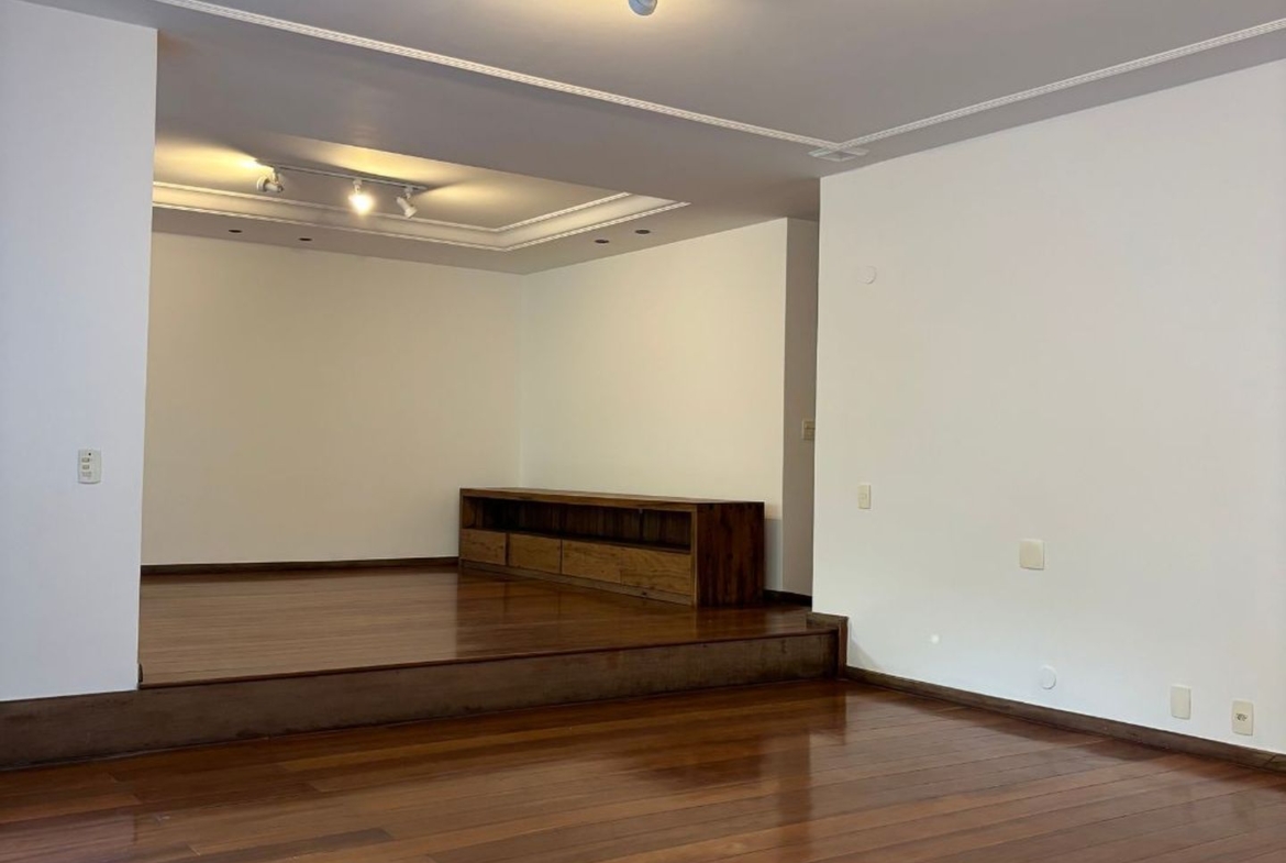 A ampla sala em três ambientes, e com um lindo piso em tábuas corridas, possui uma agradável varanda em toda a sua extensão, por onde entra o verde e muita luz.