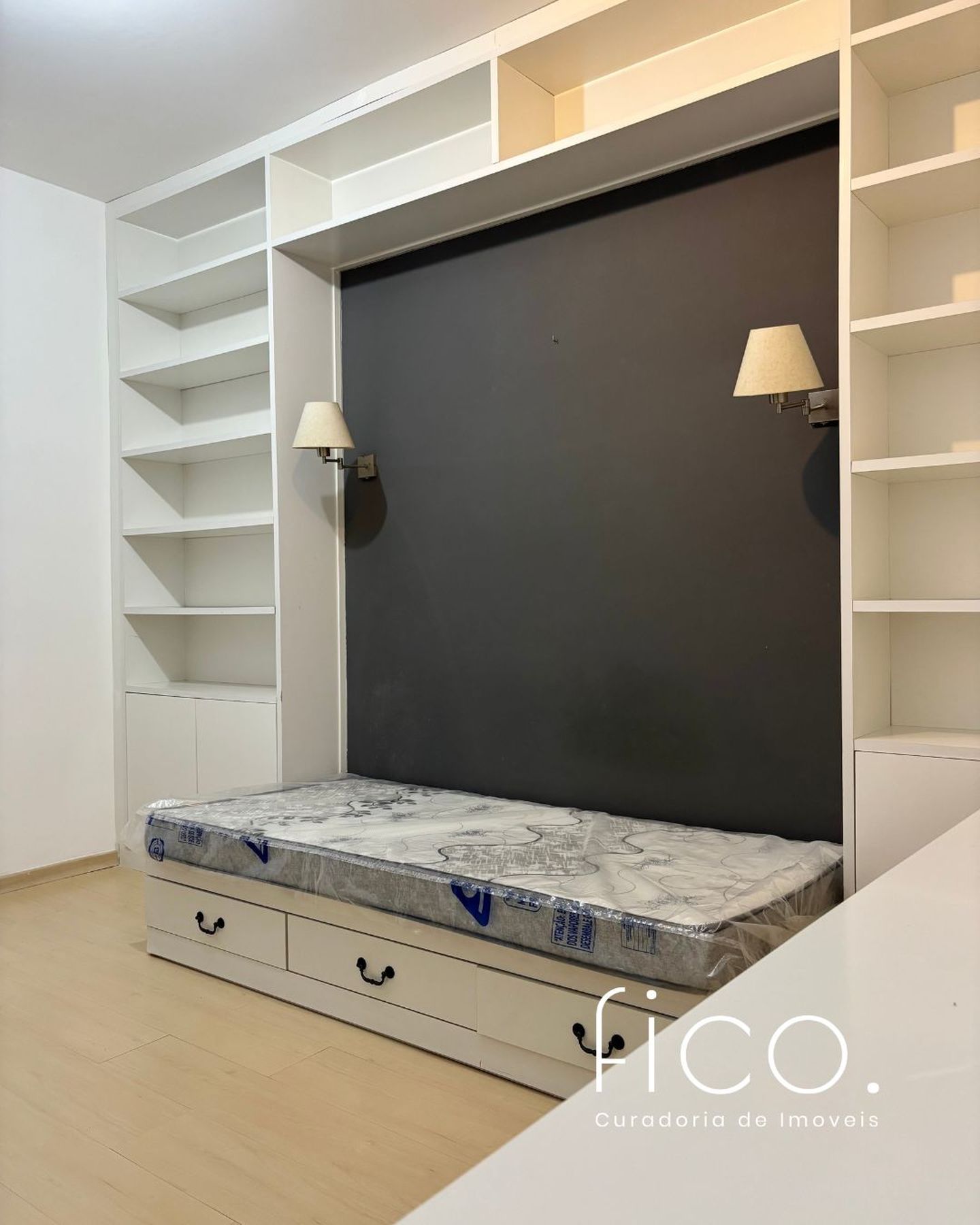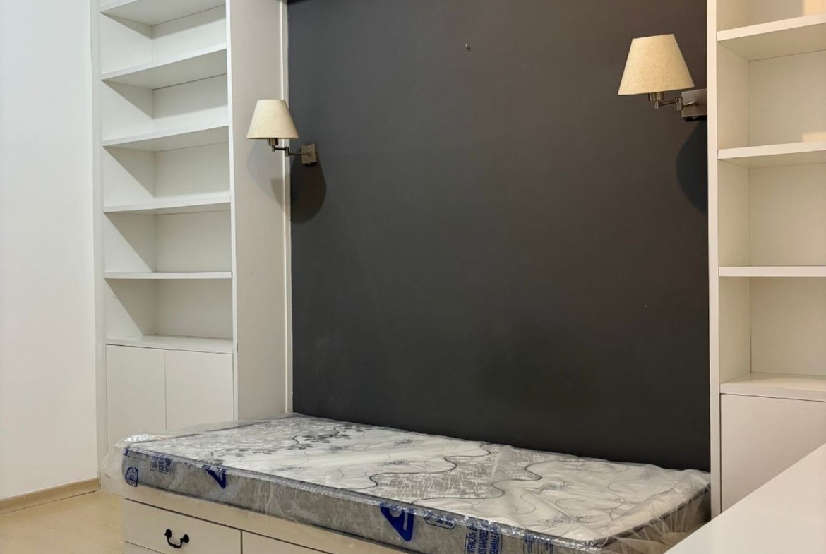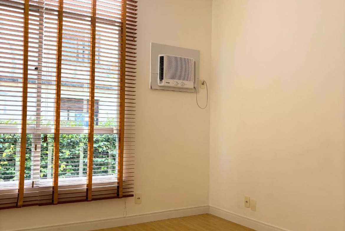 A área íntima, com piso em tacos de madeira, é muito silenciosa e clara.