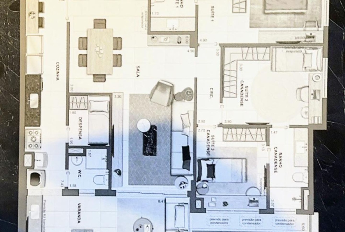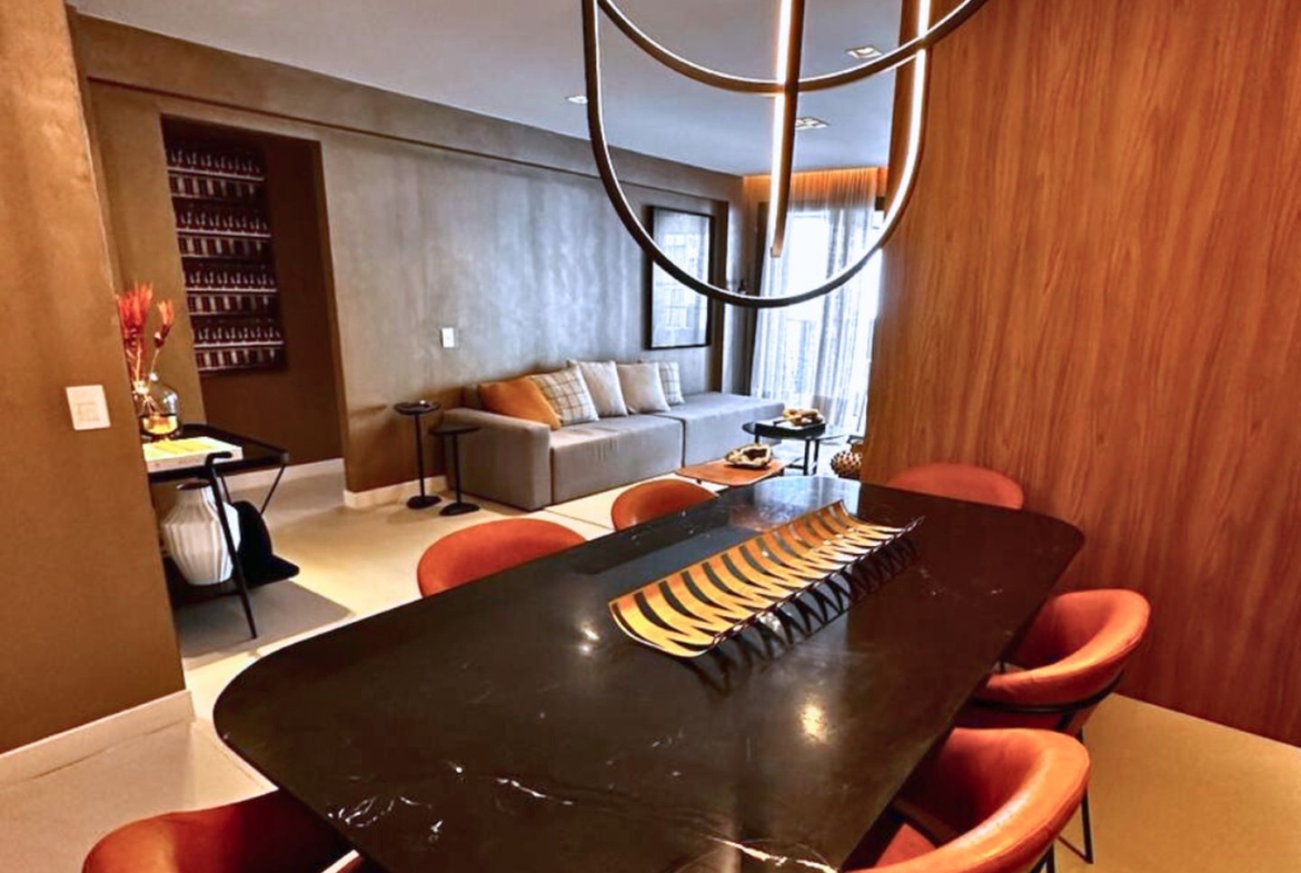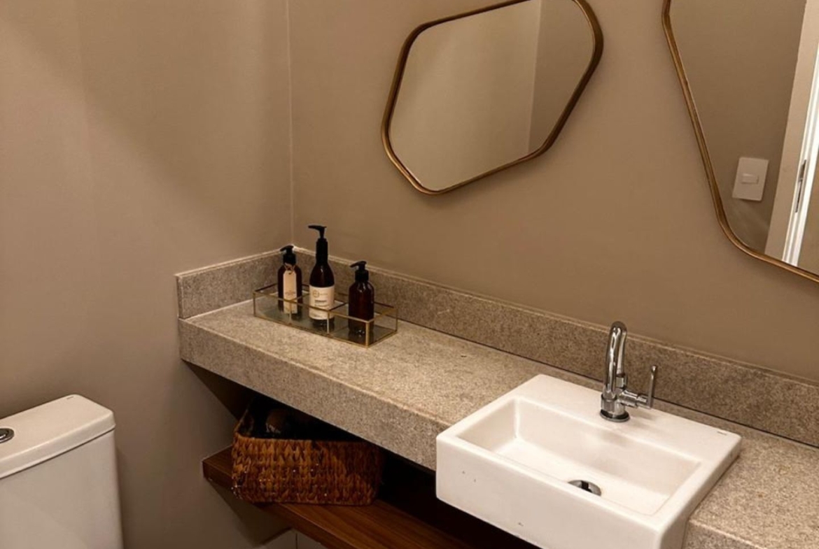 São três quartos, sendo uma suíte tradicional e duas canadenses, com um banheiro compartilhado por dois quartos. A sala em dois ambientes é arejada e bem iluminada, com possibilidade de integração com a cozinha. Tem ainda lavabo e dependência completa de serviço.