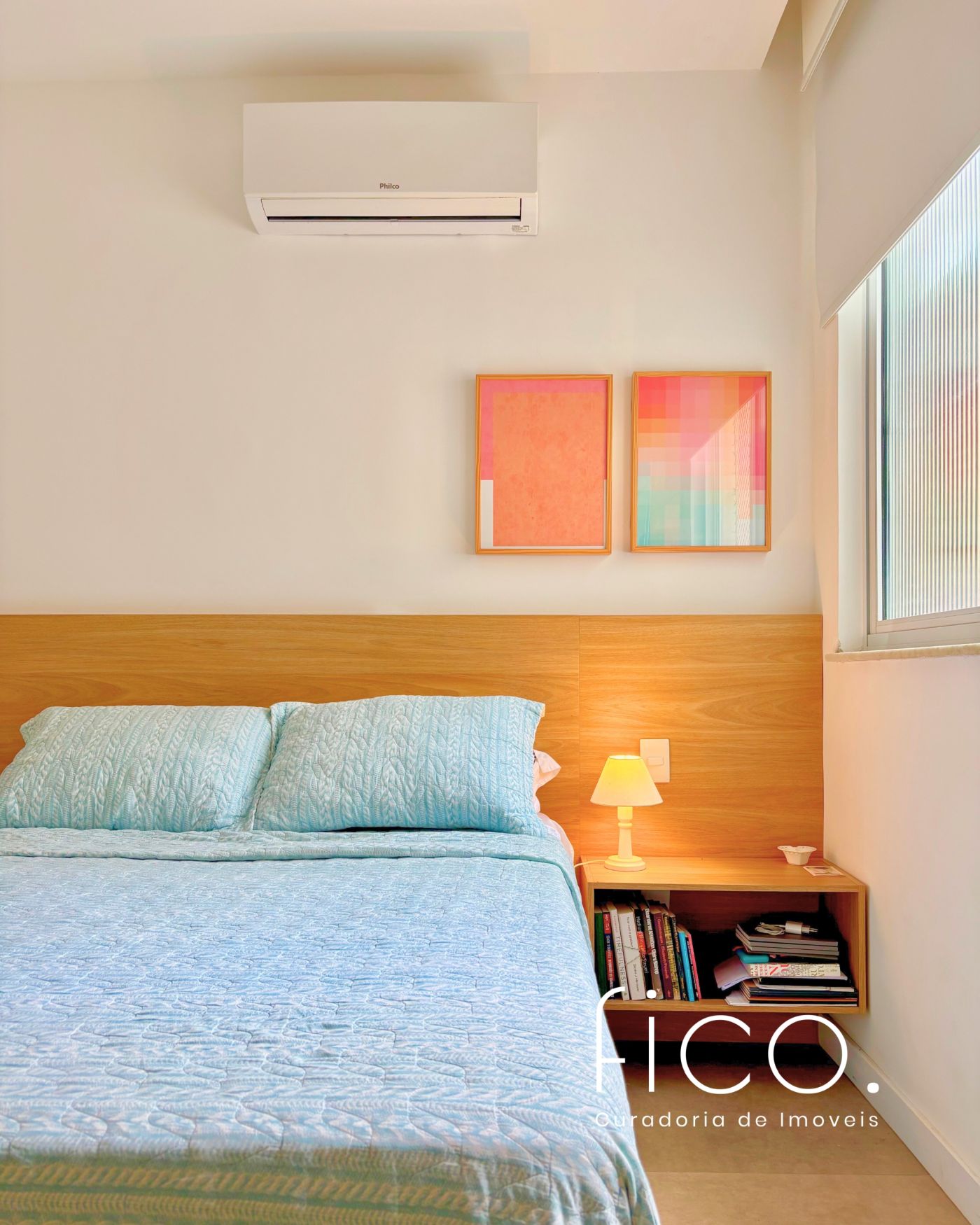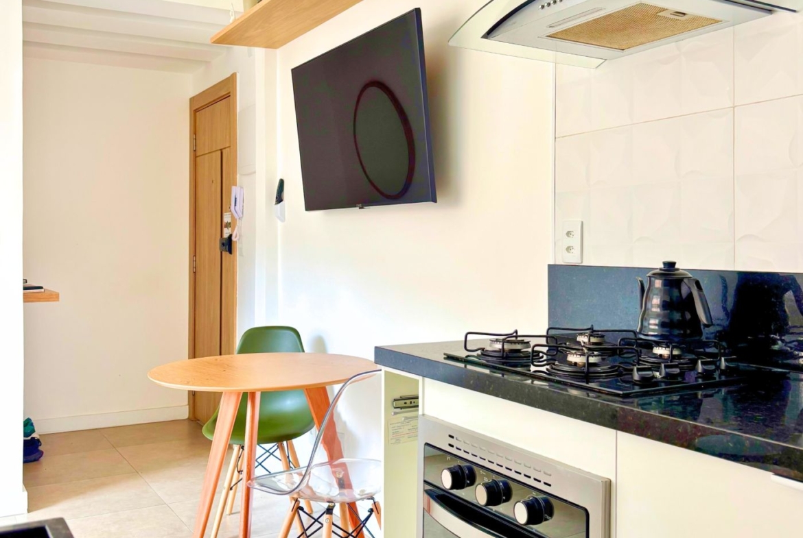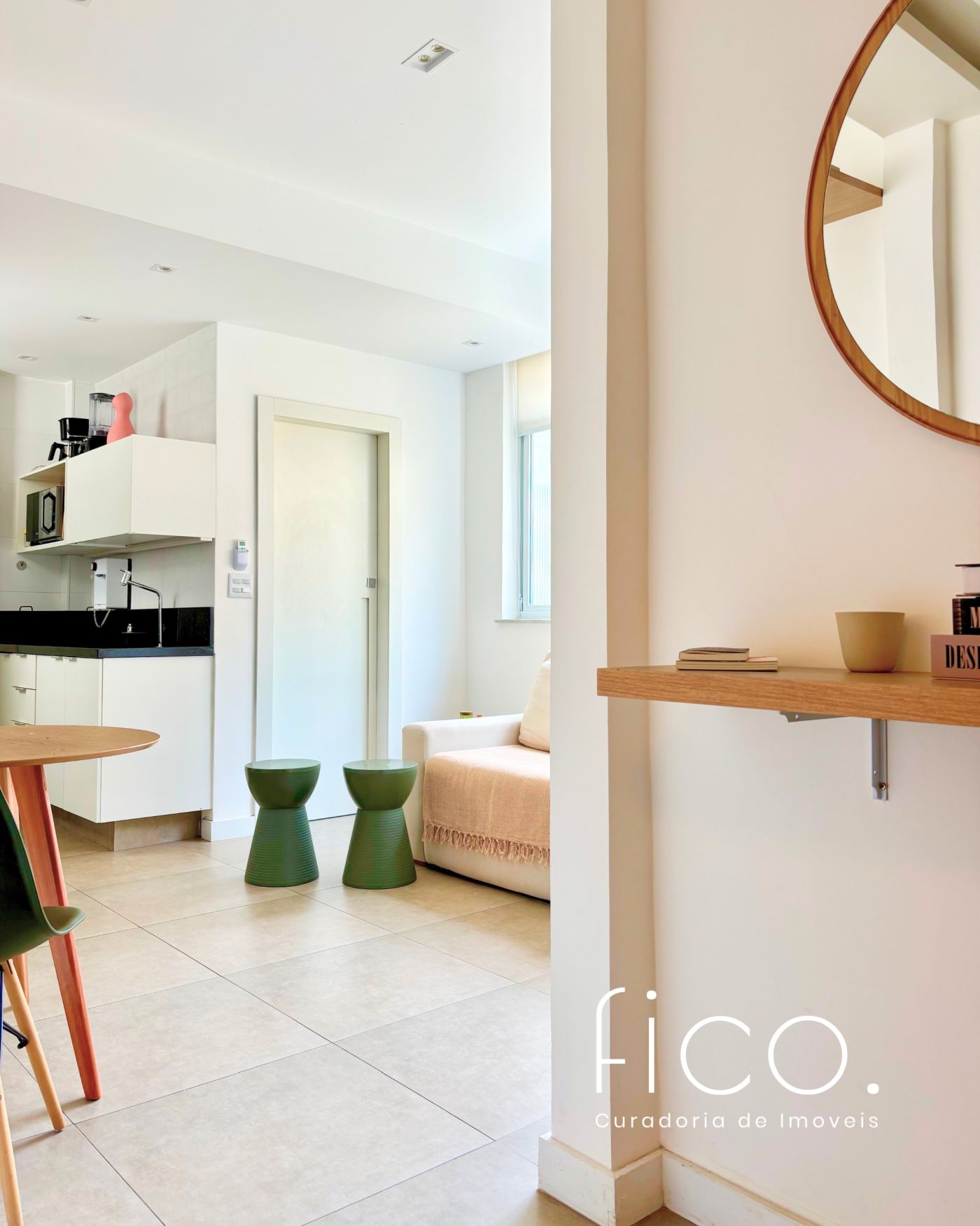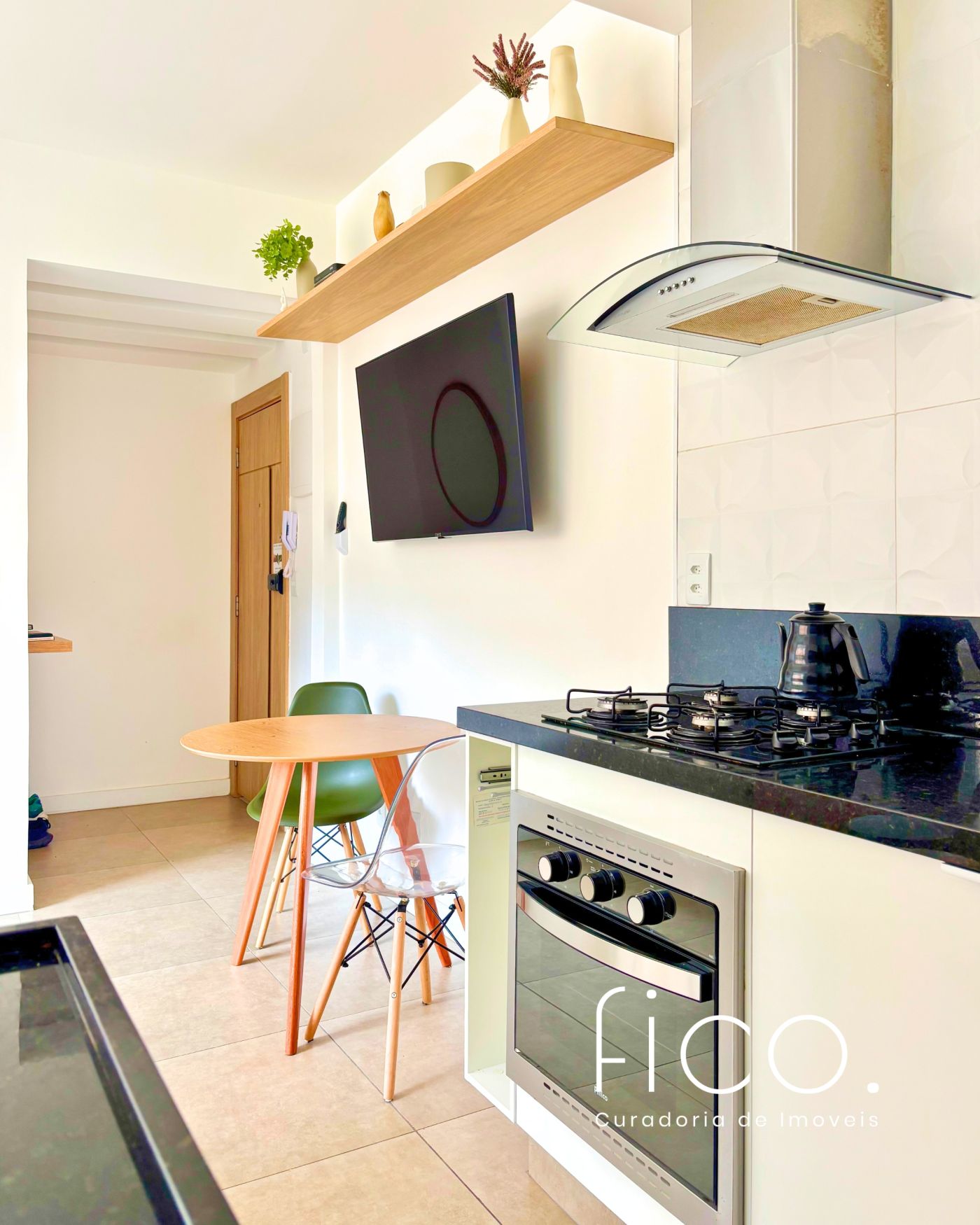Possui quarto e sala com ar condicionado tipo split, cozinha integrada e banheiro com dois acessos, atendendo a área social e o quarto. É muito silencioso, claro e ventilado e fica em prédio com elevador, vaga e portaria em horário parcial. Conta ainda com uma área gourmet toda equipada e decorada.