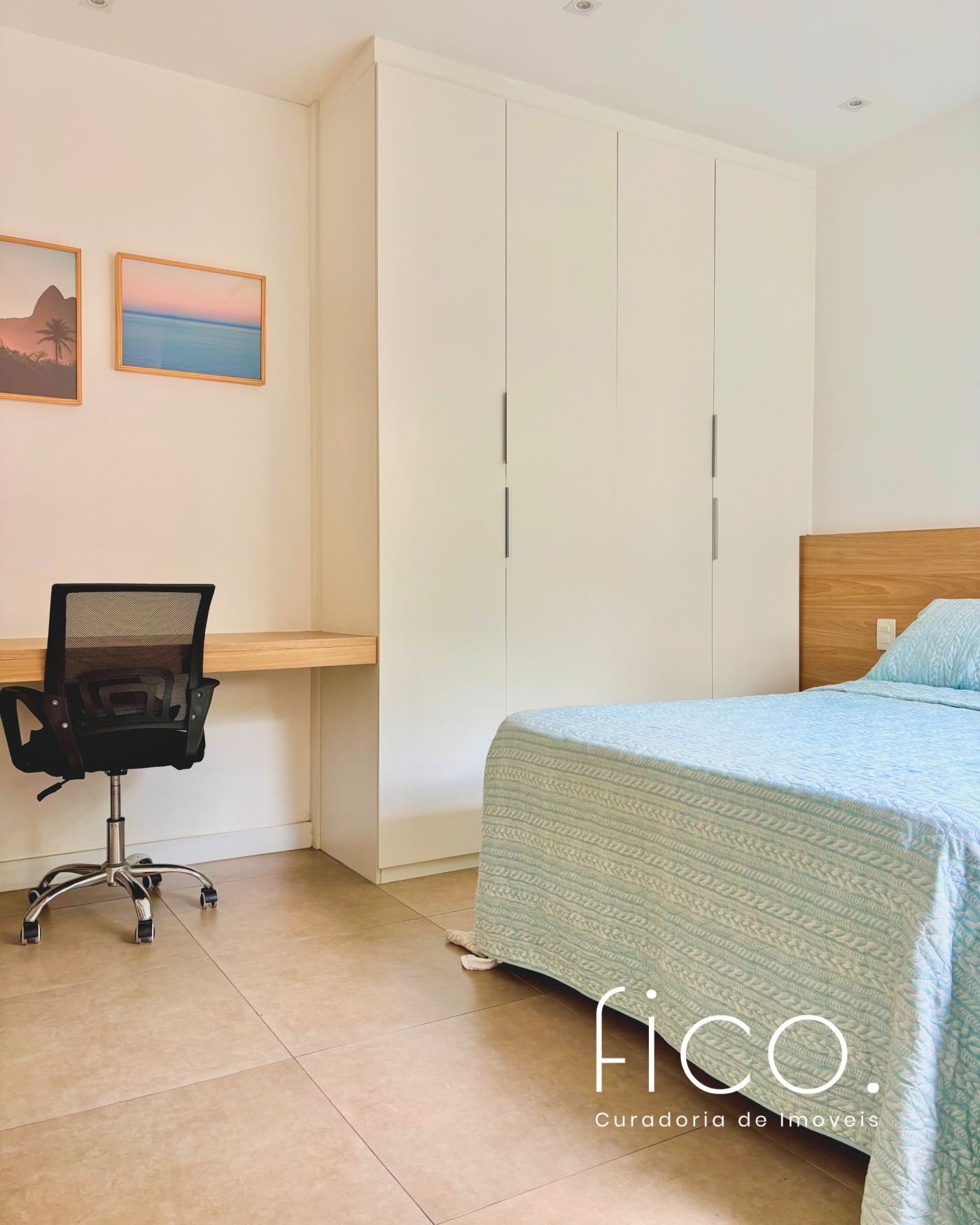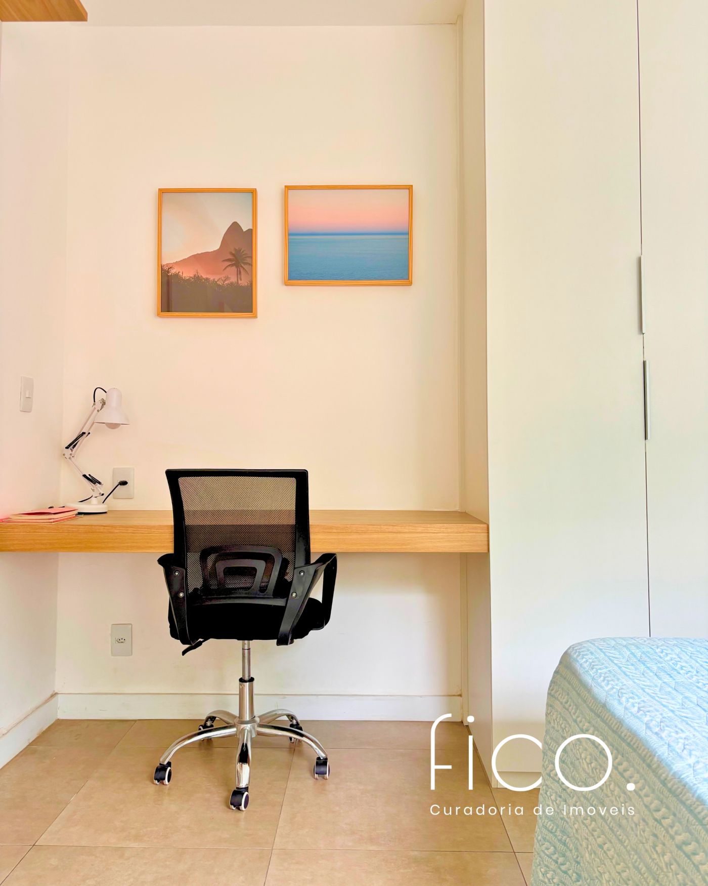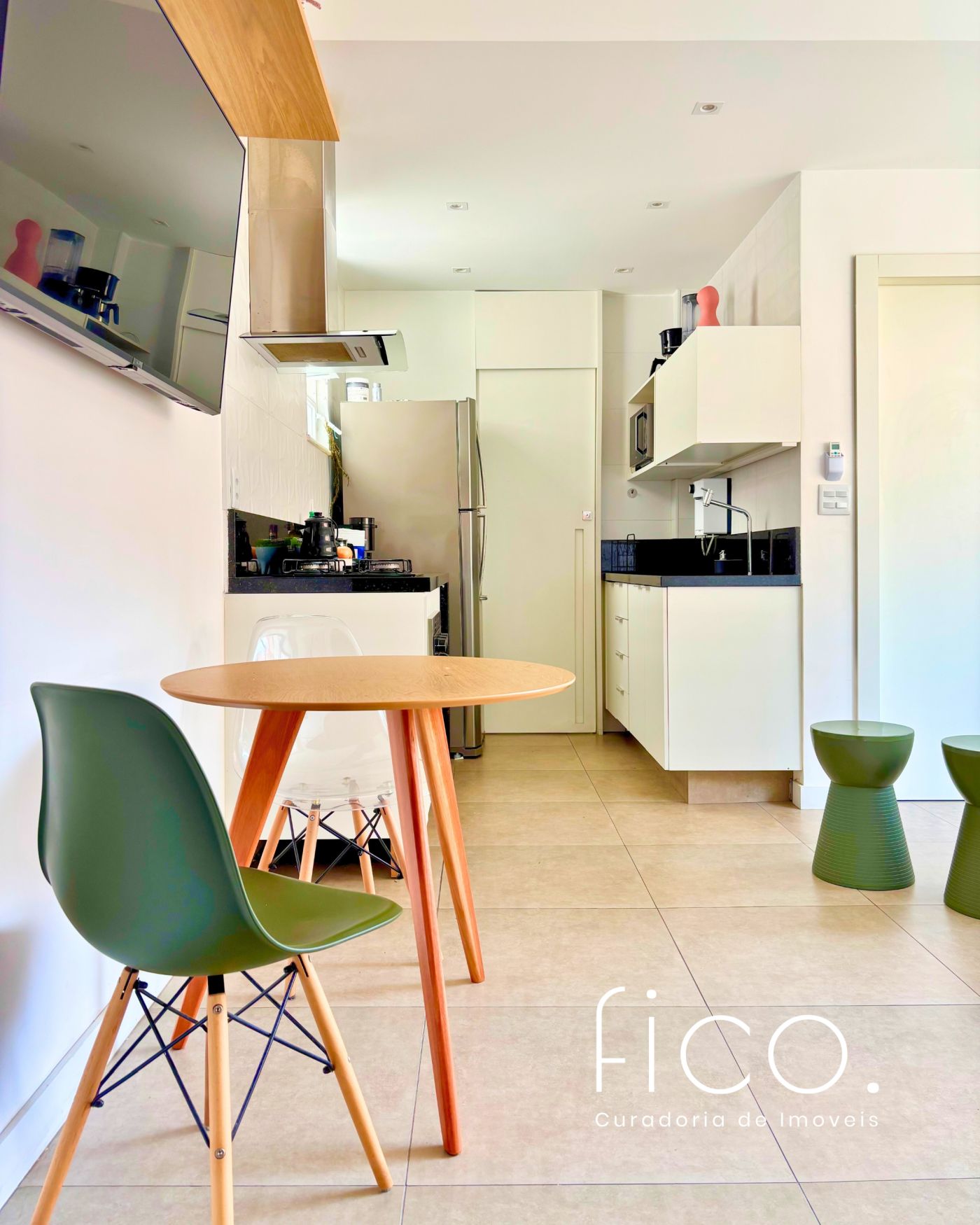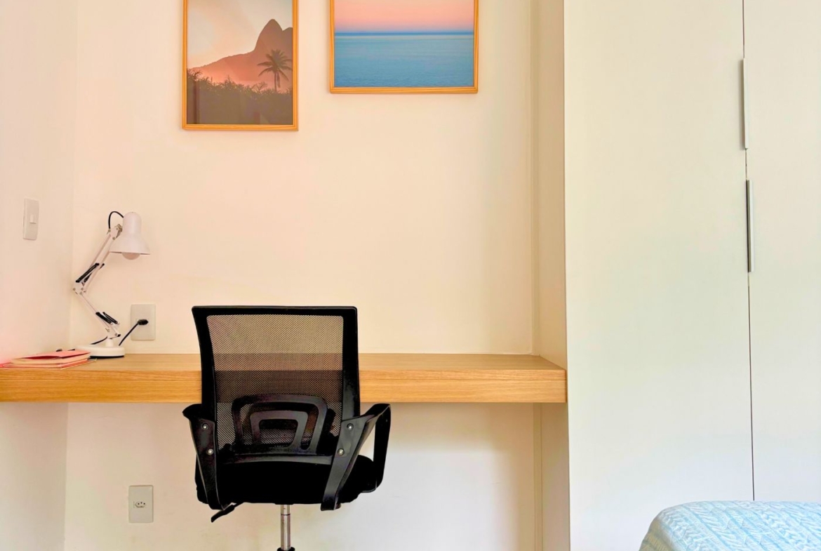 Possui quarto e sala com ar condicionado tipo split, cozinha integrada e banheiro com dois acessos, atendendo a área social e o quarto. É muito silencioso, claro e ventilado e fica em prédio com elevador, vaga e portaria em horário parcial. Conta ainda com uma área gourmet toda equipada e decorada.