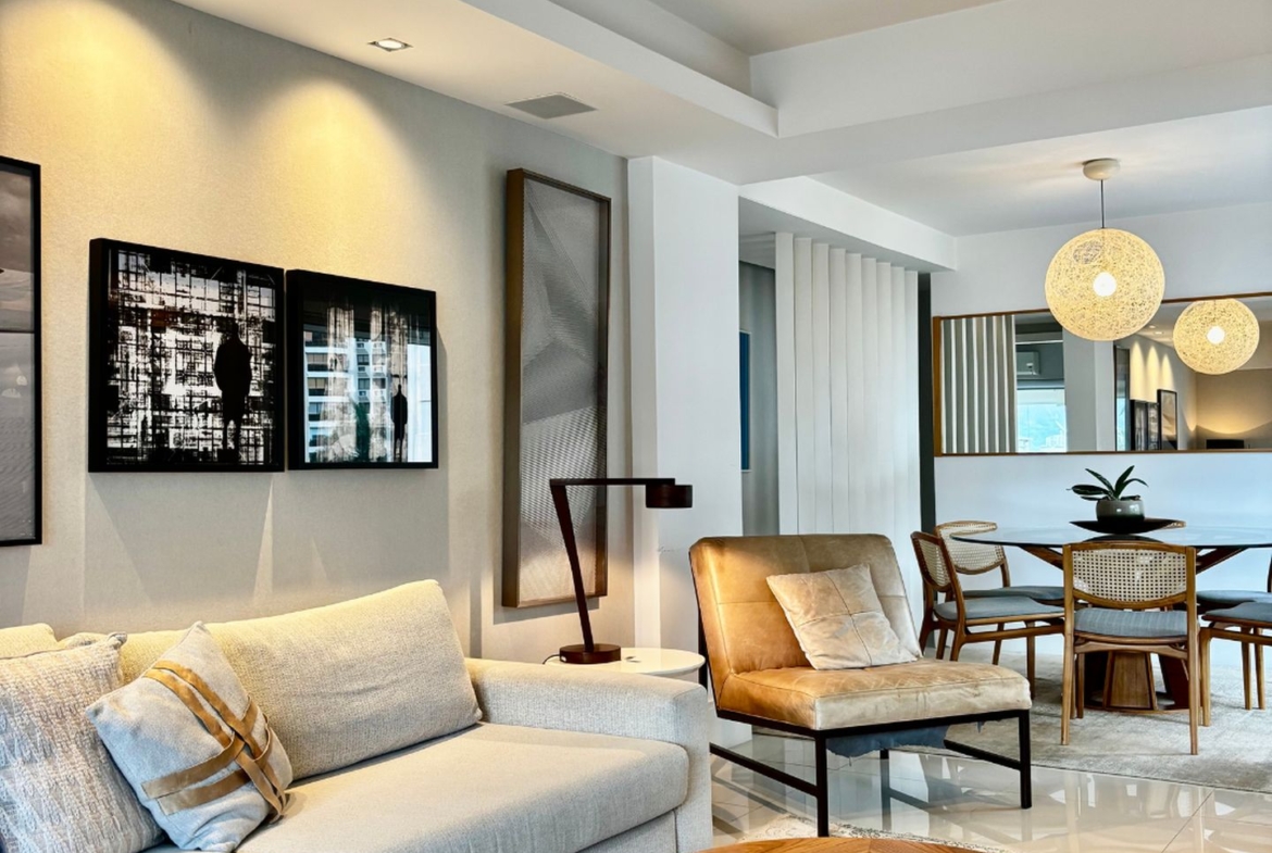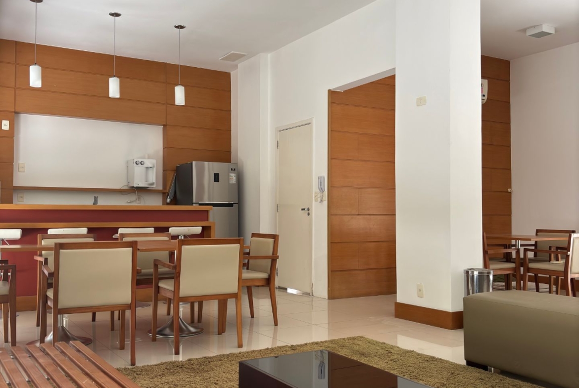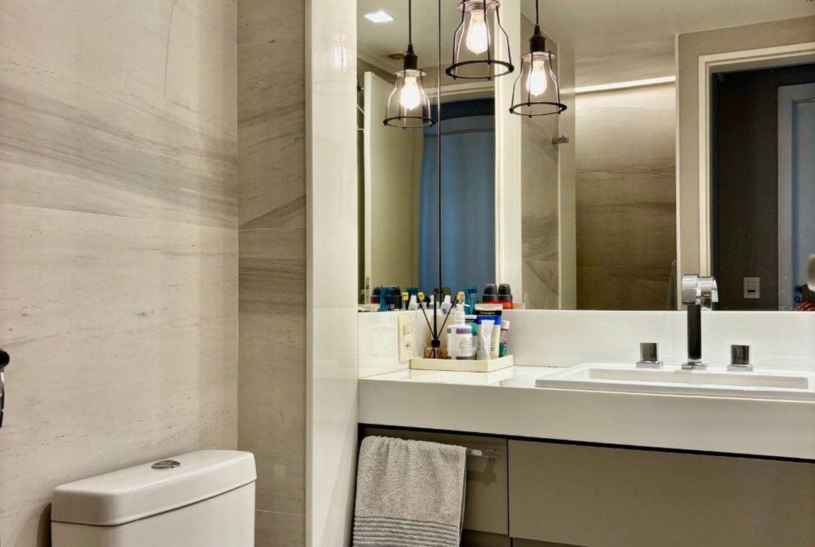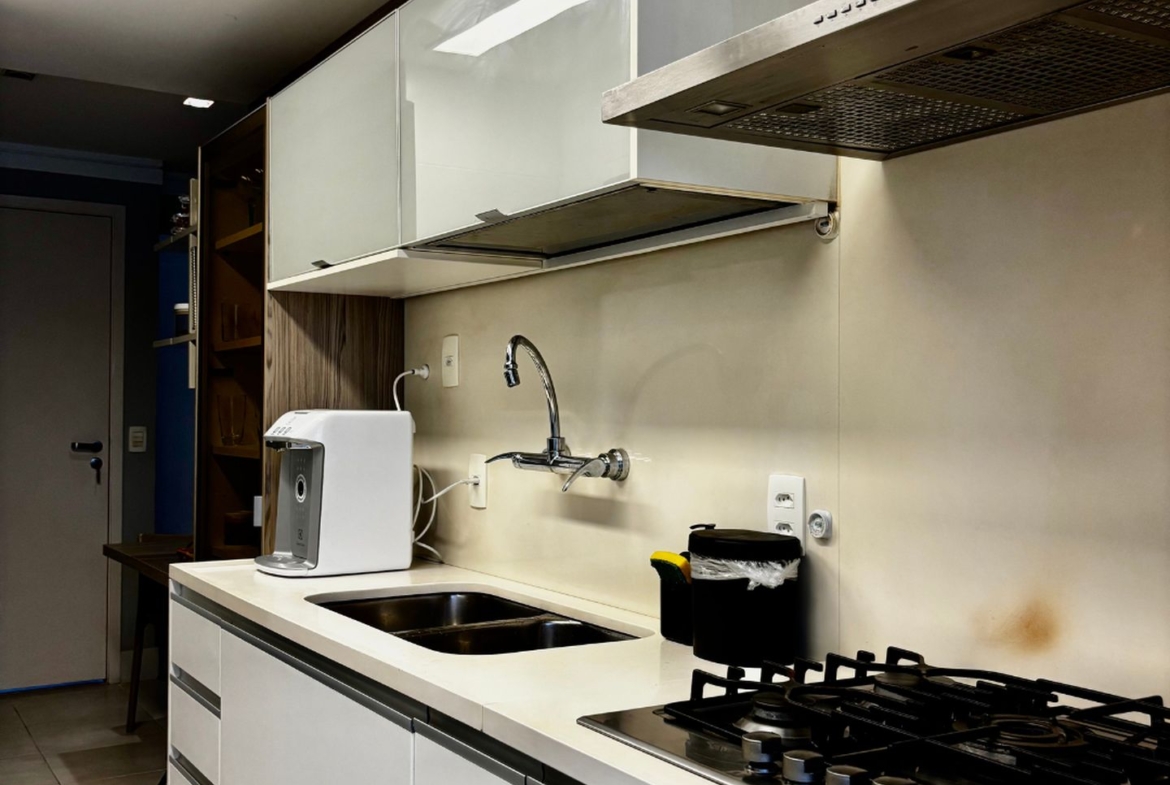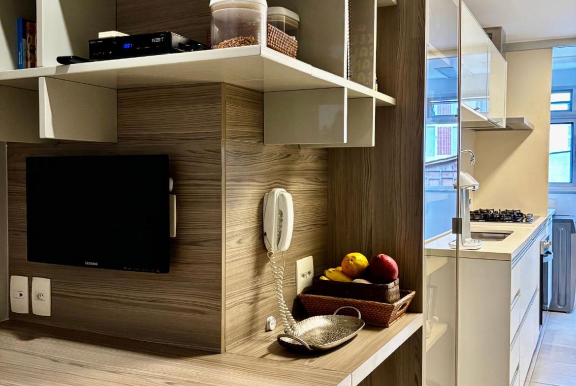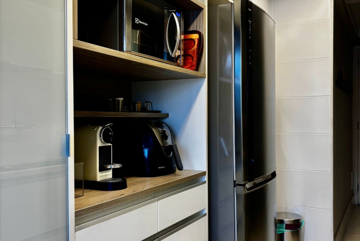Cercado por varanda fechada com cortina de vidro, tem sala em dois ambientes, três quartos, sendo uma suíte, banheiro social e copa cozinha com área e dependência completa de serviço. Todos os ambientes com marcenaria planejada e ar condicionado tipo split e sala com sonorização e iluminação automatizada. Entrar e morar!