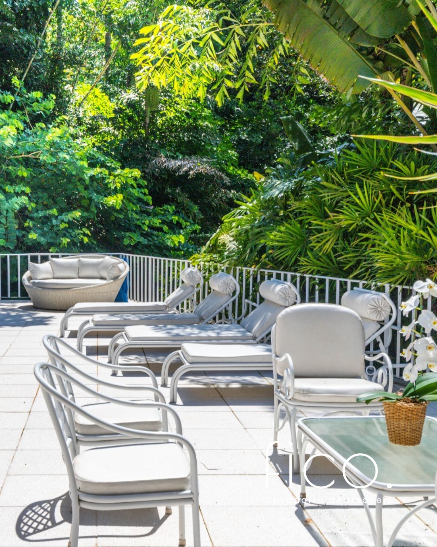 No pavimento de acesso, o hall de entrada faz a distribuição para toda a área social e de serviços, bem como para a escada, que leva ao segundo pavimento, onde fica a área íntima. A área social é toda voltada para o pátio da piscina, com uma vista lindíssima e protegida para o jardim. Composta por um amplo salão dividido em três ambientes, com estar, área de jogos e sala de TV equipada com um grande aparador em marcenaria e projetor. A sala de jantar é um charme à parte, adjacente ao salão principal, sua parede de espelho reflete toda a exuberância do verde externo. Um espaço belíssimo para receber!