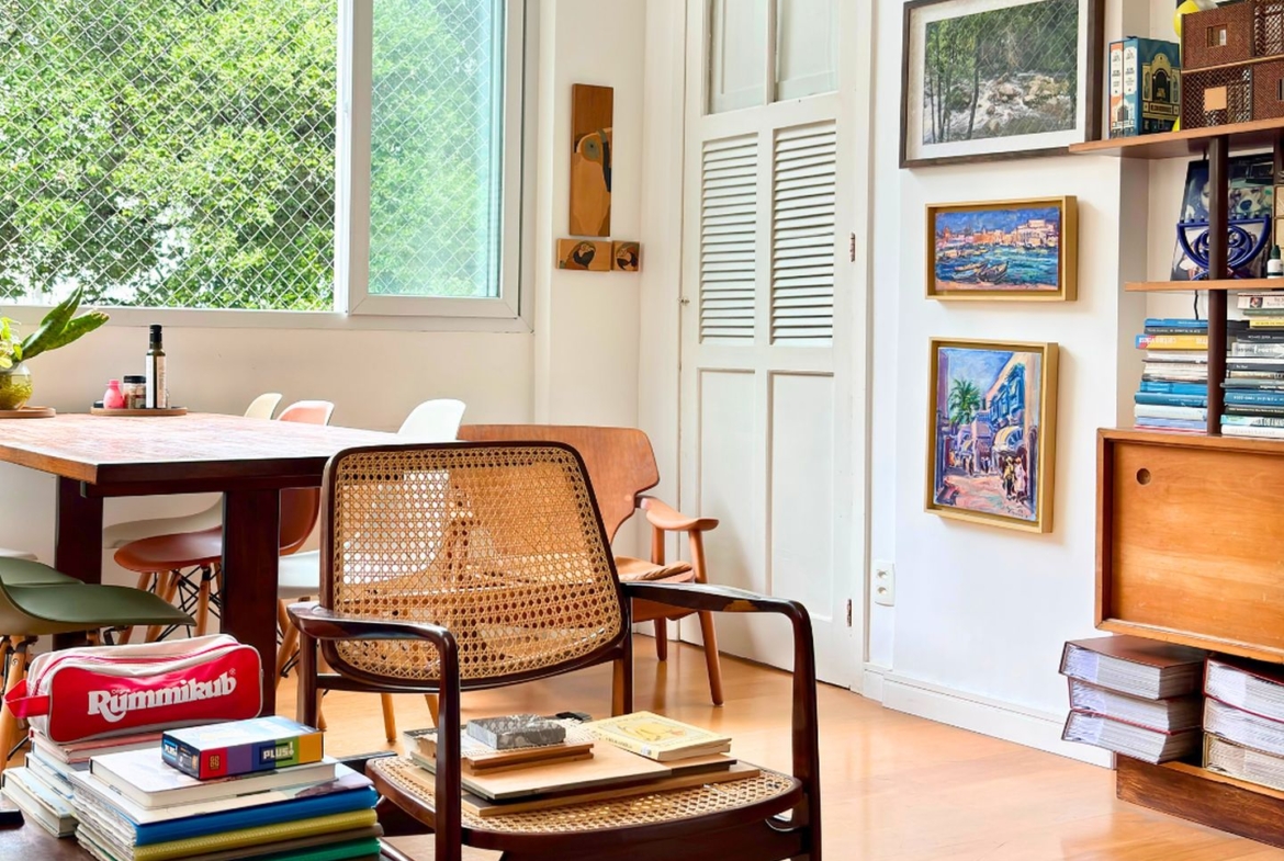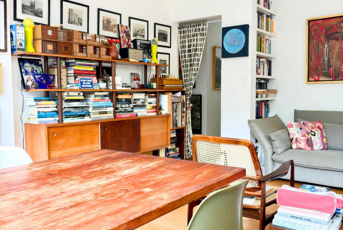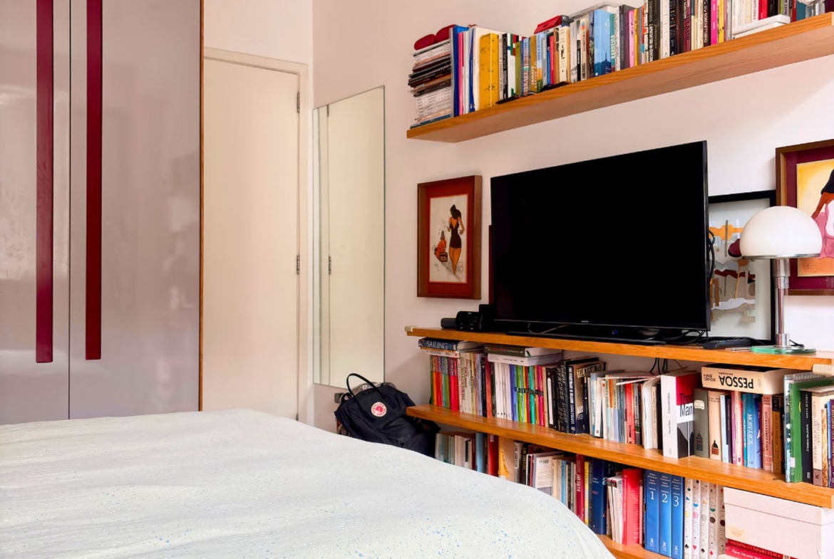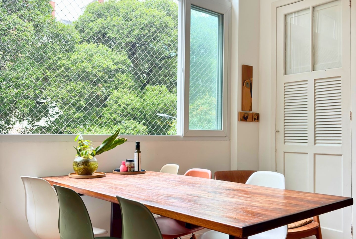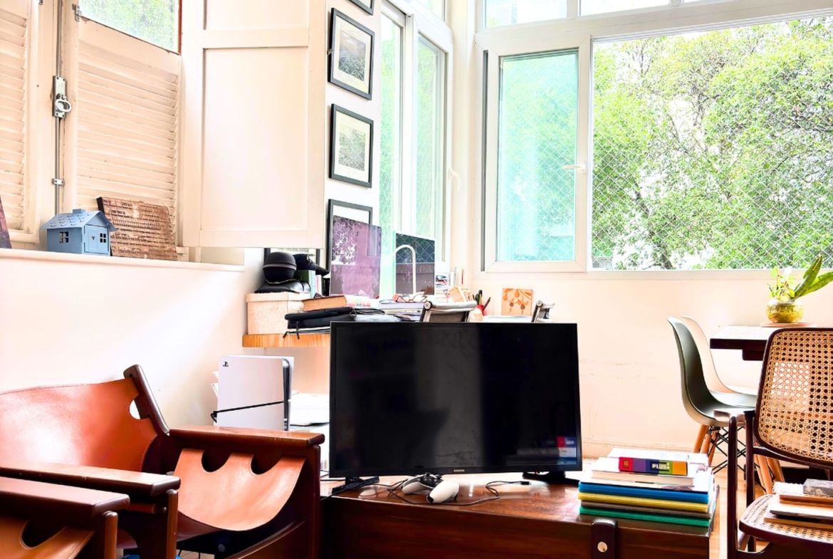 São 89m2 divididos em 3 quartos confortáveis com pé direito alto e muita iluminação e ventilação natural. Reformado em 2017 por arquiteta, o apartamento ganhou um quarto extra, mas que pode ser facilmente revertido. A sala é um ambiente delicioso com vista para a copa das árvores e sol da manhã. O quarto do casal é amplo e arejado, a circulação principal tem uma grande estante e marcenaria desenhada sob medida, com muito espaço para livros e objetos decorativos.