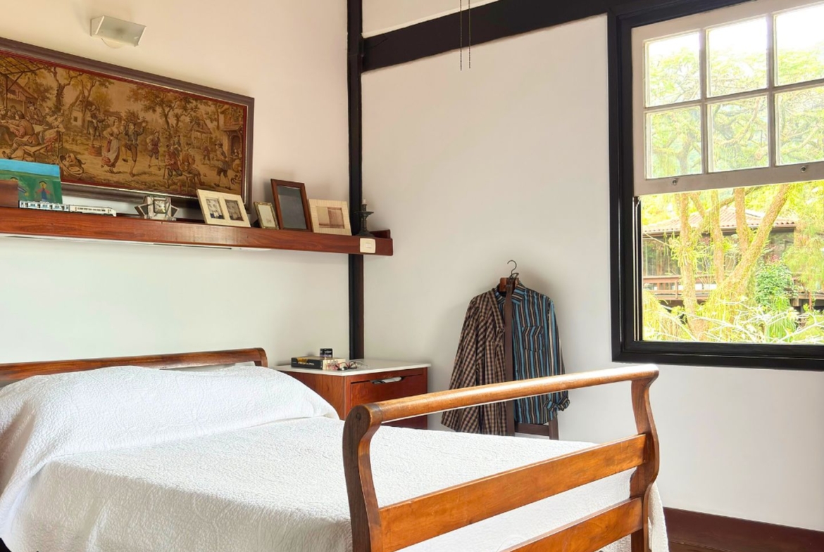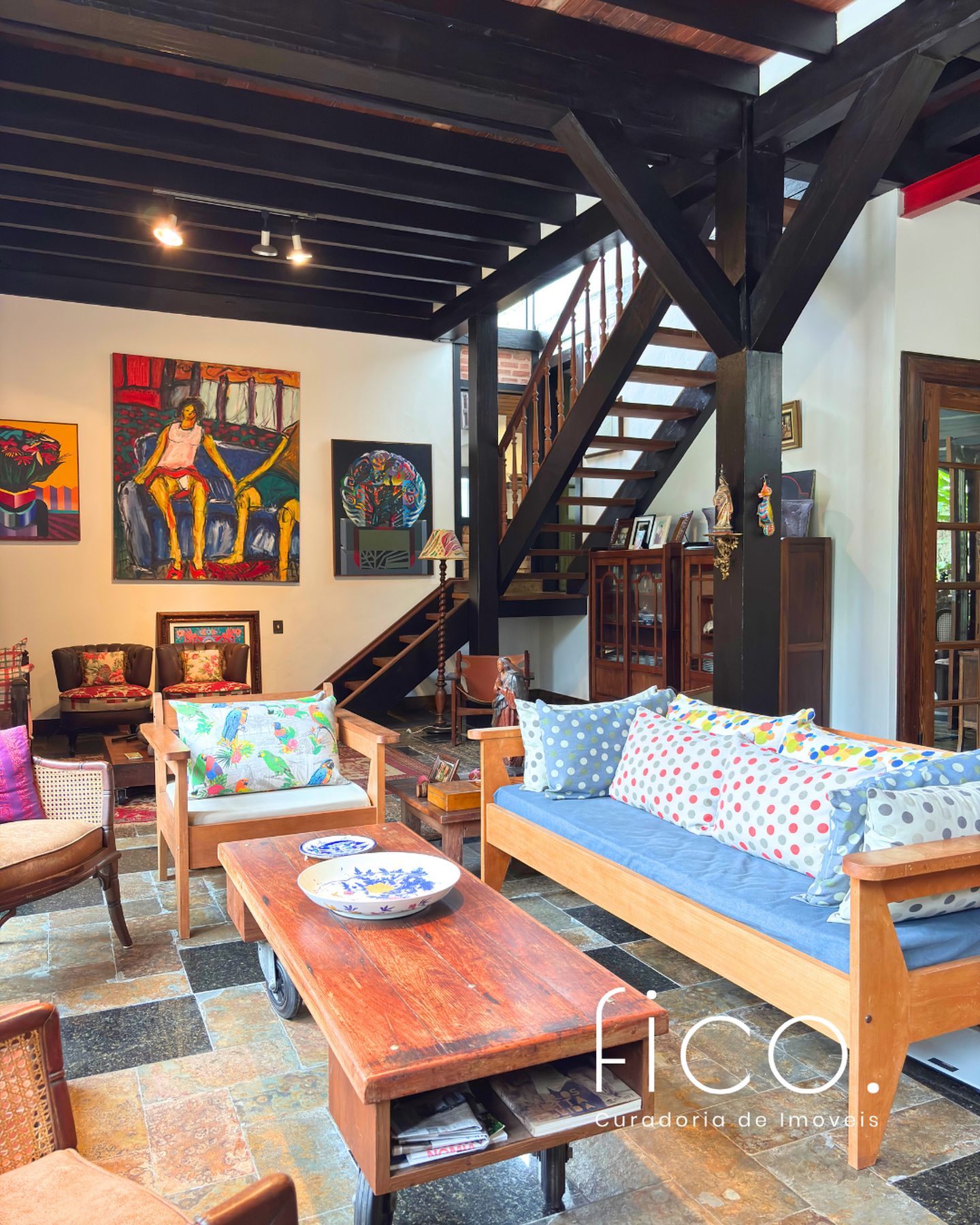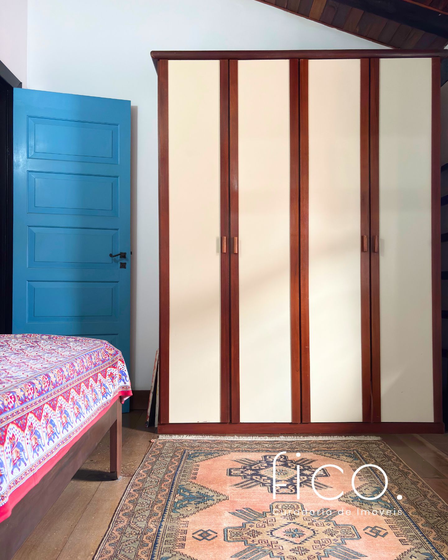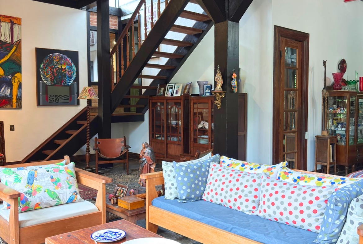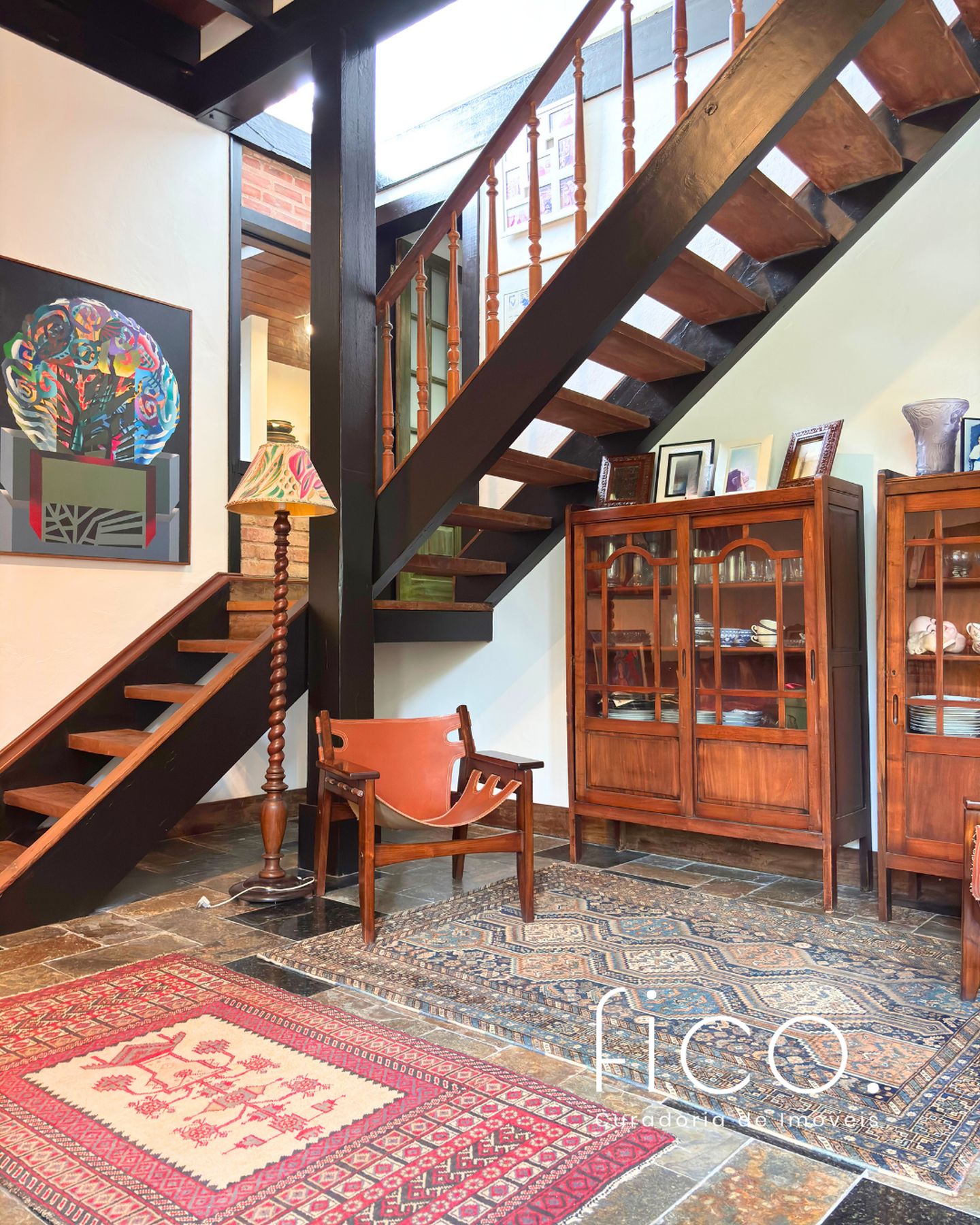 No andar superior fica a área íntima, com quatro quartos, sendo um com escritório e duas suítes com closet. Uma delas tem ainda uma charmosa varanda com vista para o verde. Toda a parte interna com lindo piso em tábuas corridas de Ipê Tabaco.