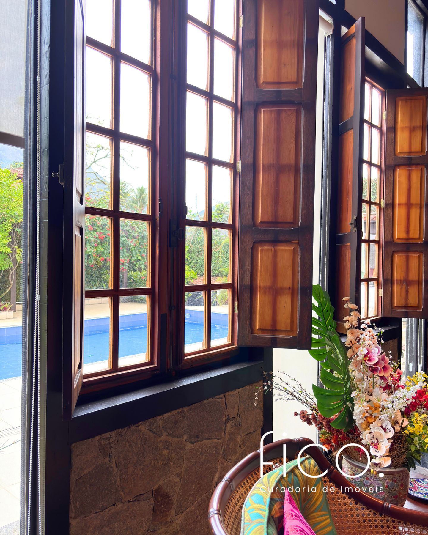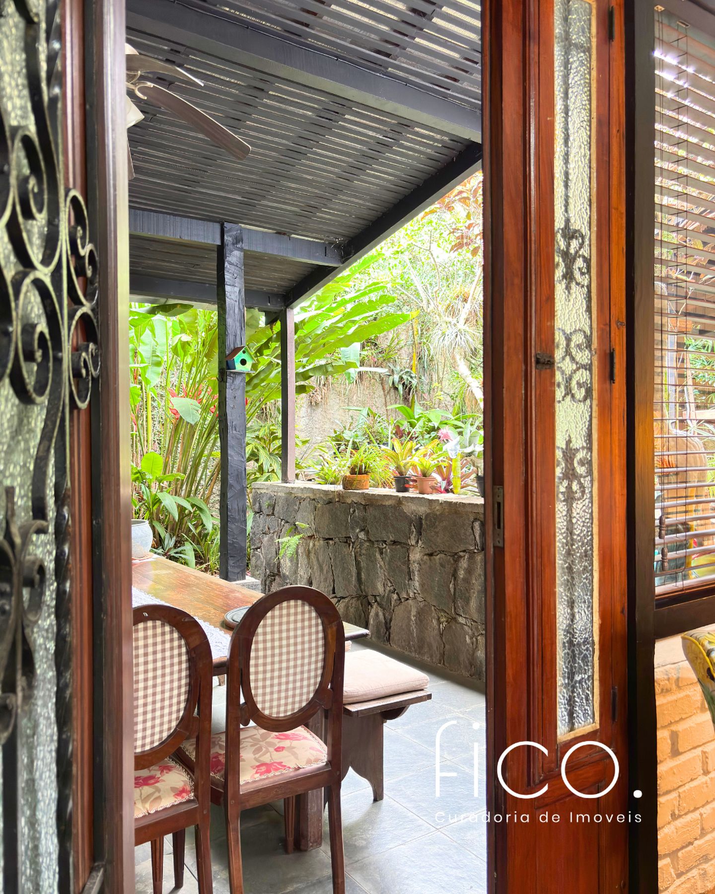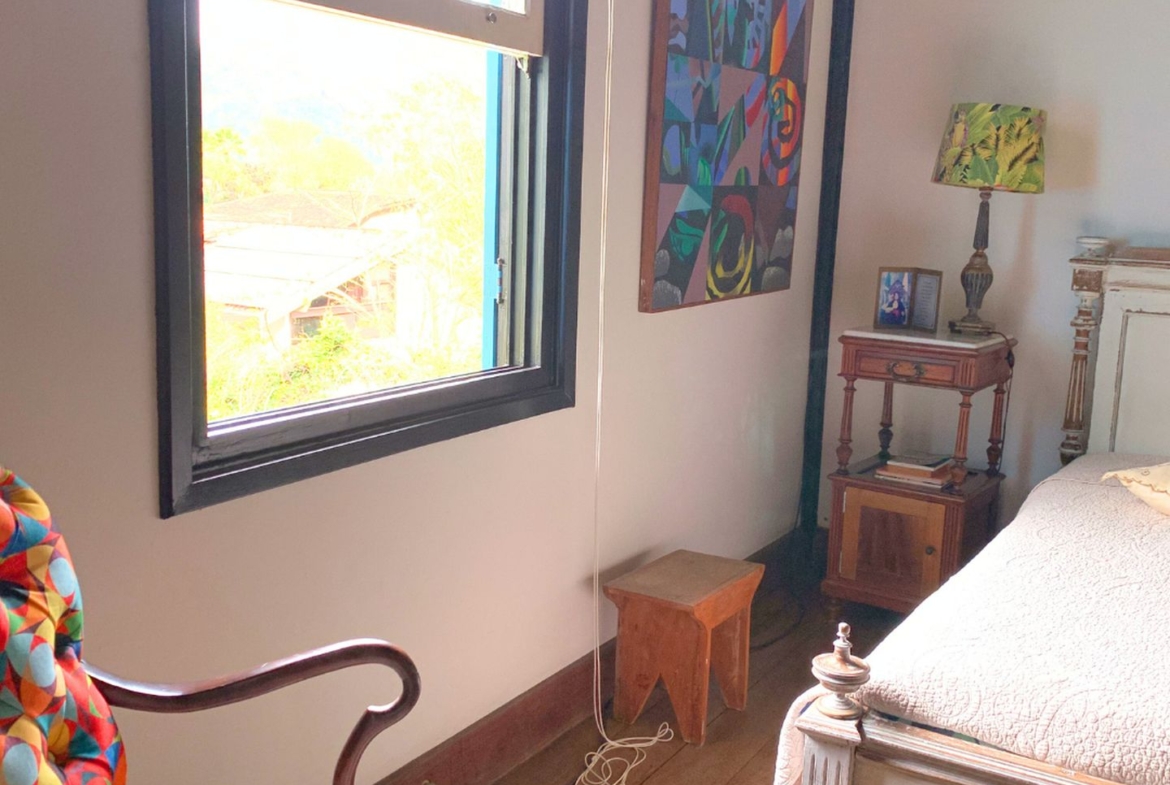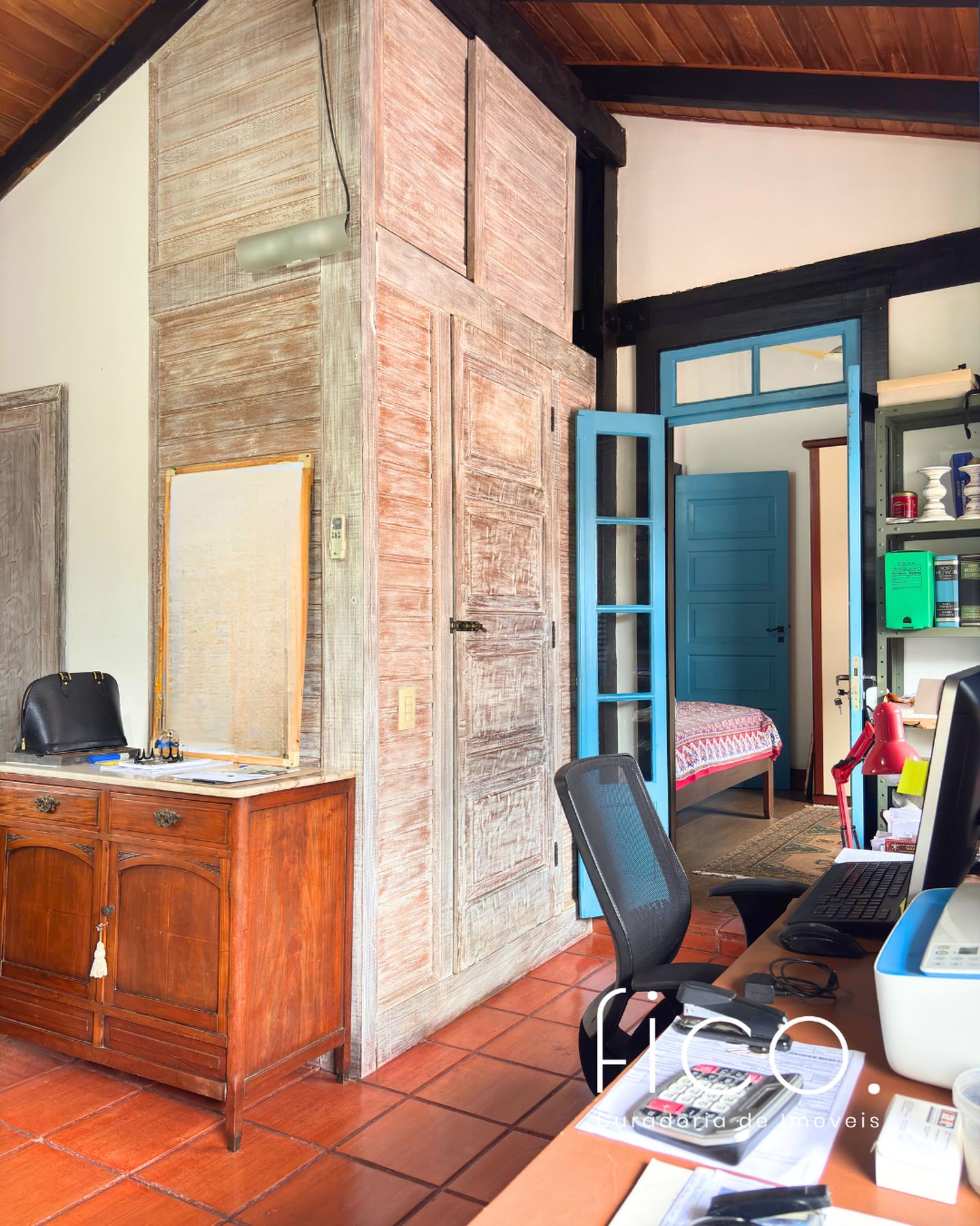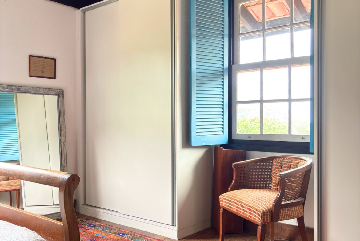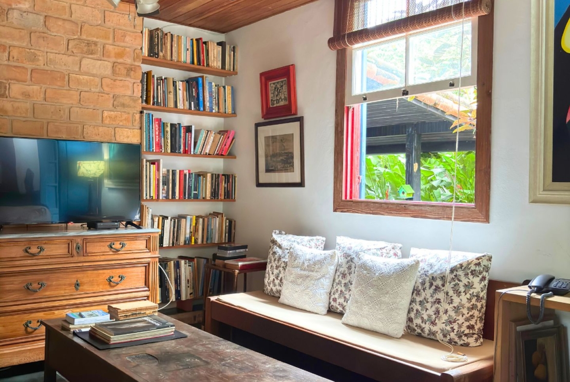 No andar superior fica a área íntima, com quatro quartos, sendo um com escritório e duas suítes com closet. Uma delas tem ainda uma charmosa varanda com vista para o verde. Toda a parte interna com lindo piso em tábuas corridas de Ipê Tabaco.