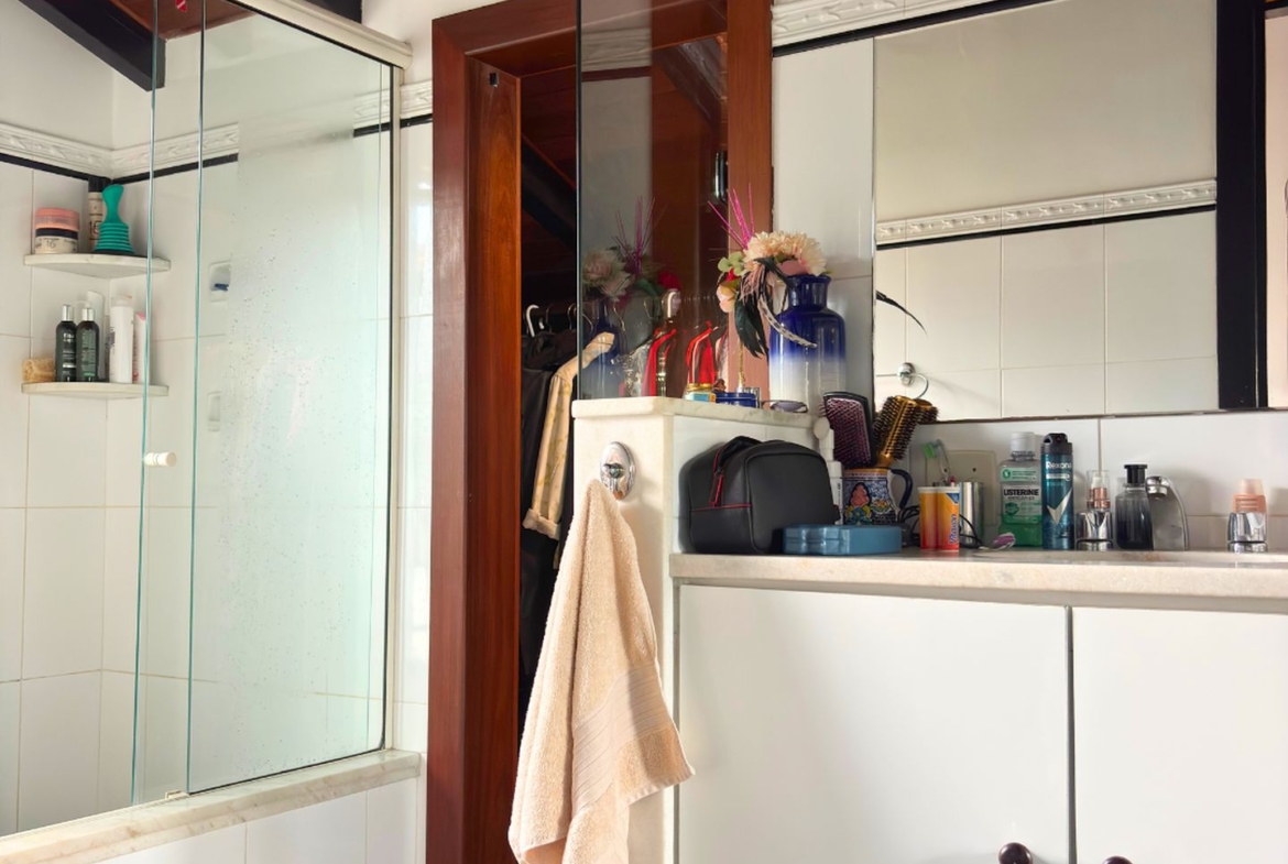 A área externa conta com churrasqueira, piscina, sauna, lavabo e vagas para cinco carros, sendo duas cobertas.