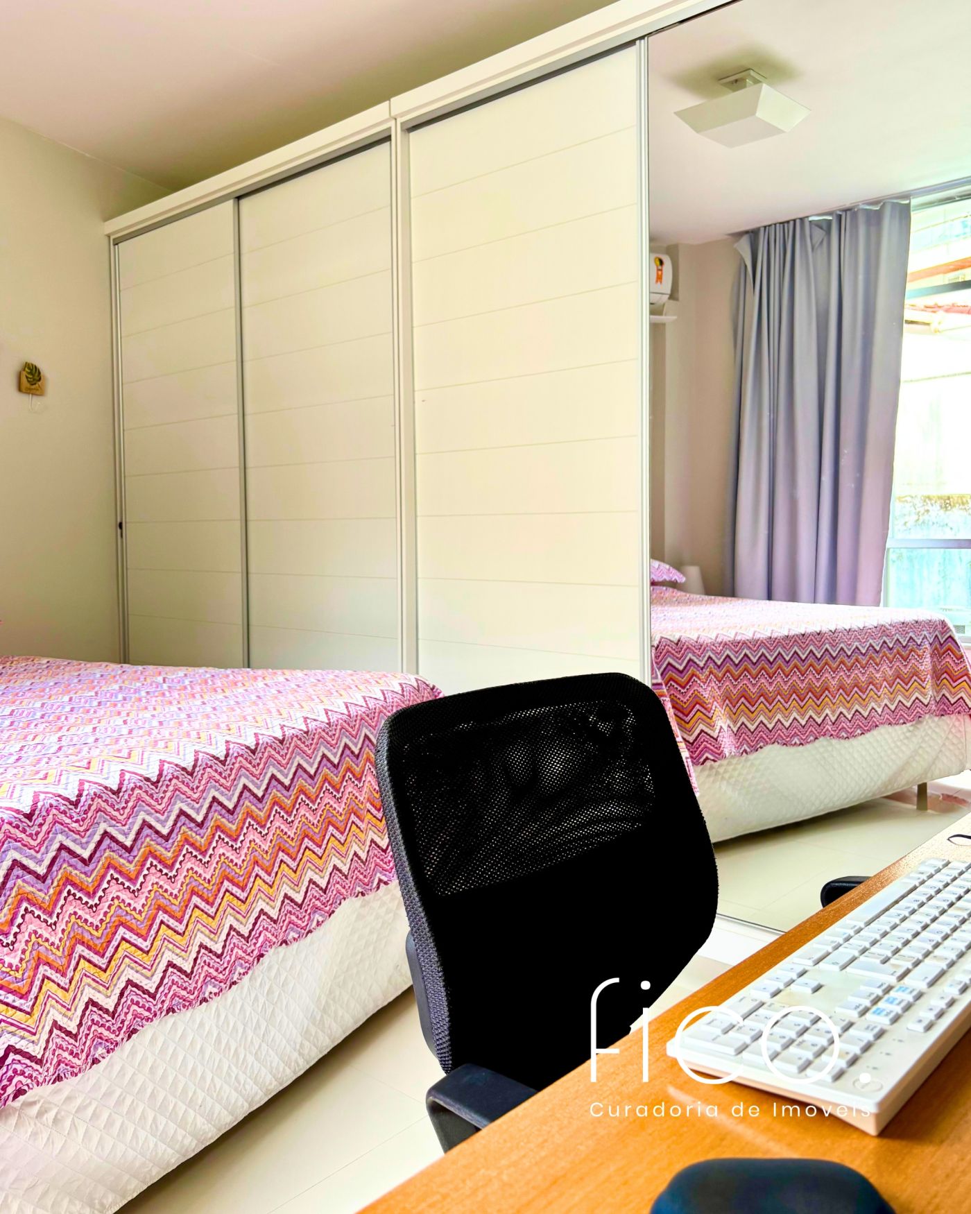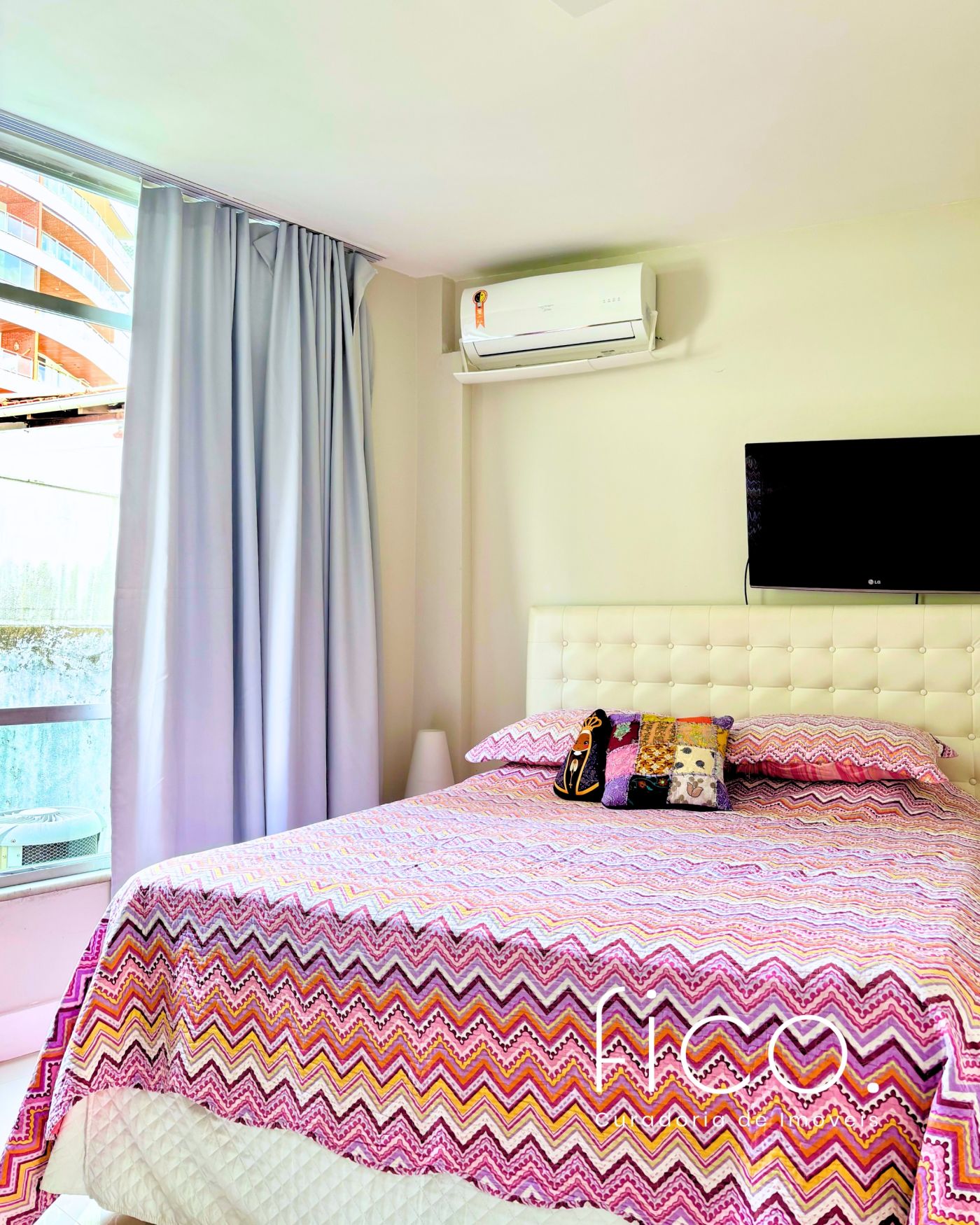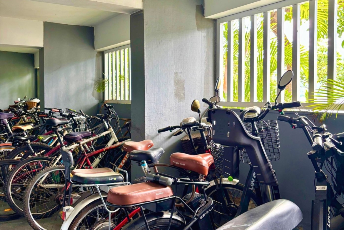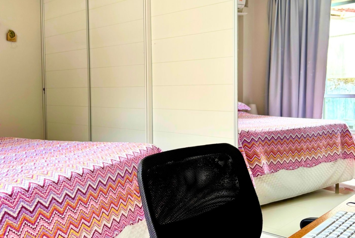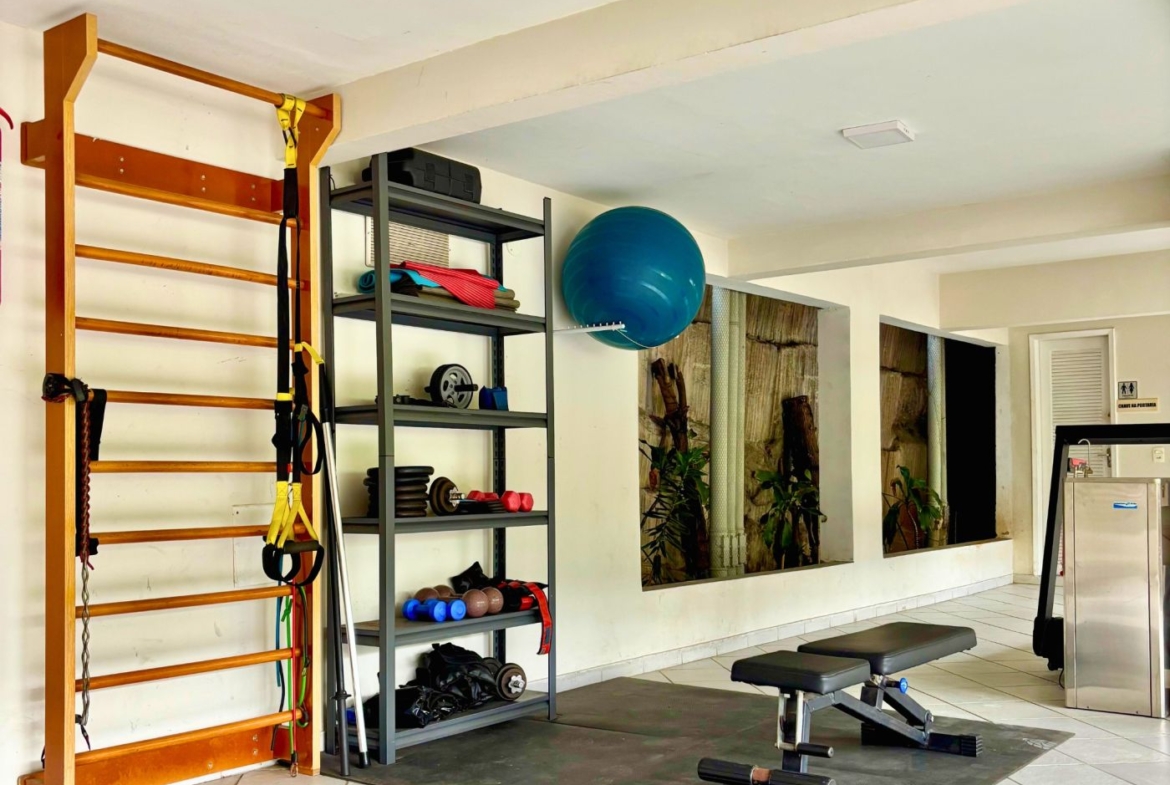 Possui ar condicionado tipo split em todos os cômodos, vaga de garagem coberta, livre, marcada e escriturada, e o prédio oferece portaria 24h, bicicletário e uma pequena sala de ginástica.