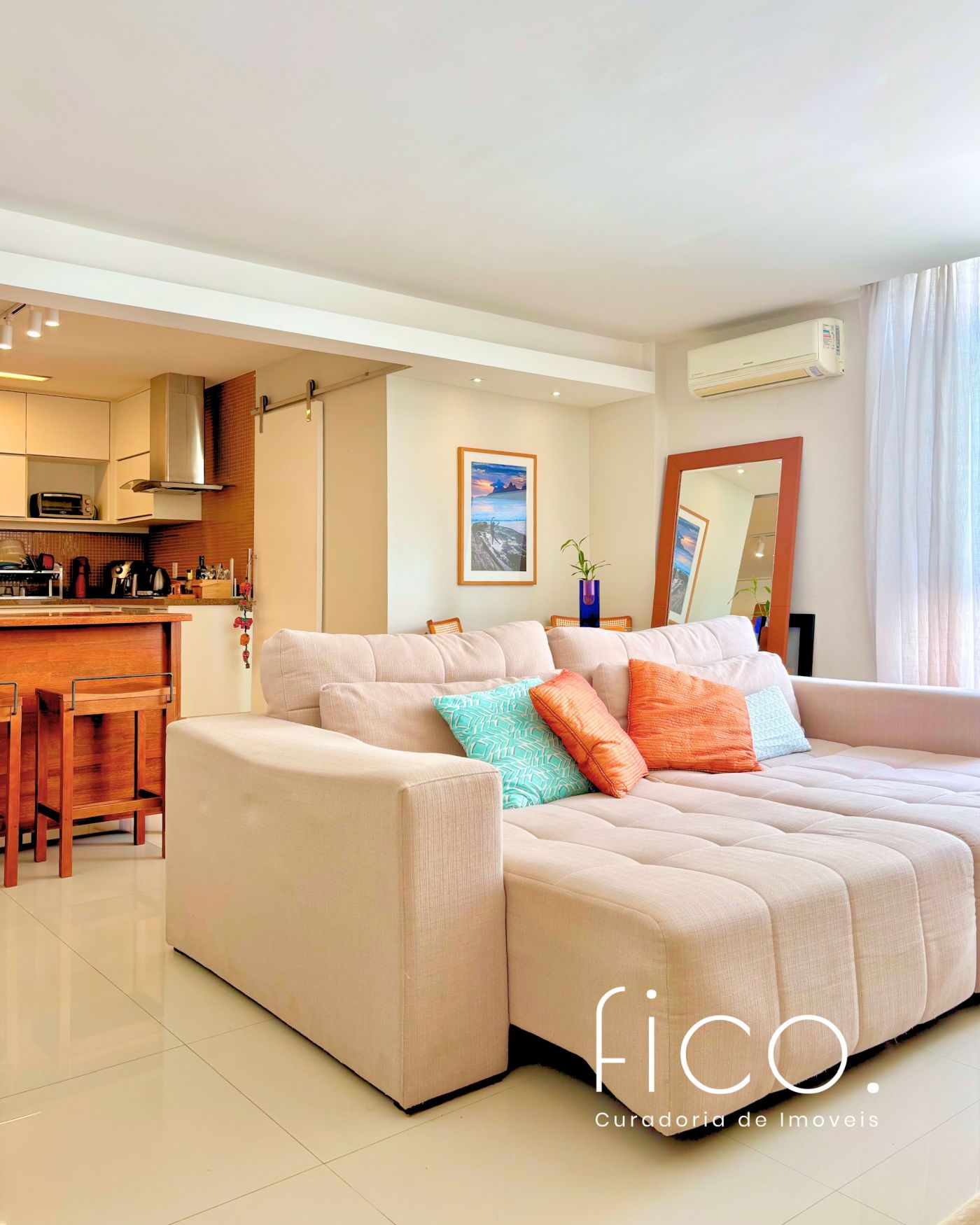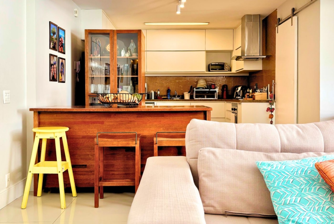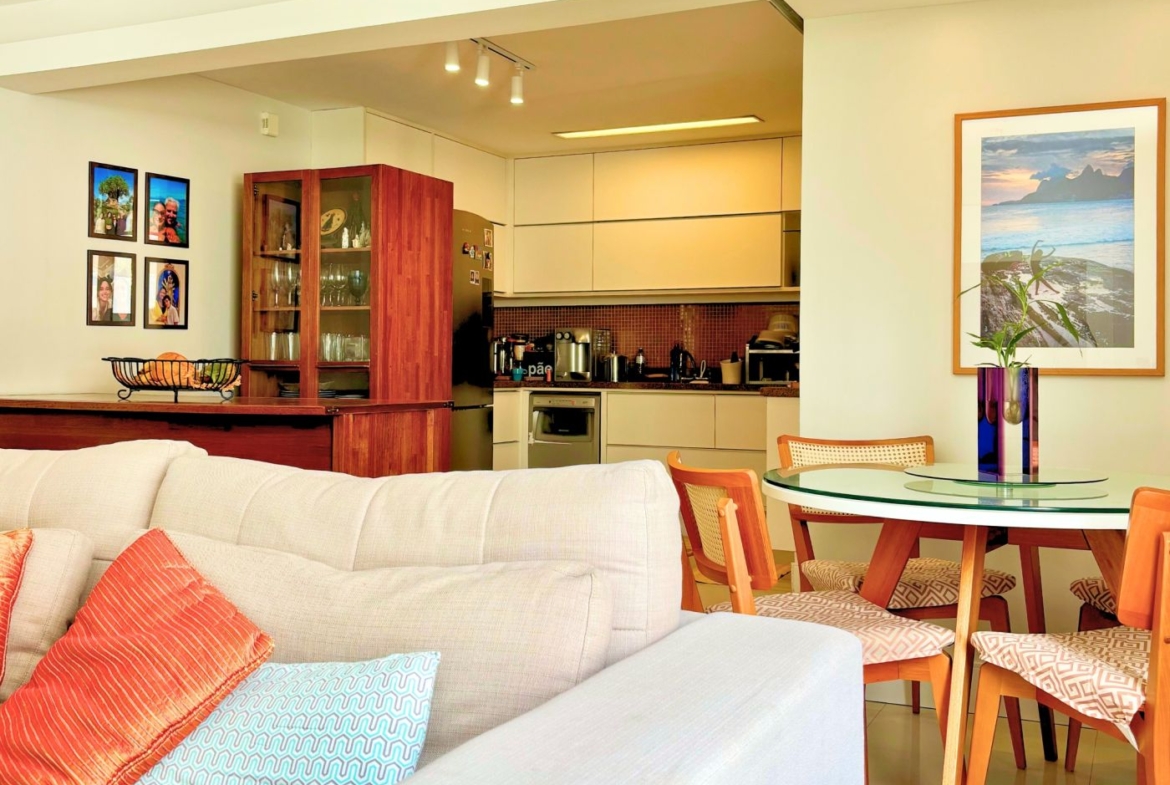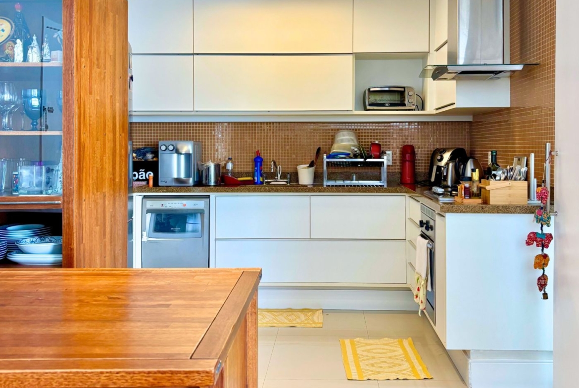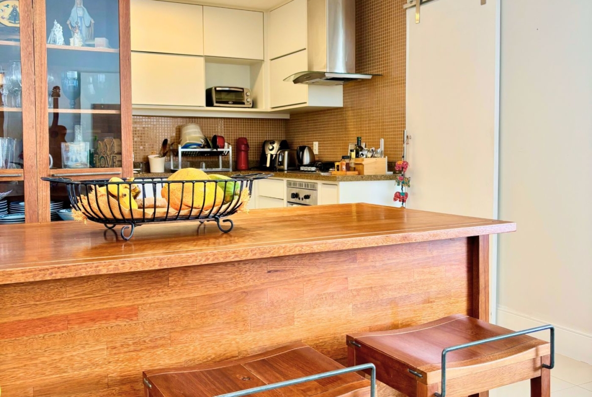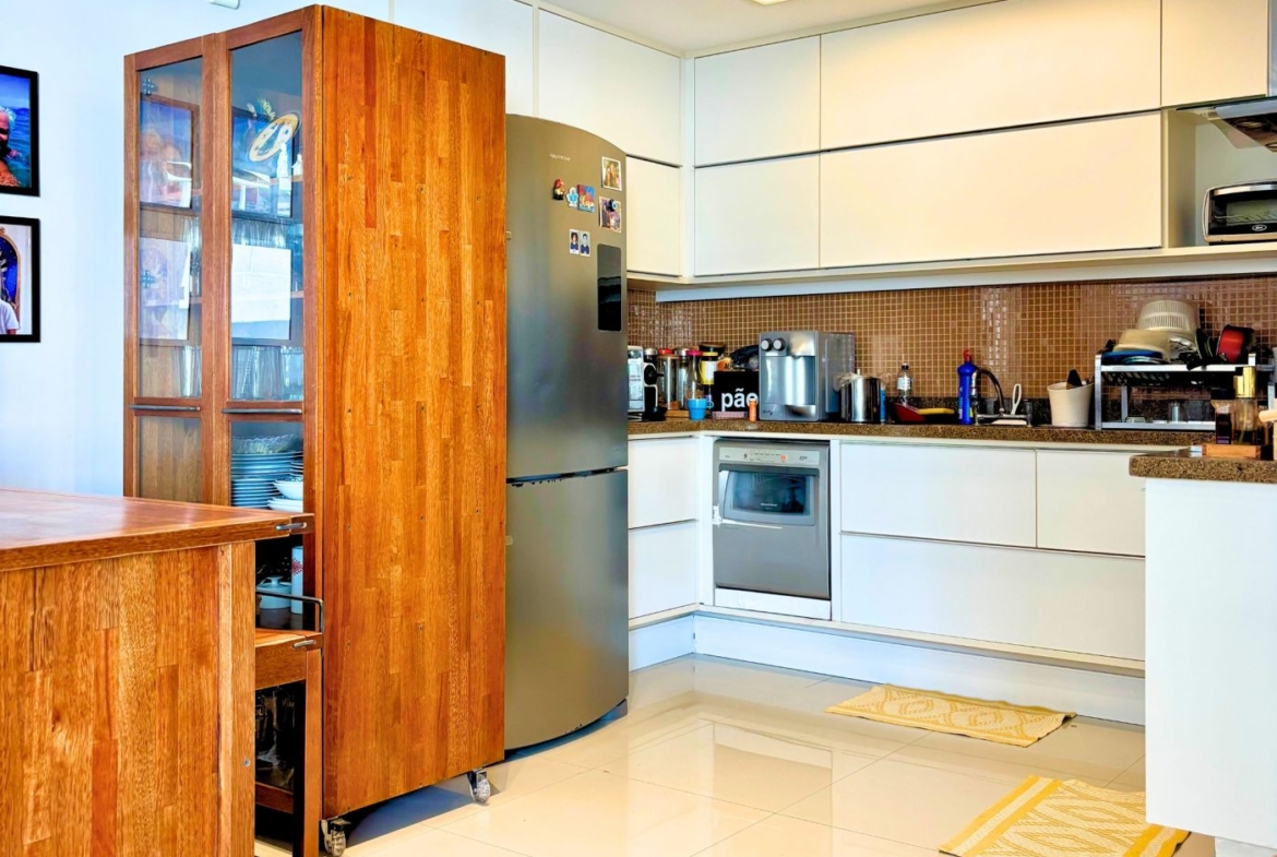 São três quartos, sendo duas suítes e mais um banheiro social. A cozinha é um charme! Foi integrada à sala, criando um ambiente amplo e moderno. Está toda equipada com cooktop, forno embutido, geladeira, coifa e máquina de lavar louça.  O apartamento conta ainda com área e banheiro de serviço.