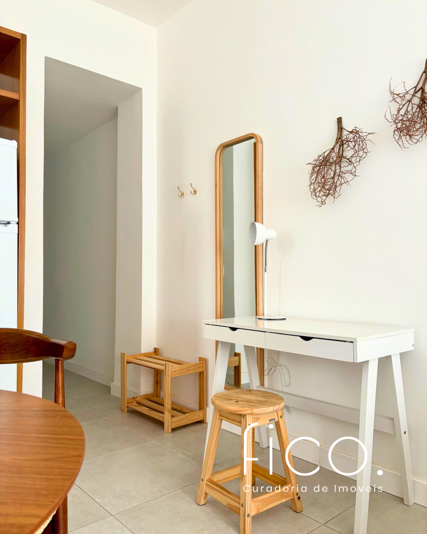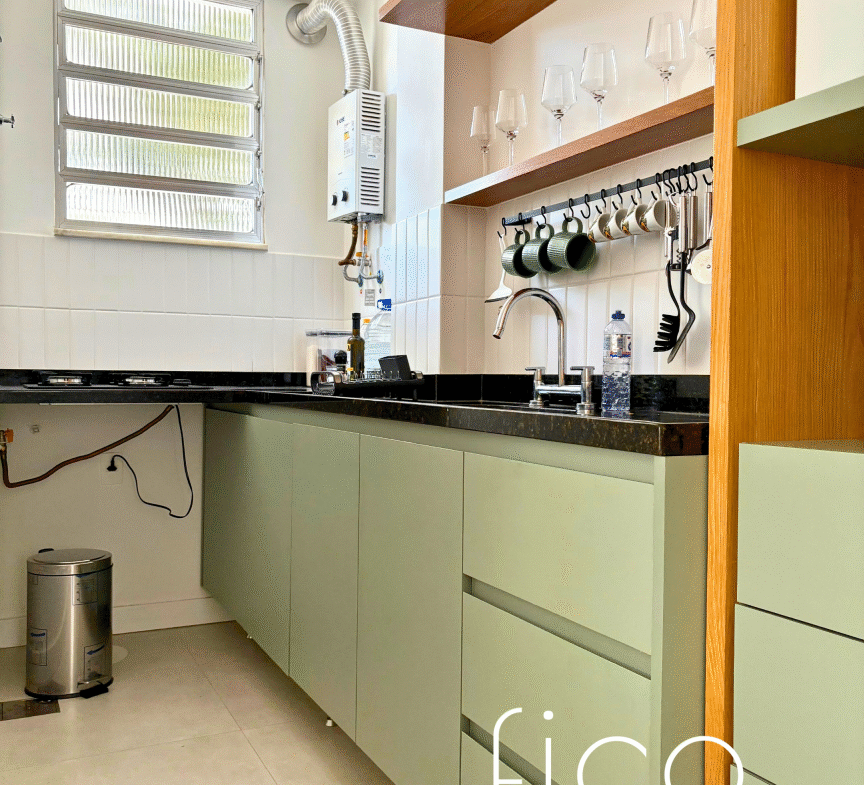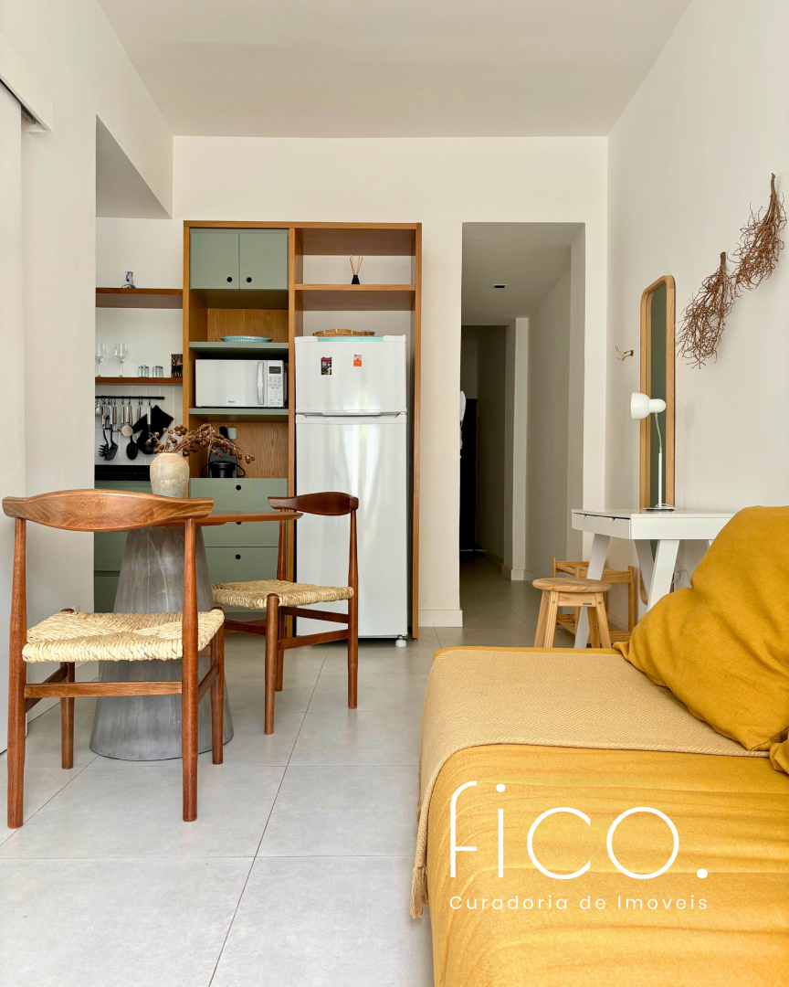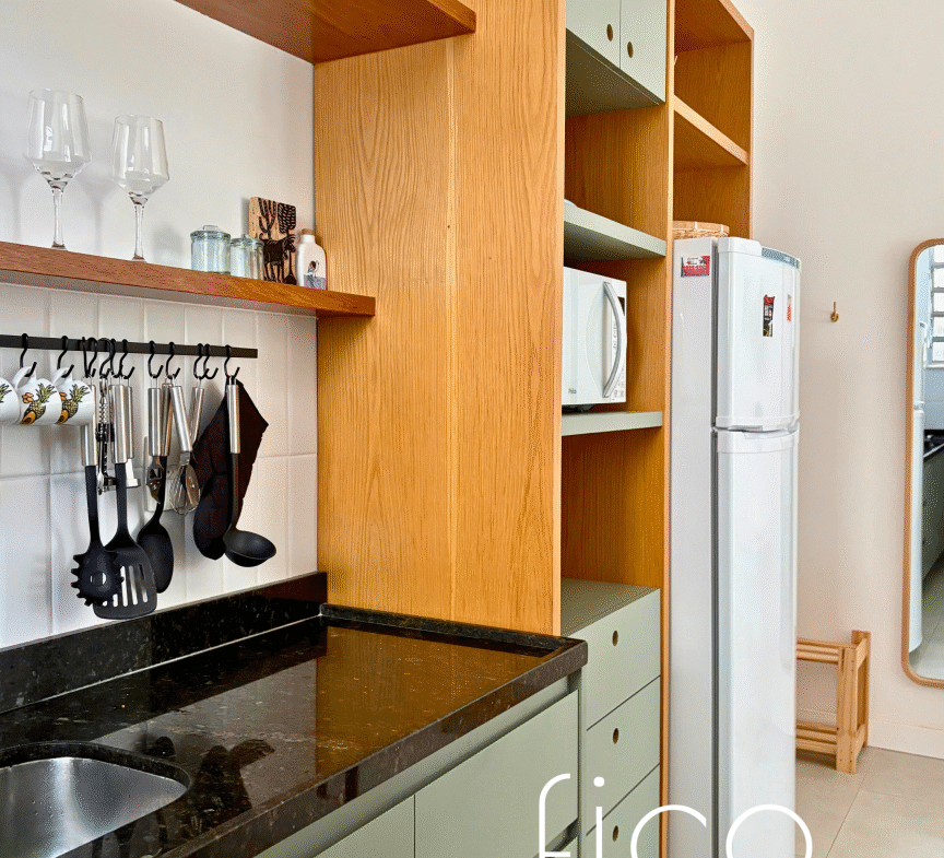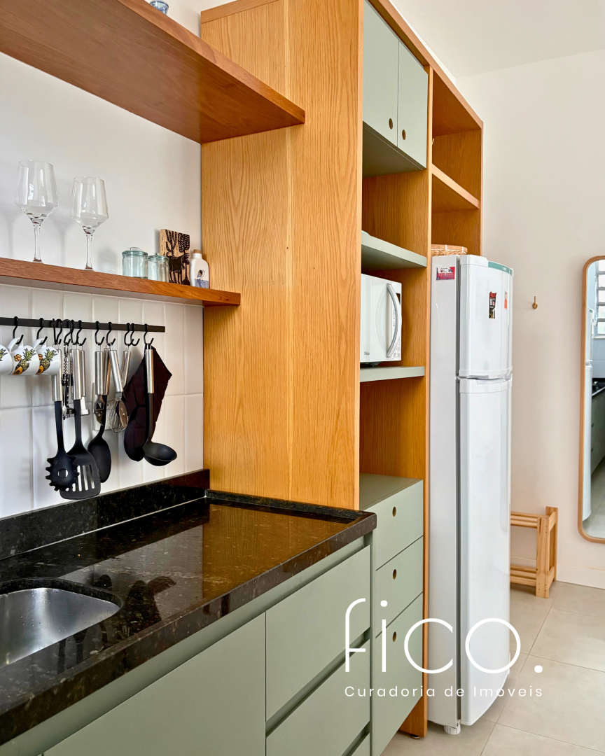 Possui marcenaria planejada na cozinha e banheiro, revestimentos e mobiliário de muito bom gosto, além de estar equipado com dois aparelhos de ar condicionado tipo split, geladeira, cooktop e microondas.
