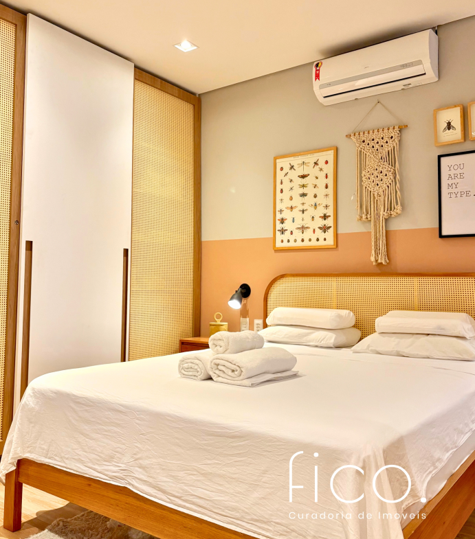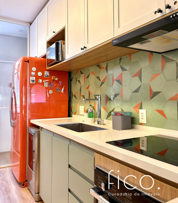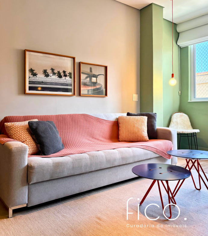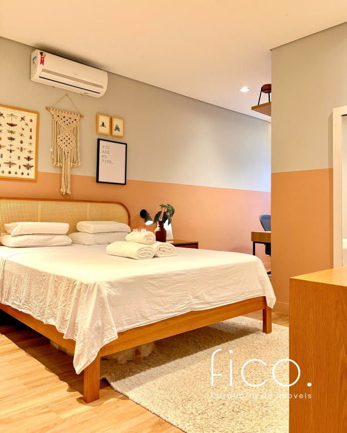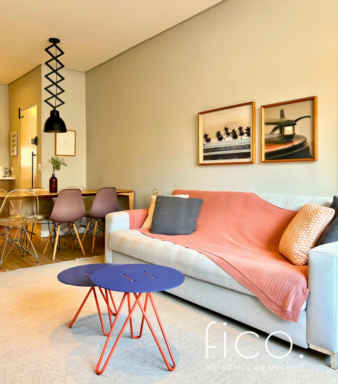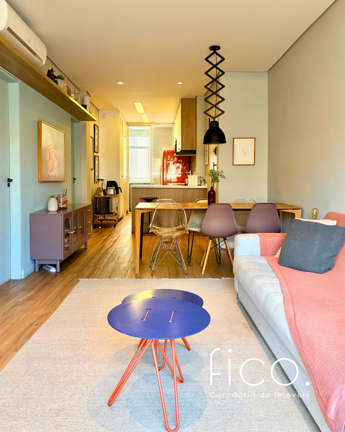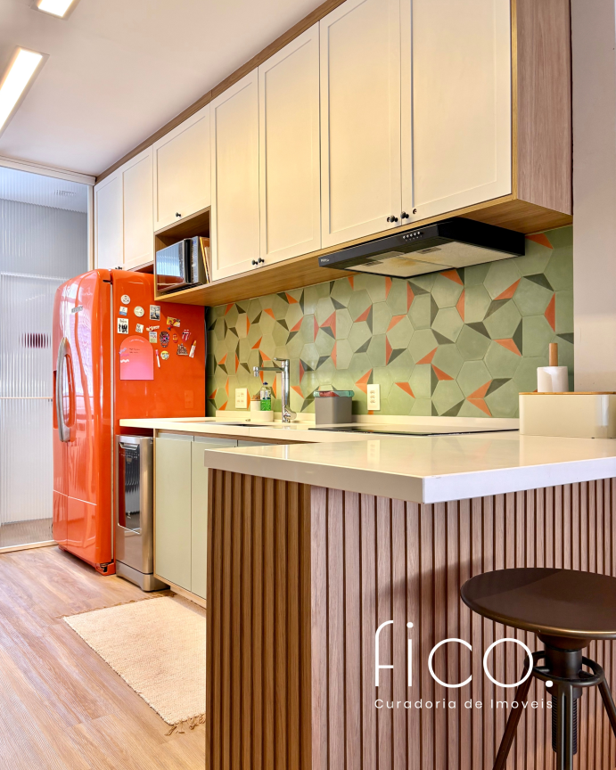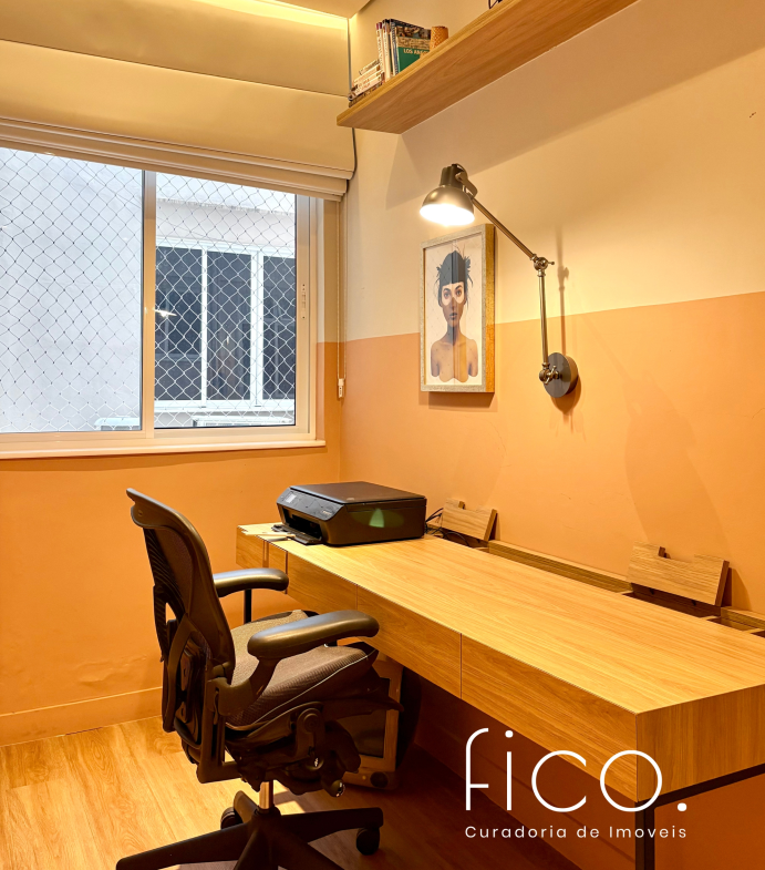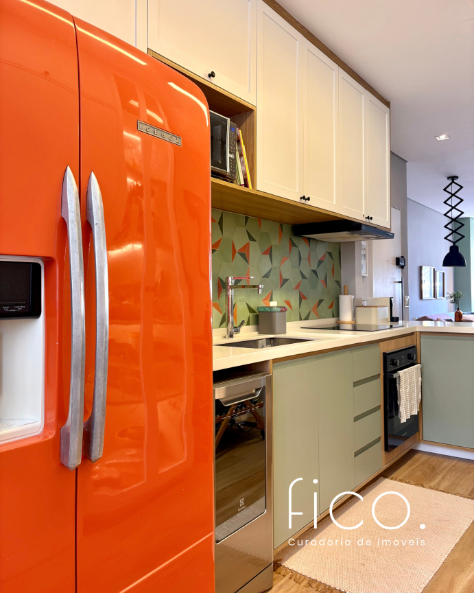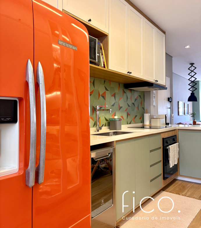 São dois quartos, sendo uma suíte com escritório. O segudo quarto tem acesso direto ao banheiro social, funcionando também como suíte. A cozinha, toda equipada, é integrada à sala. Aqui vale dar um destaque especial à geladeira retrô, que foi feita sob encomenda e ficará no imóvel!