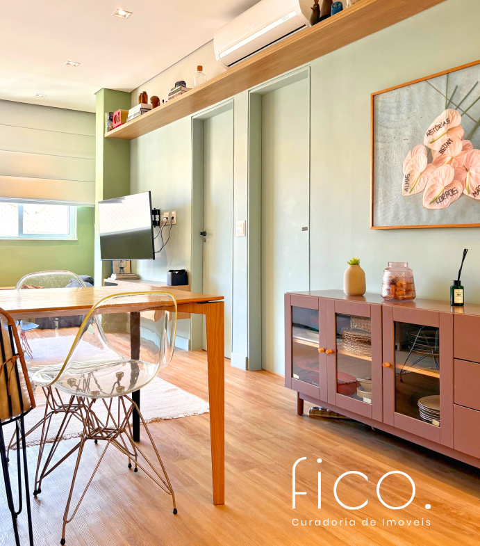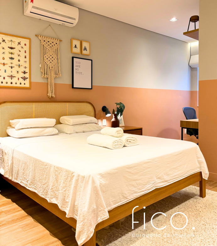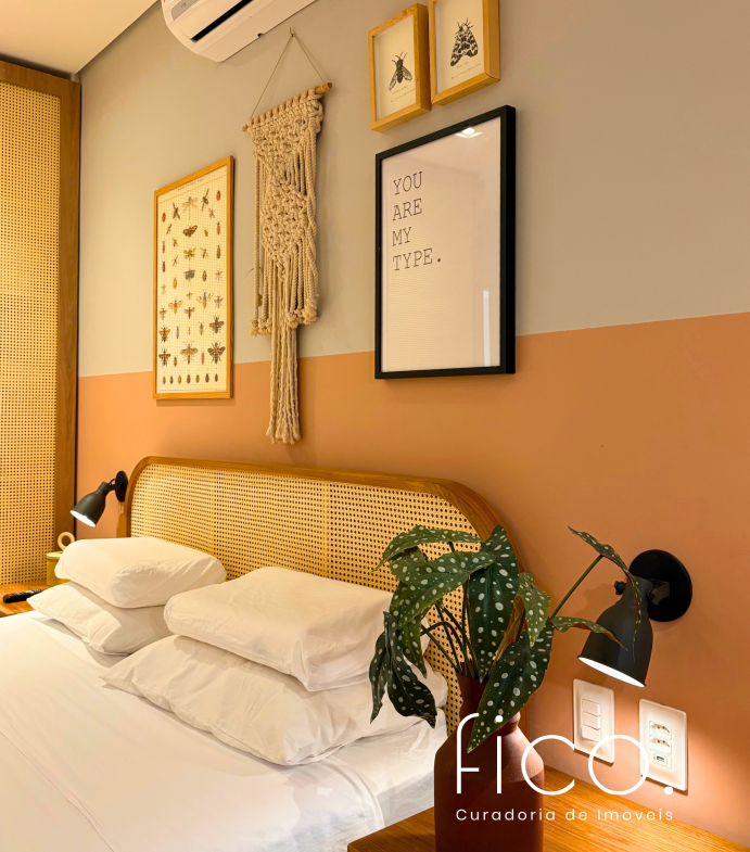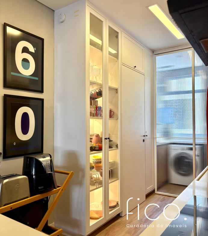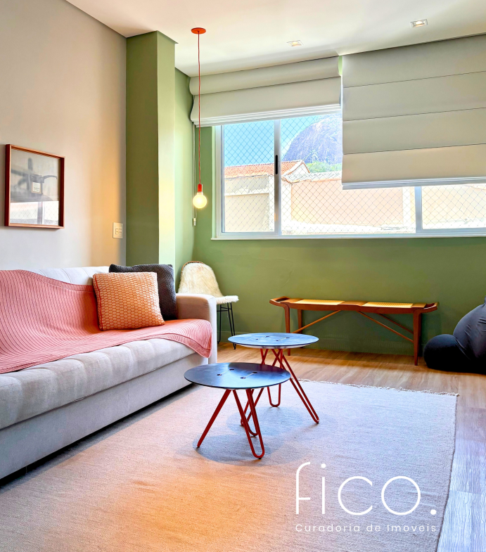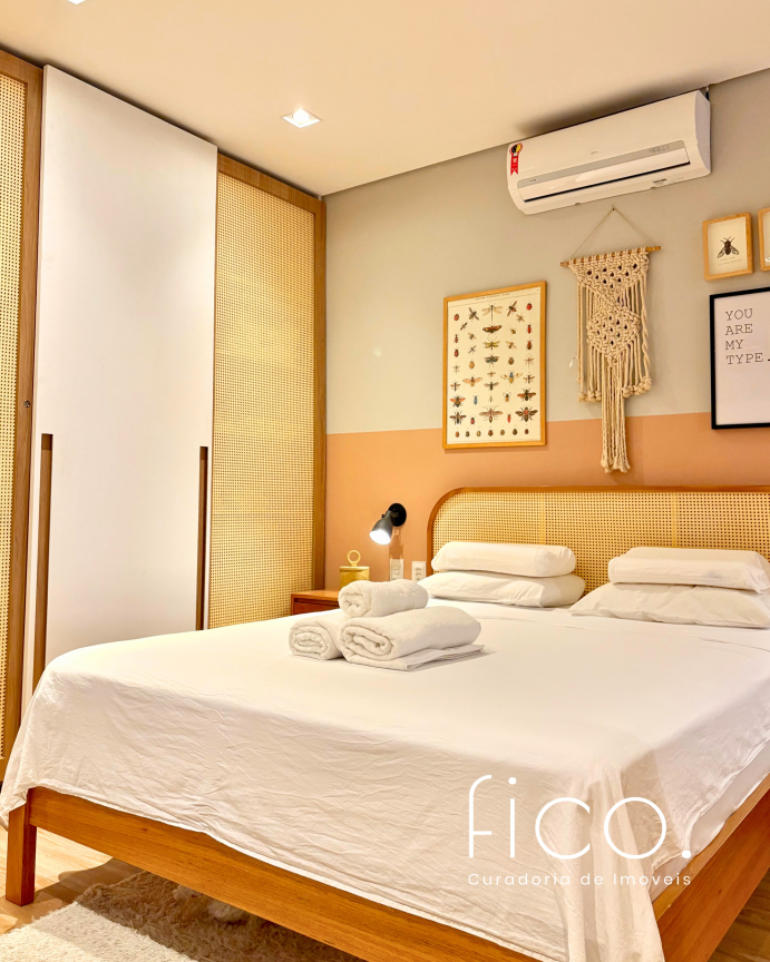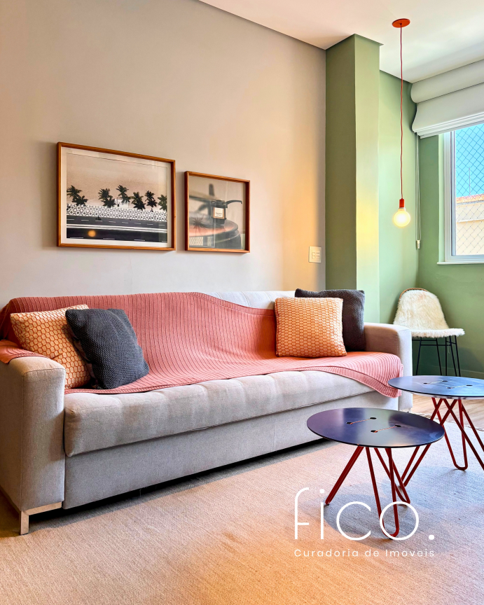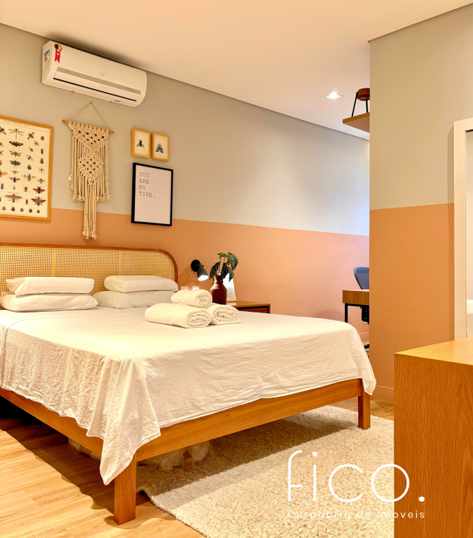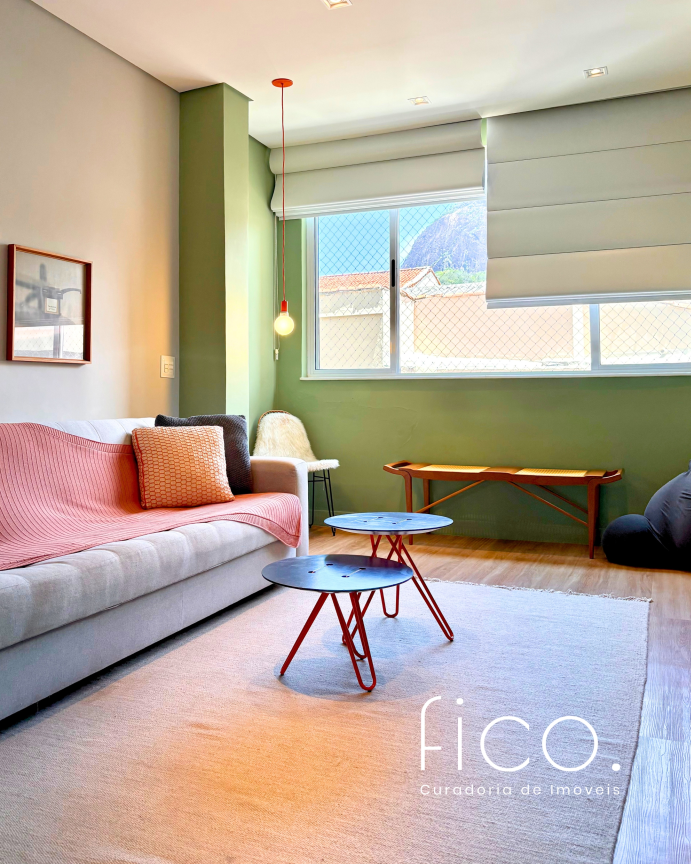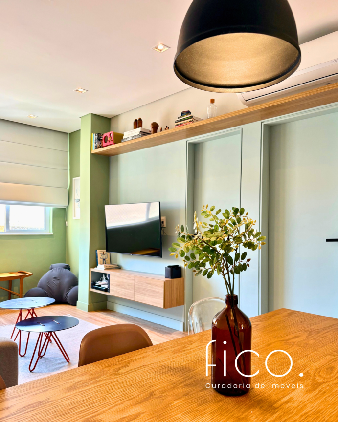 São dois quartos, sendo uma suíte com escritório. O segudo quarto tem acesso direto ao banheiro social, funcionando também como suíte. A cozinha, toda equipada, é integrada à sala. Aqui vale dar um destaque especial à geladeira retrô, que foi feita sob encomenda e ficará no imóvel!