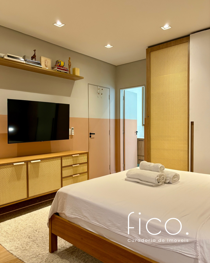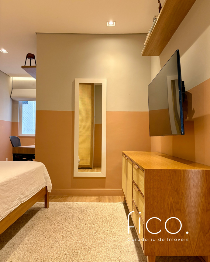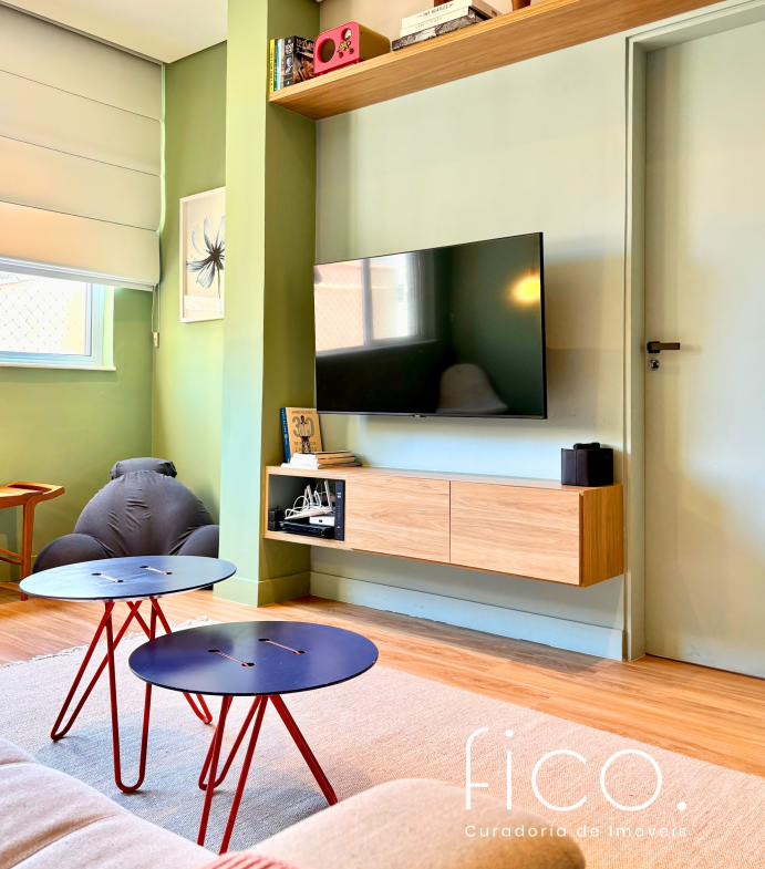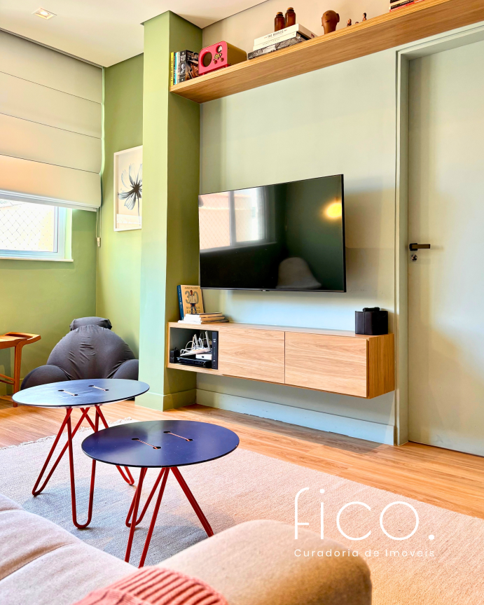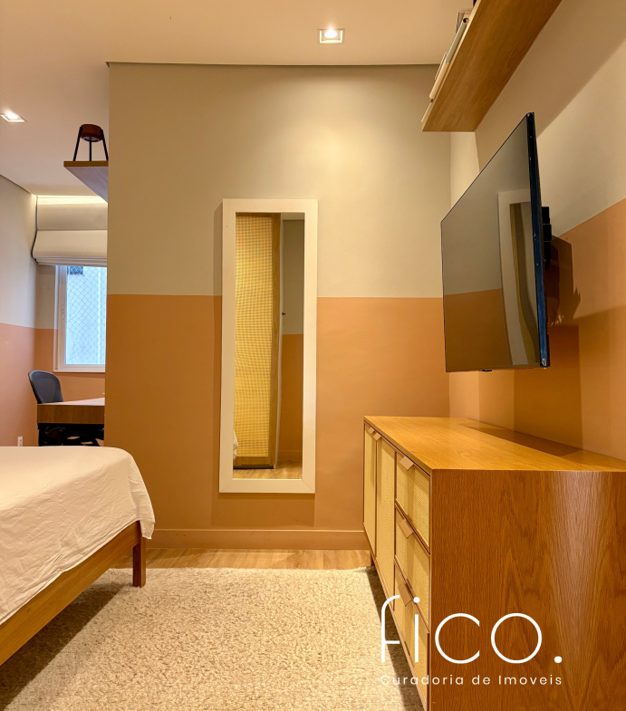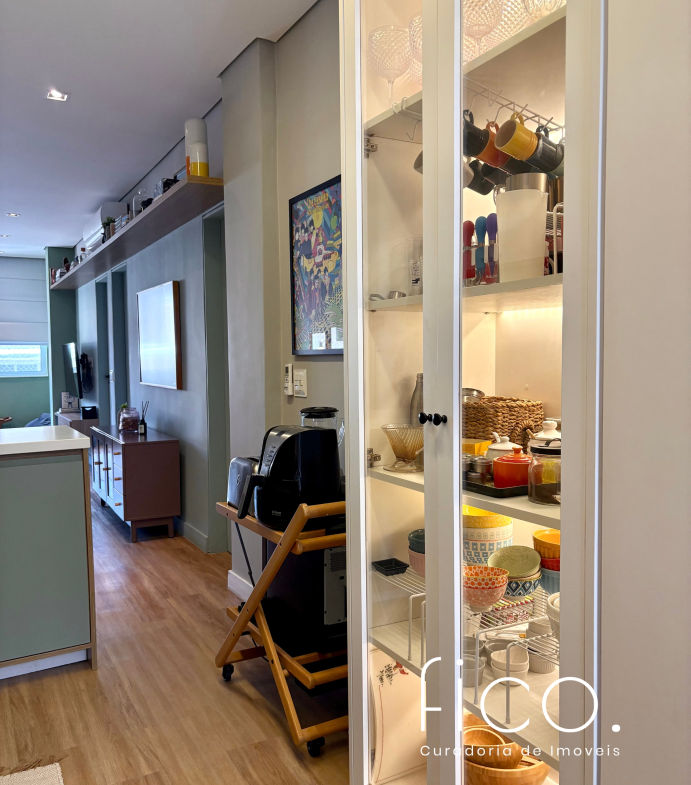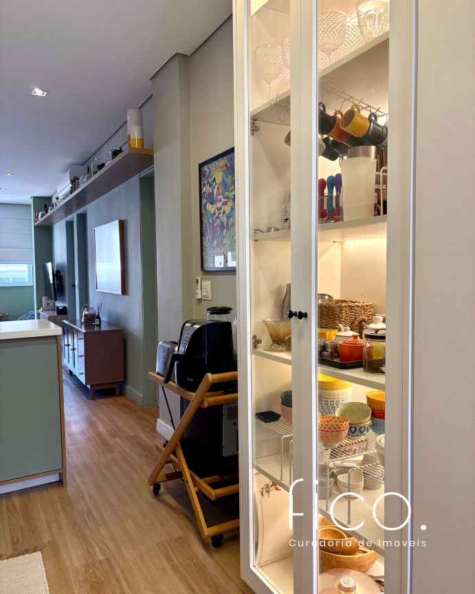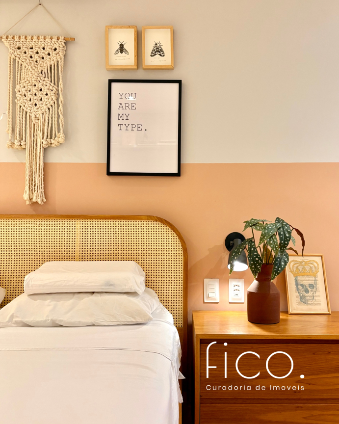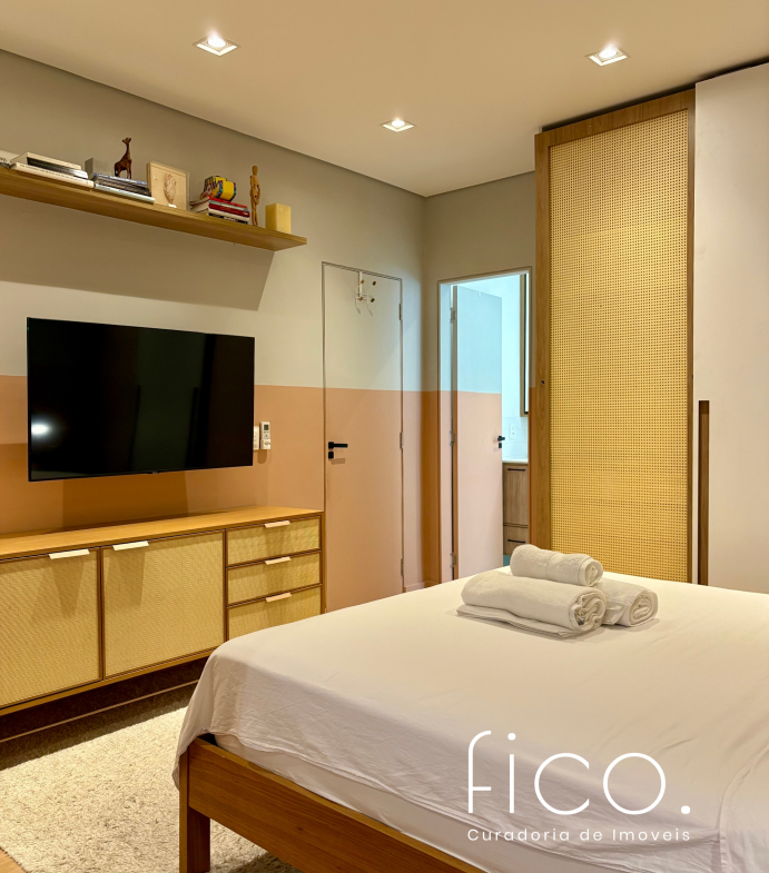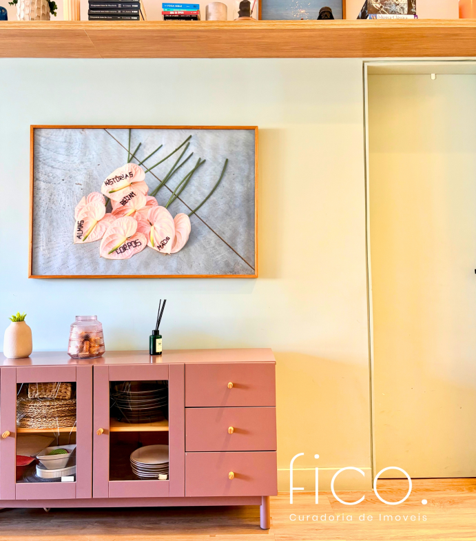 São dois quartos, sendo uma suíte com escritório. O segudo quarto tem acesso direto ao banheiro social, funcionando também como suíte. A cozinha, toda equipada, é integrada à sala. Aqui vale dar um destaque especial à geladeira retrô, que foi feita sob encomenda e ficará no imóvel!