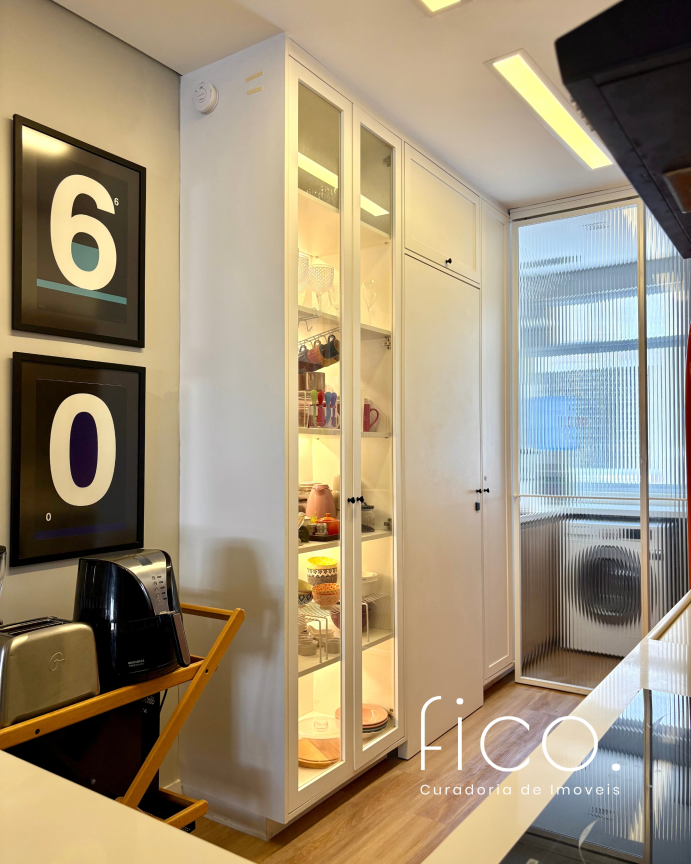 Um painel de vidro canelado, com porta de correr e muito charmoso, divide a área social da lavanderia, deixando o espaço sempre organizado e iluminado, além de promover excelente ventilação cruzada.