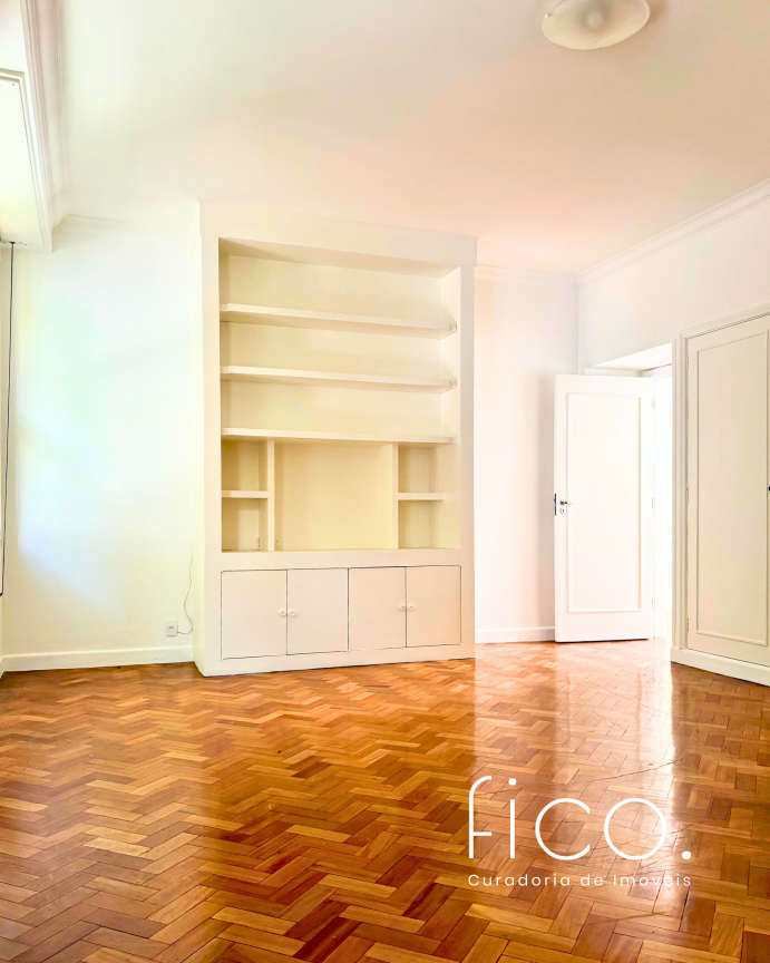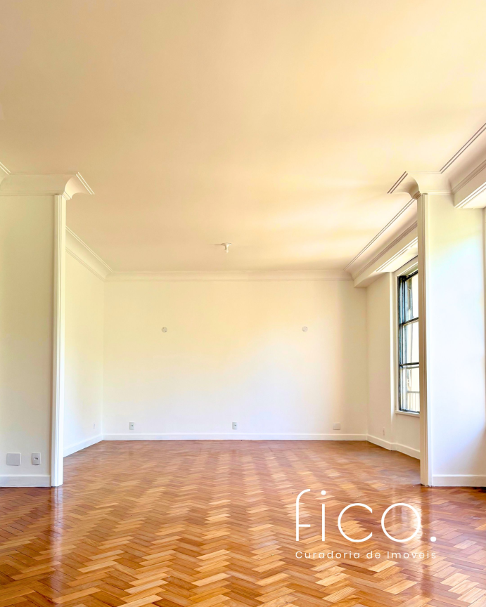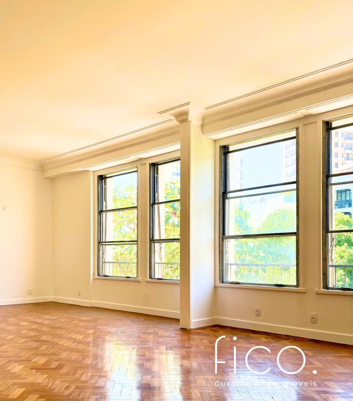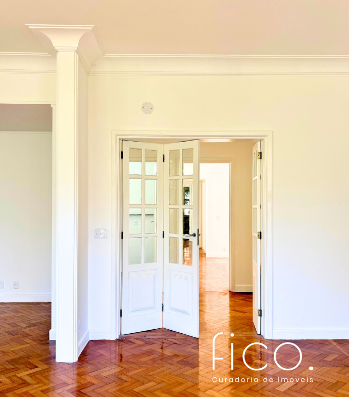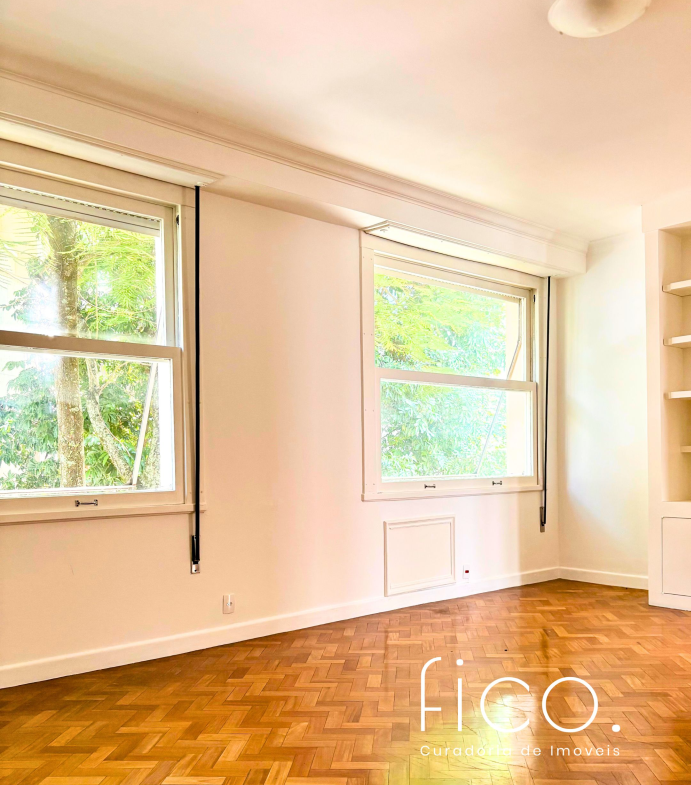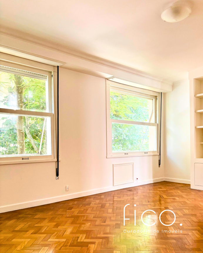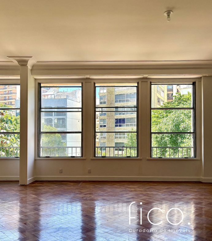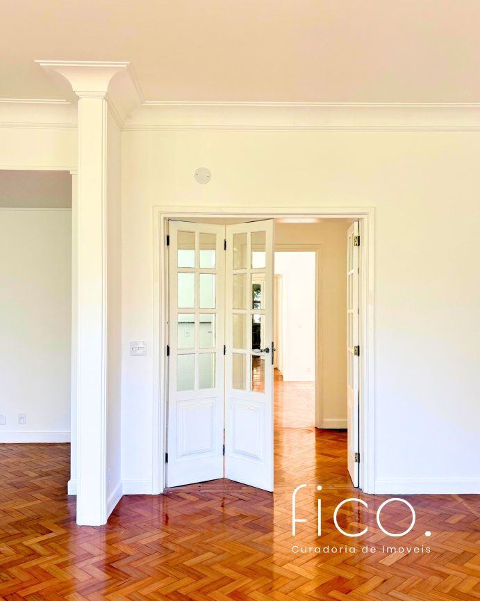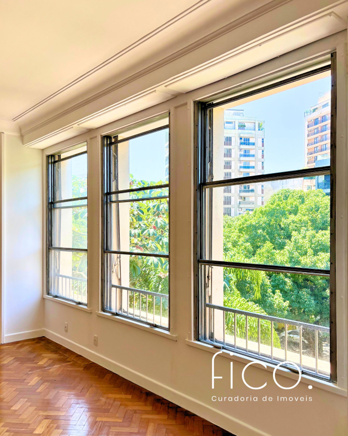 São 221m² com salão amplo e iluminado, vista para a copa das árvores e uma sala íntima no acesso aos quartos — uma ótima opção para escritório ou cantinho mais reservado para a família. Atualmente com dois quartos e dois banheiros sociais, o apartamento tem potencial para virar três quartos, com possibilidade de suíte.